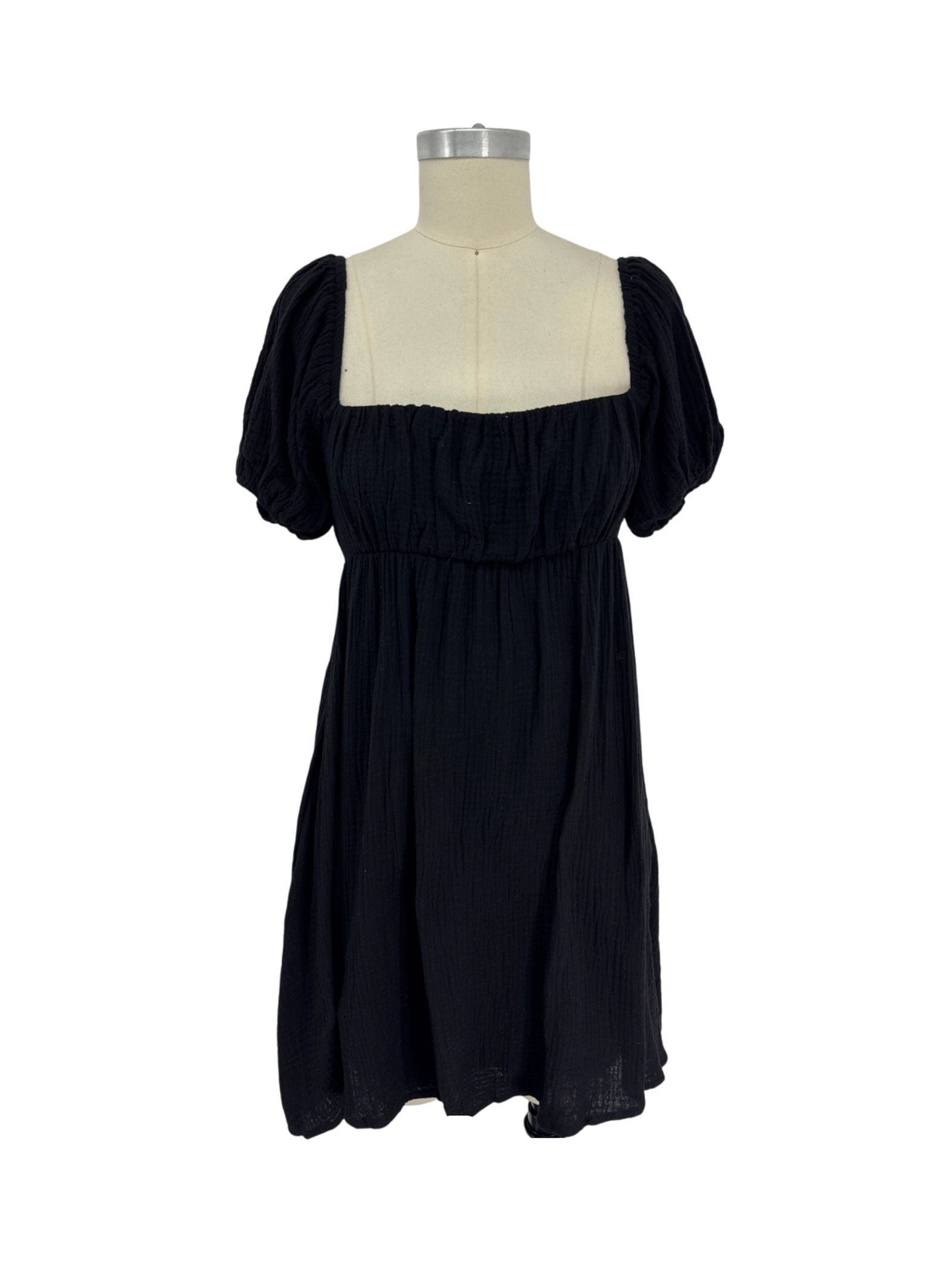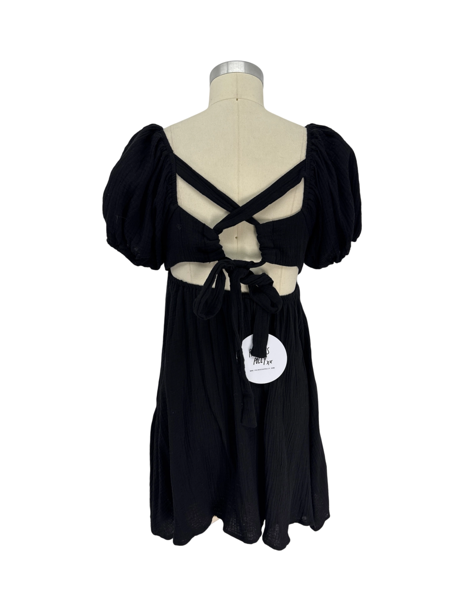 This pre-owned Princess Polly dress is a stylish and versatile addition to any wardrobe. This mini dress features a flattering A-line silhouette, a square neckline, and short puff sleeves, all in a classic black hue. Made from comfortable 100% cotton fabric, it's perfect for summer wear. The dress's design includes a unique back detail, adding a touch of flair to the overall look. It's ideal for casual outings and can be easily dressed up or down, making it a wardrobe staple.