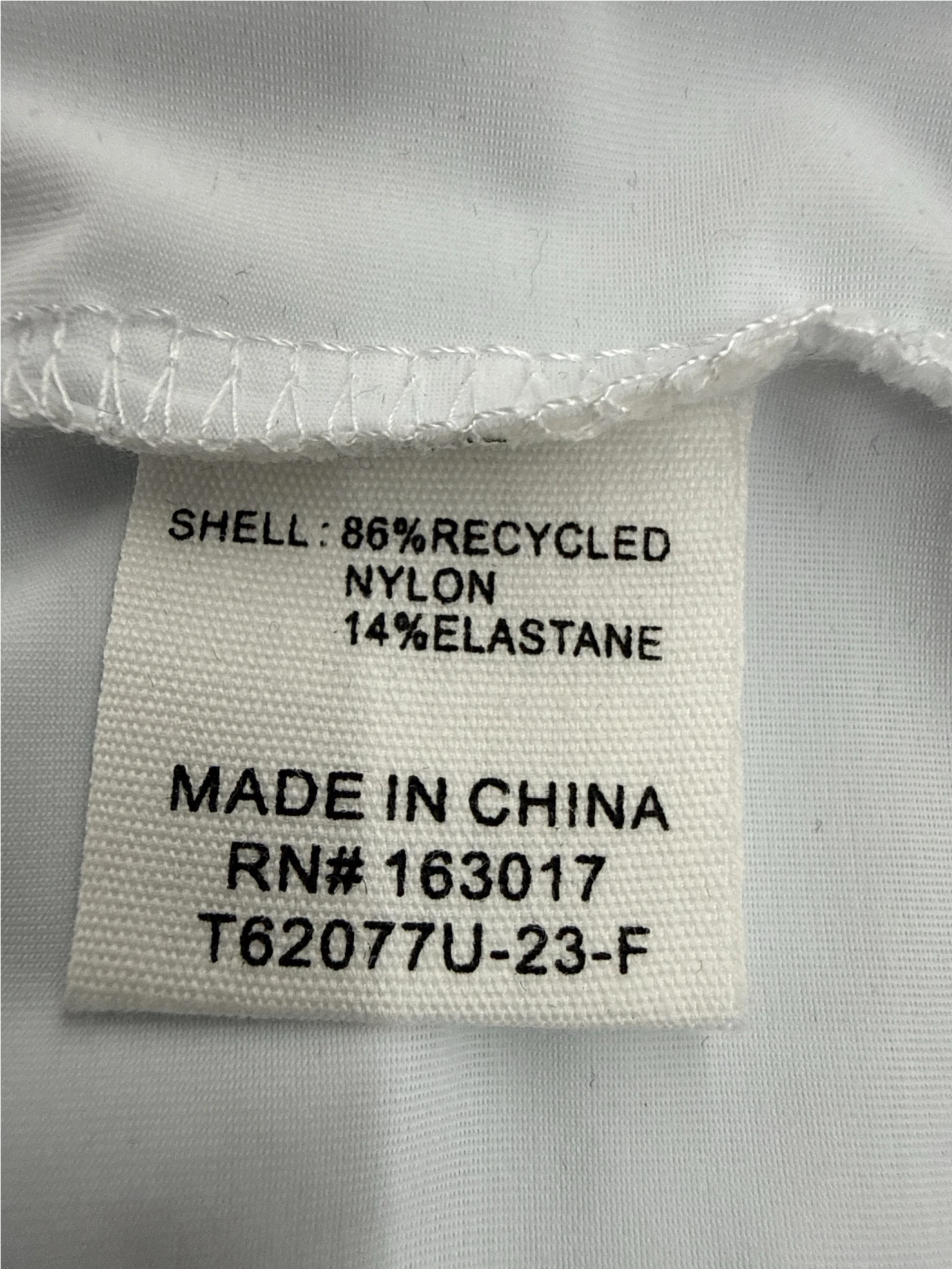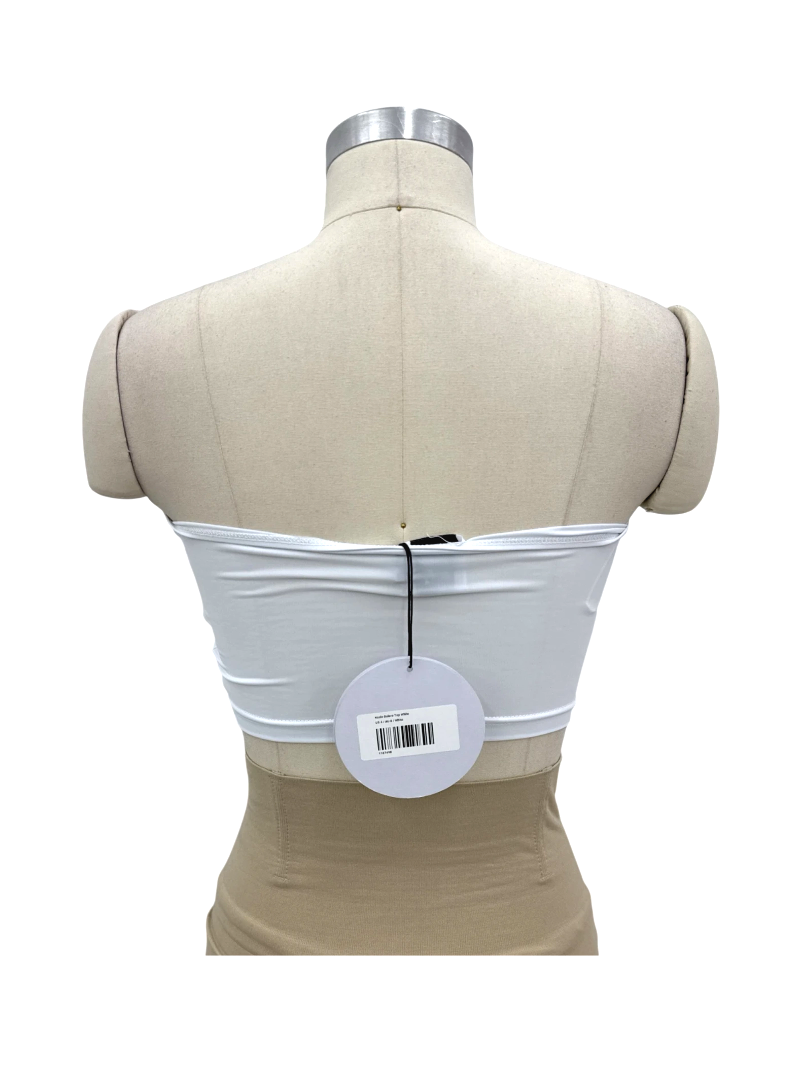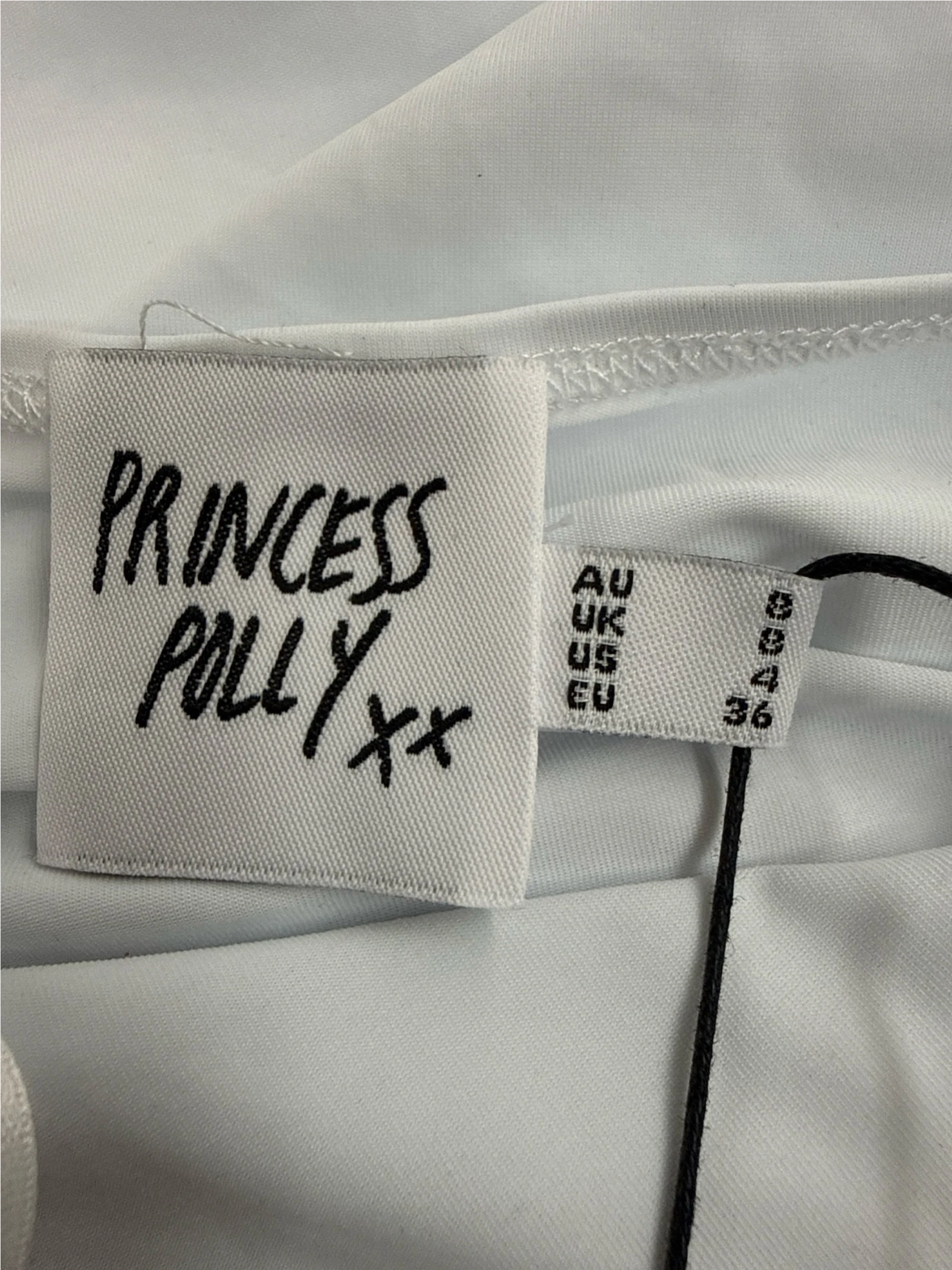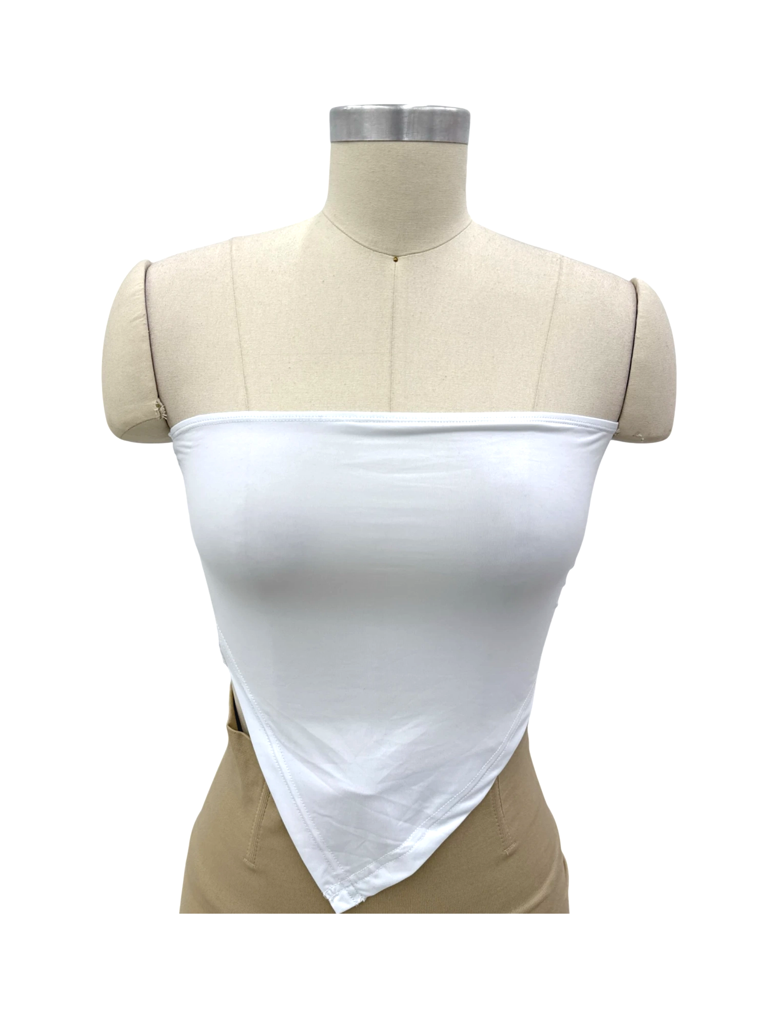This chic Princess Polly white bandeau top is the perfect addition to your summer wardrobe. Made from a blend of recycled nylon and elastane, this cropped top offers a comfortable and flattering fit. Its strapless design and unique asymmetrical hem make it versatile for various outfits. This used top is ideal for warm weather and is a stylish choice for a night out or a casual day look.