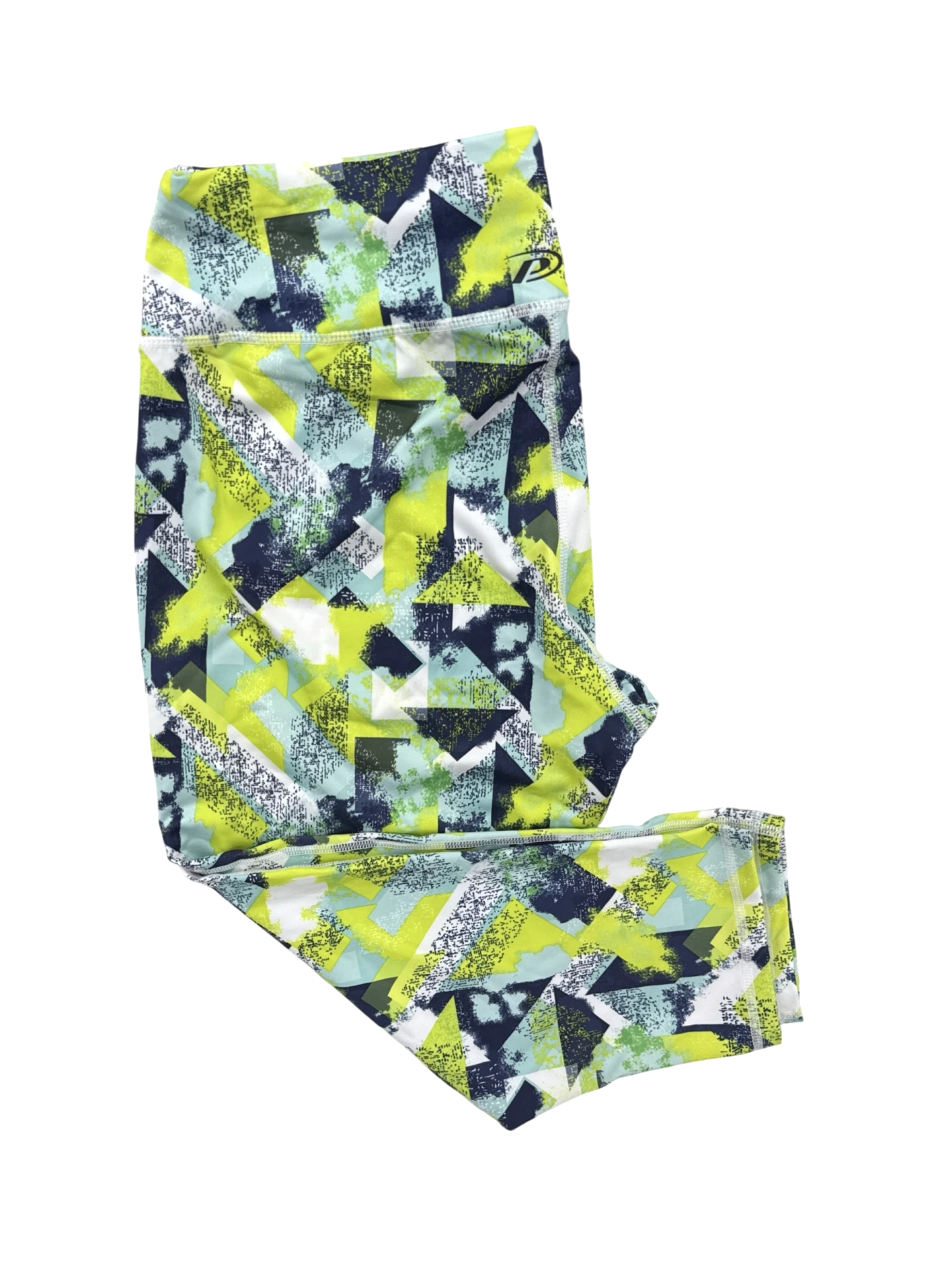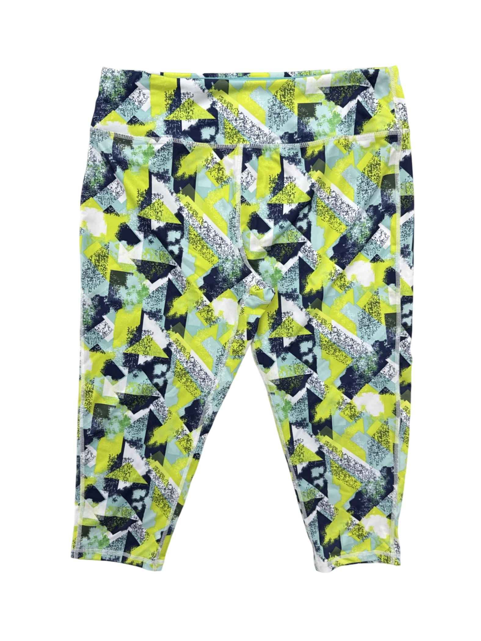 Elevate your activewear collection with these pre-owned Pro Player capri leggings, designed for comfort and style. Featuring a vibrant geometric pattern in a mix of colors, these leggings are perfect for your workouts or casual wear. Made from a blend of polyester and spandex, they offer a comfortable and flexible fit. Size 1X. They are a must-have addition to your workout wardrobe.
