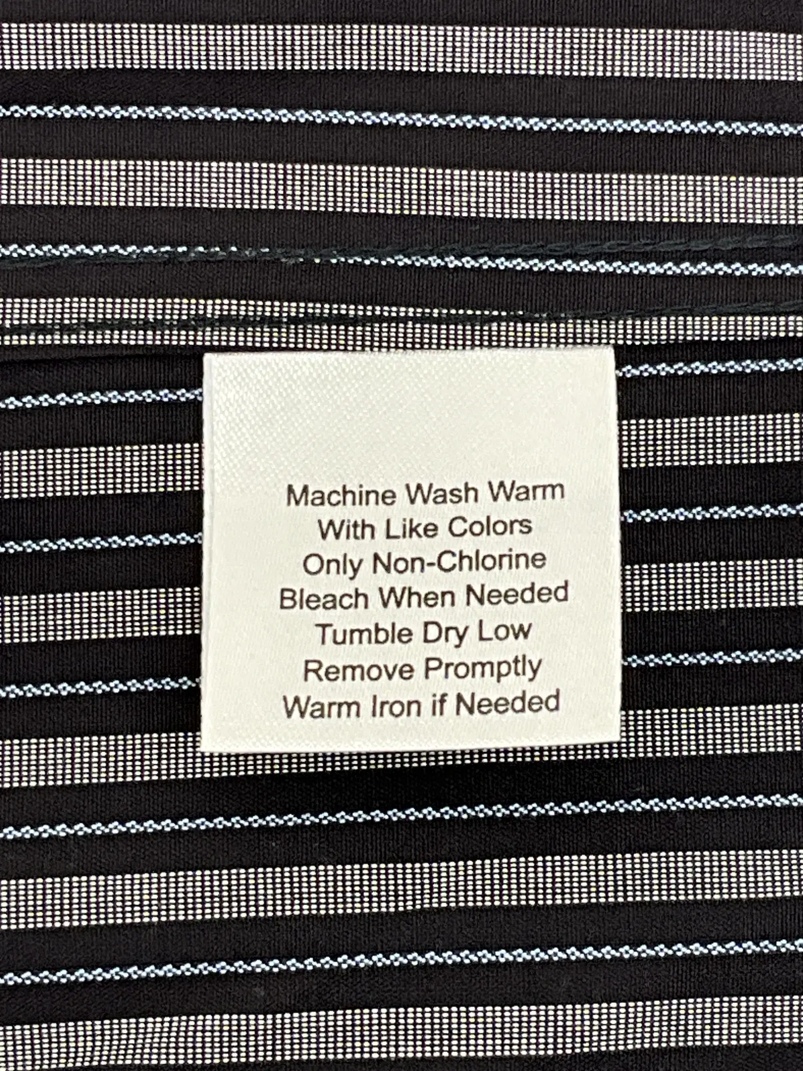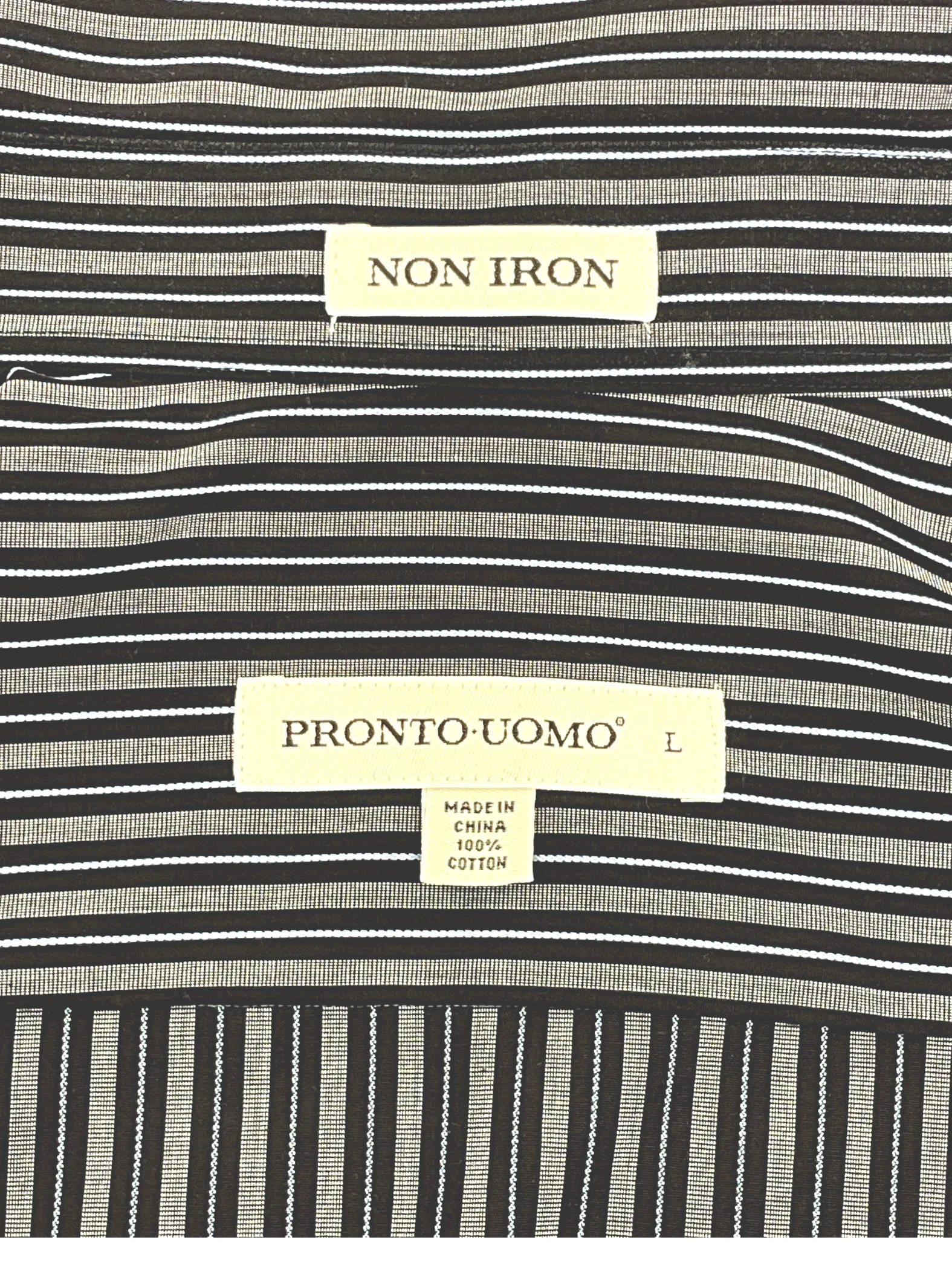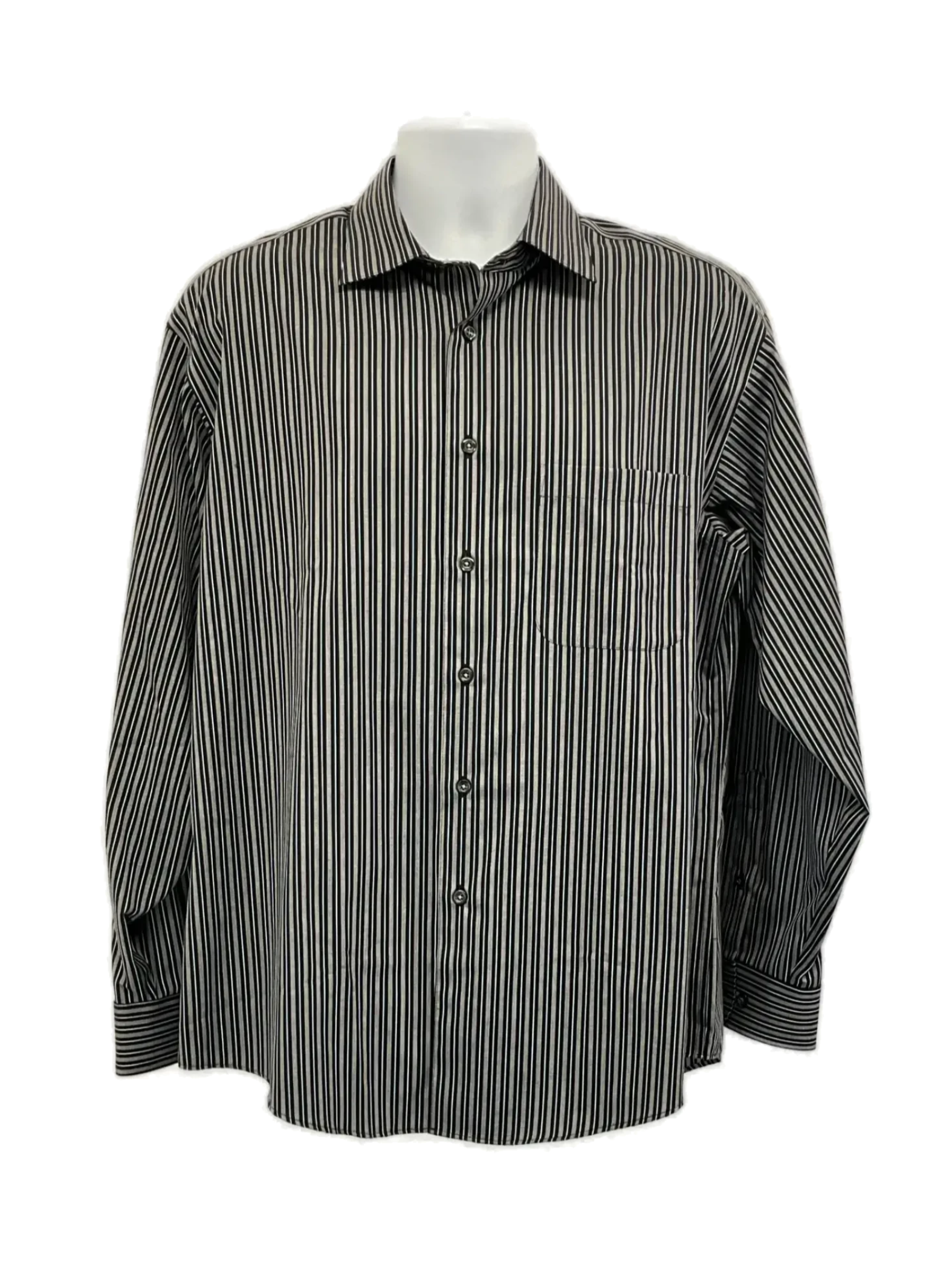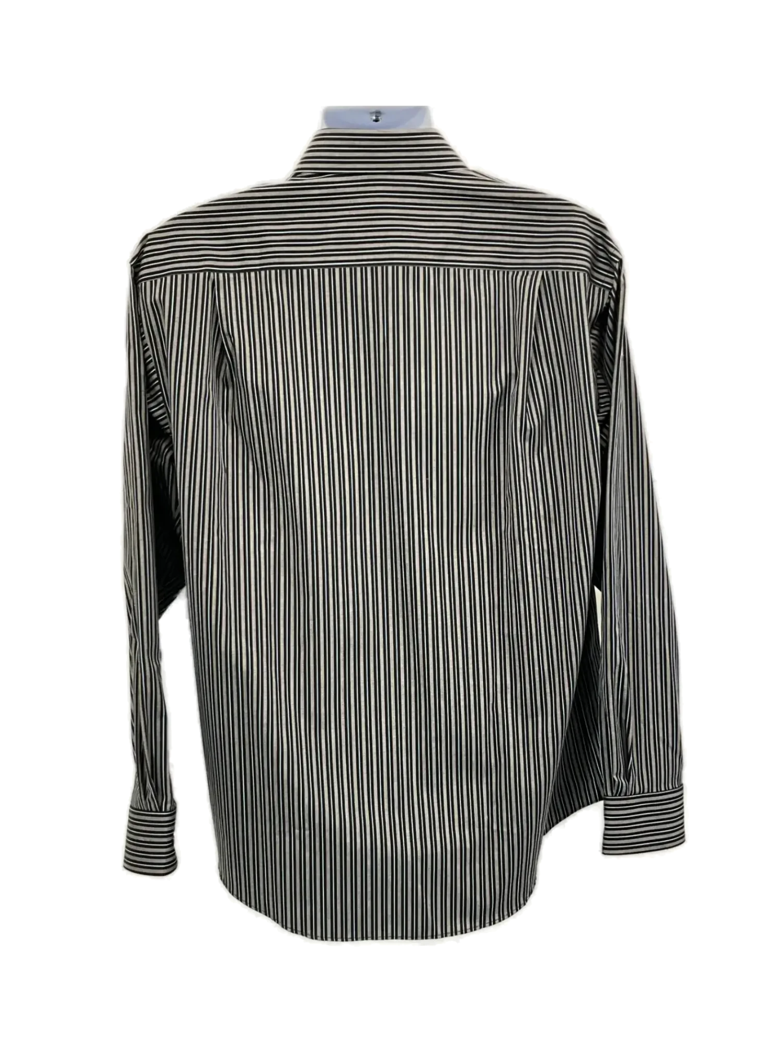 Men's non-iron button-up dress shirt in size large tall with blue, gray, and black stripes.