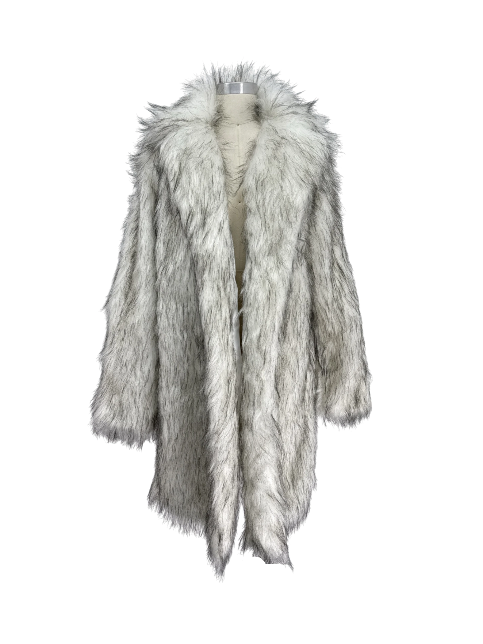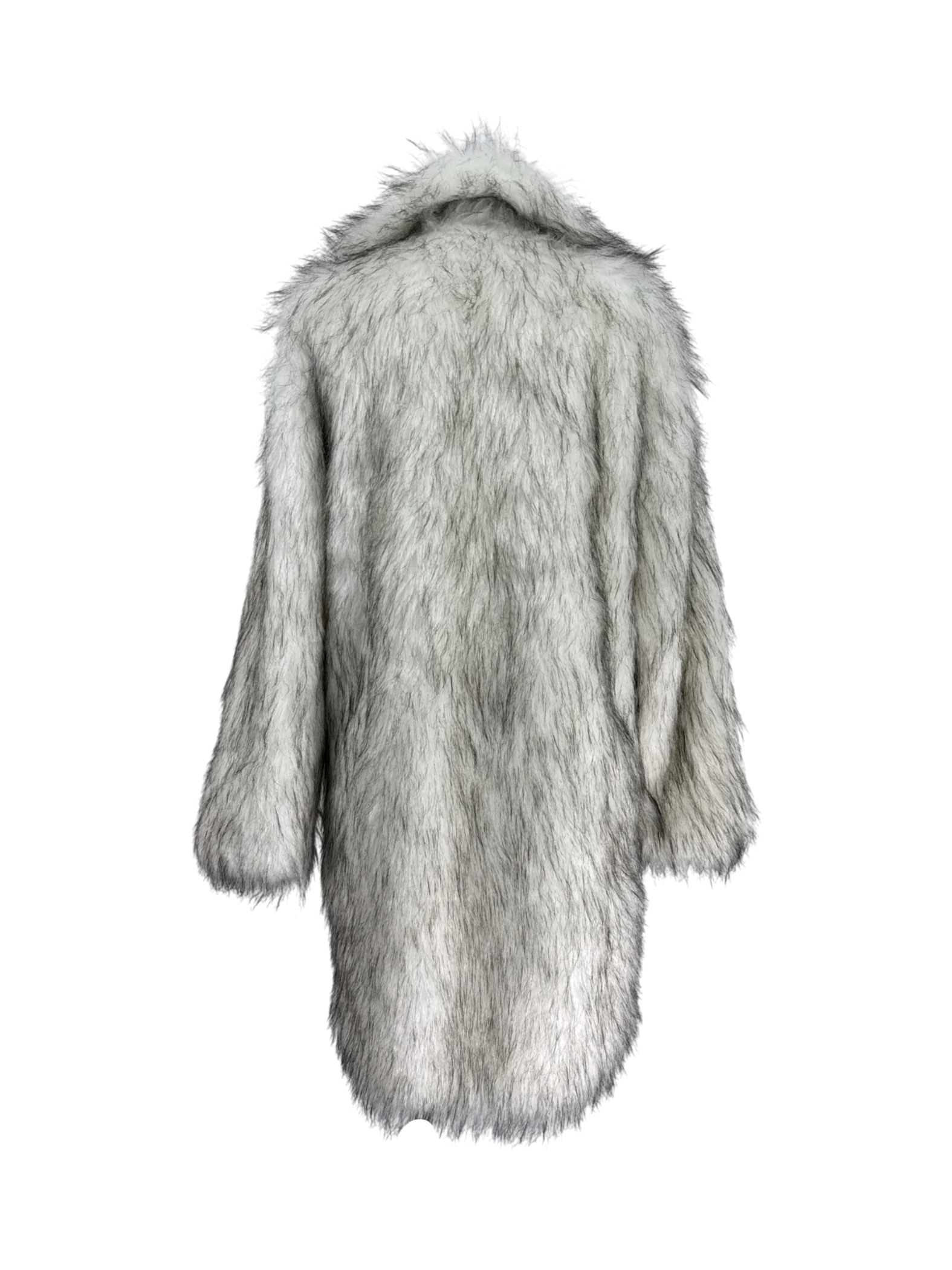 Embrace the winter chill in style with this luxurious pre-owned QIYE faux fur coat. This statement piece features a soft, textured grey and white design, perfect for adding a touch of glamour to any outfit. Made from 100% acrylic, this coat provides warmth and comfort. The mid-length cut and oversized silhouette offer a flattering fit, while the neutral color palette ensures versatility. Perfect for a night out or a cozy winter day.