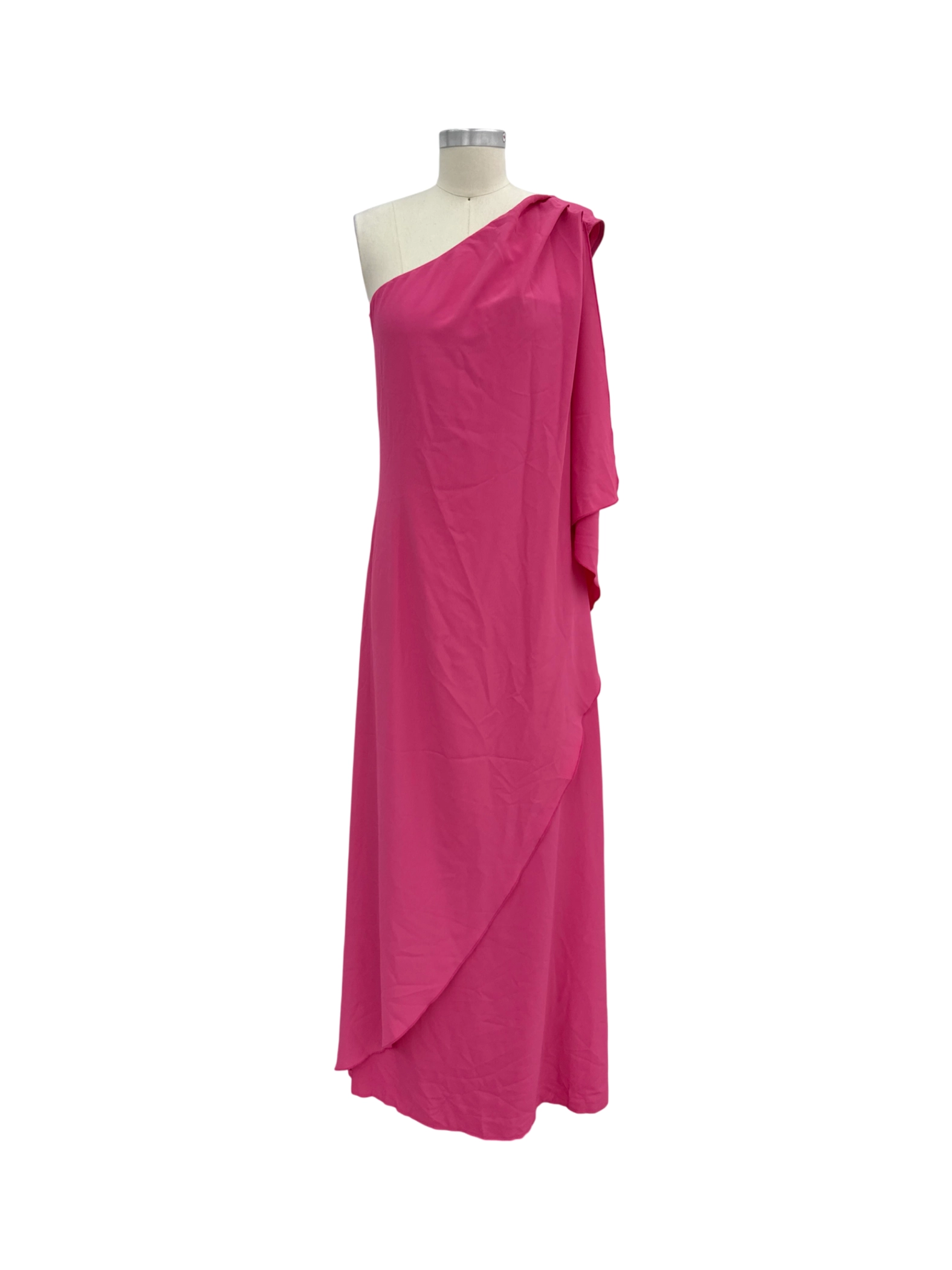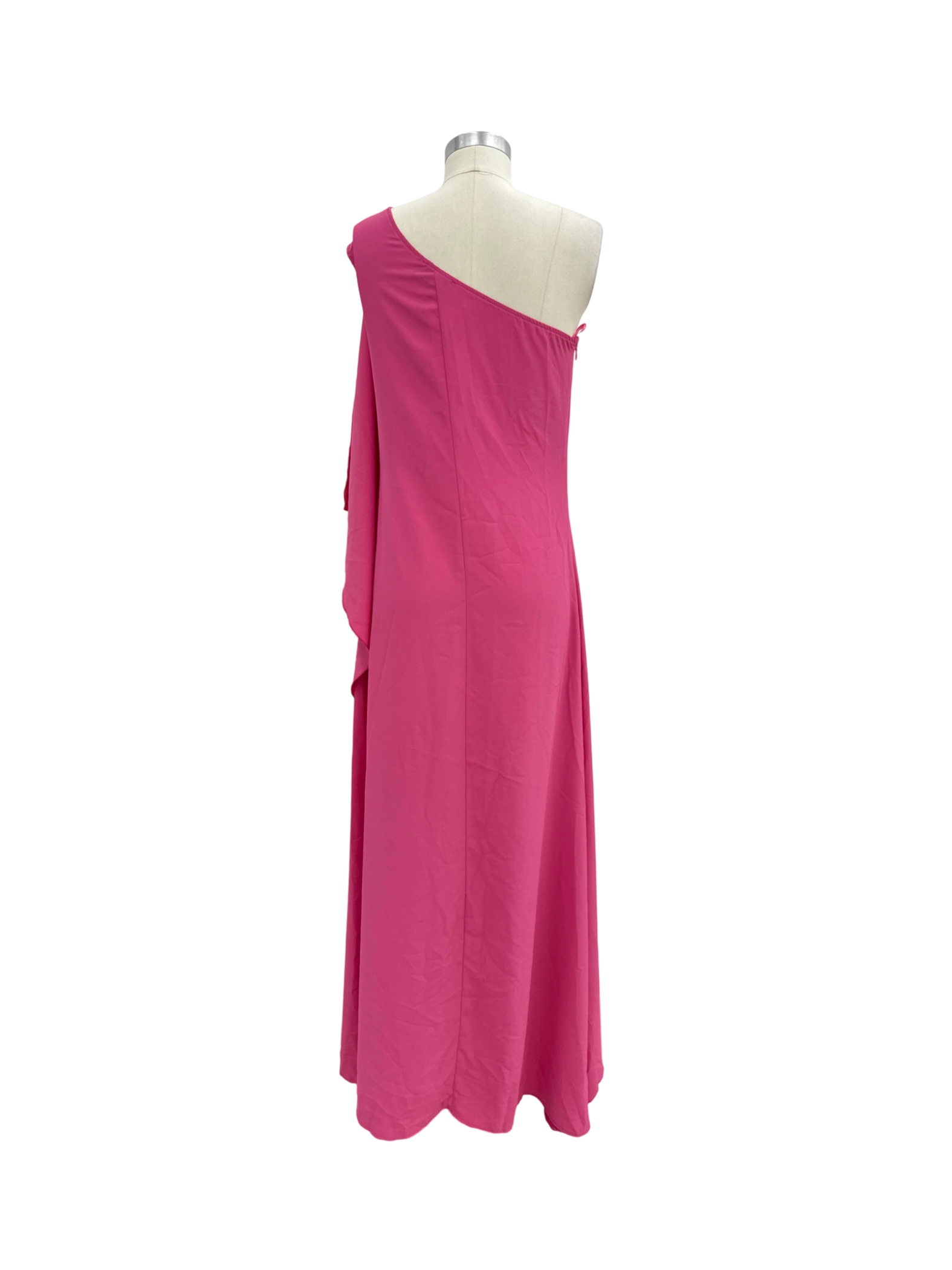 Elevate your evening wardrobe with this stunning QUIZ dress. This pre-owned, one-shoulder maxi dress in a vibrant pink hue is perfect for any special occasion. Made from luxurious polyester, it drapes beautifully, offering a flattering silhouette. The elegant design is ideal for cocktail parties, formal events, or a night out. Embrace effortless style and sophistication with this must-have dress.