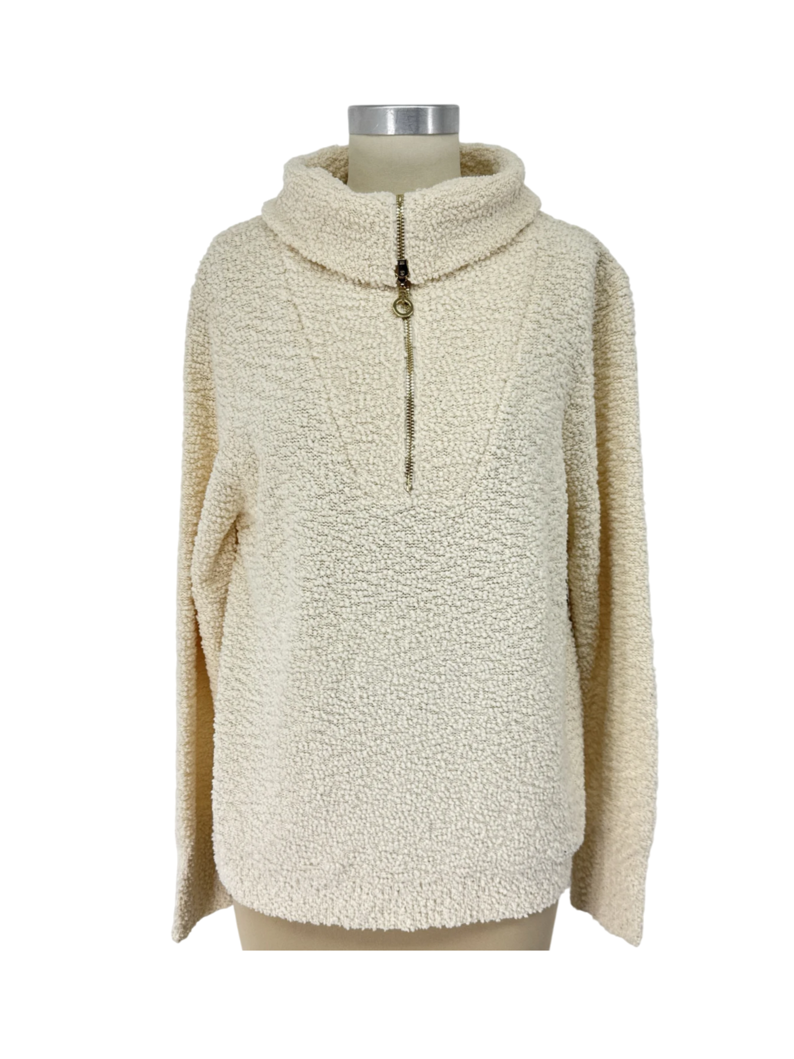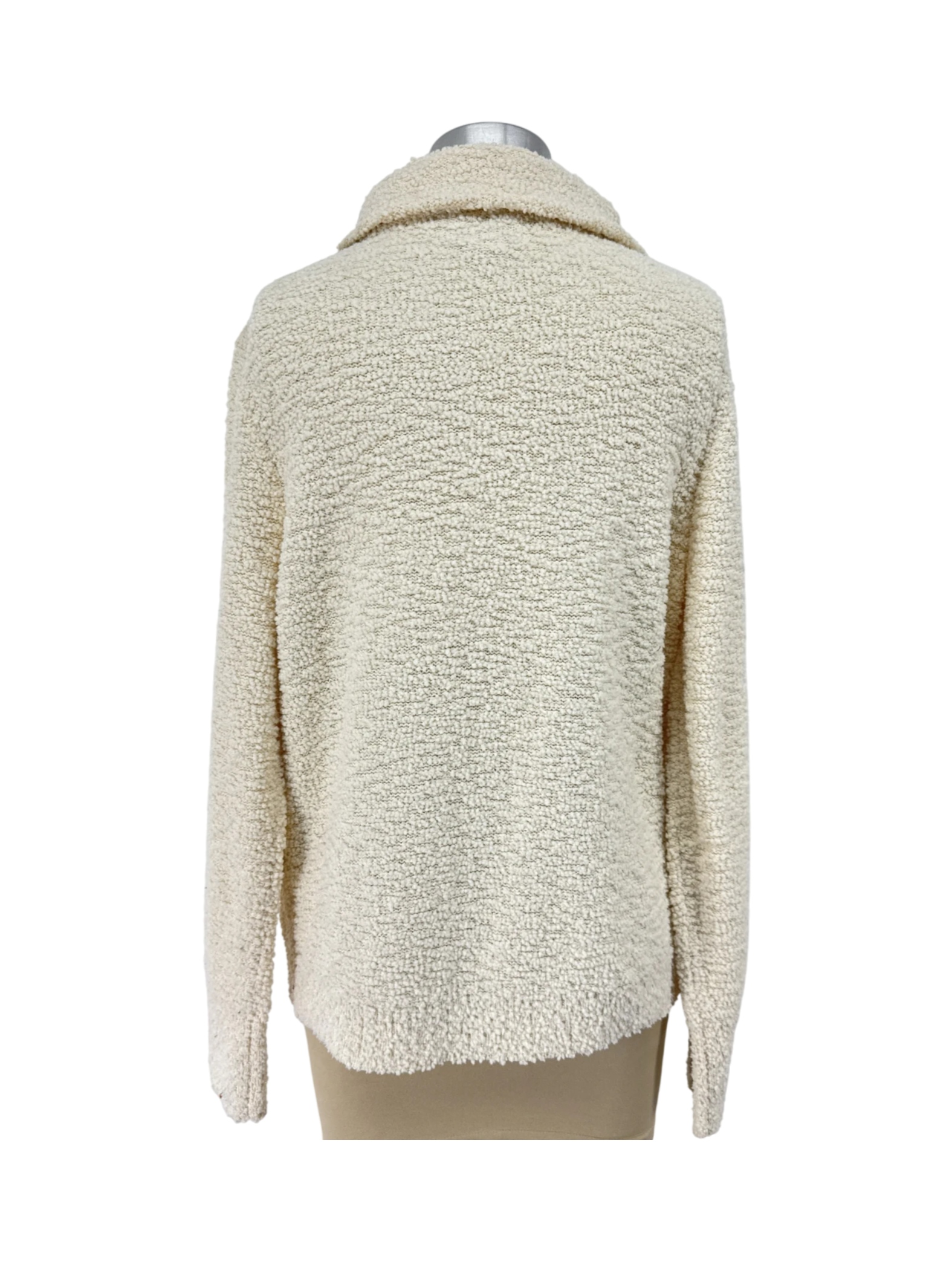 This pre-owned RACHEL ZOE sweater is the perfect cozy addition to your fall or winter wardrobe. Featuring a soft, textured ivory fabric and a stylish turtleneck, this pullover sweater offers both warmth and style. The half-zip closure adds a modern touch, while the plush material makes it a comfortable choice for everyday wear. The sweater is in great condition, ready to elevate your casual outfits with its chic and timeless design. Great for layering or wearing alone.