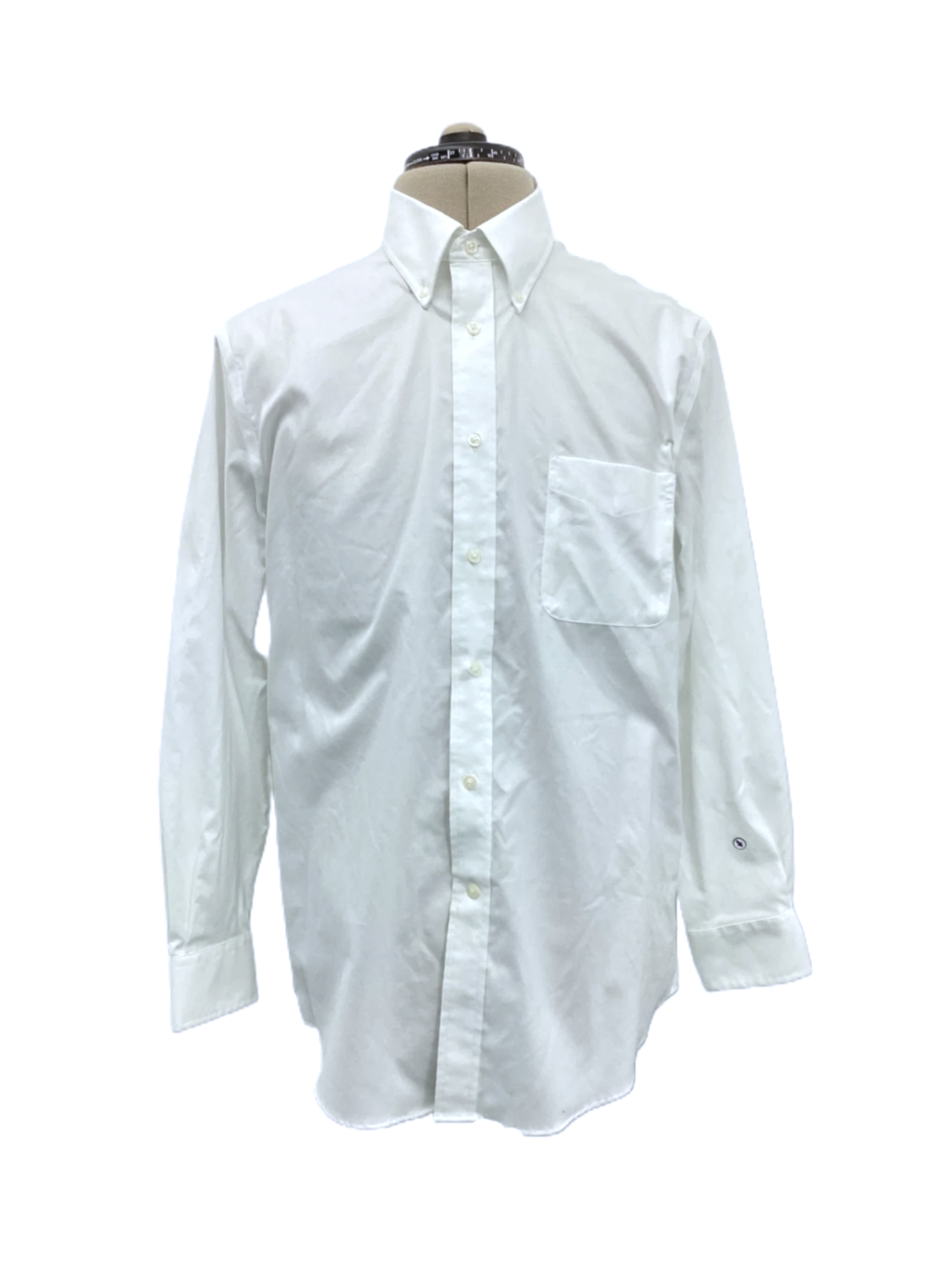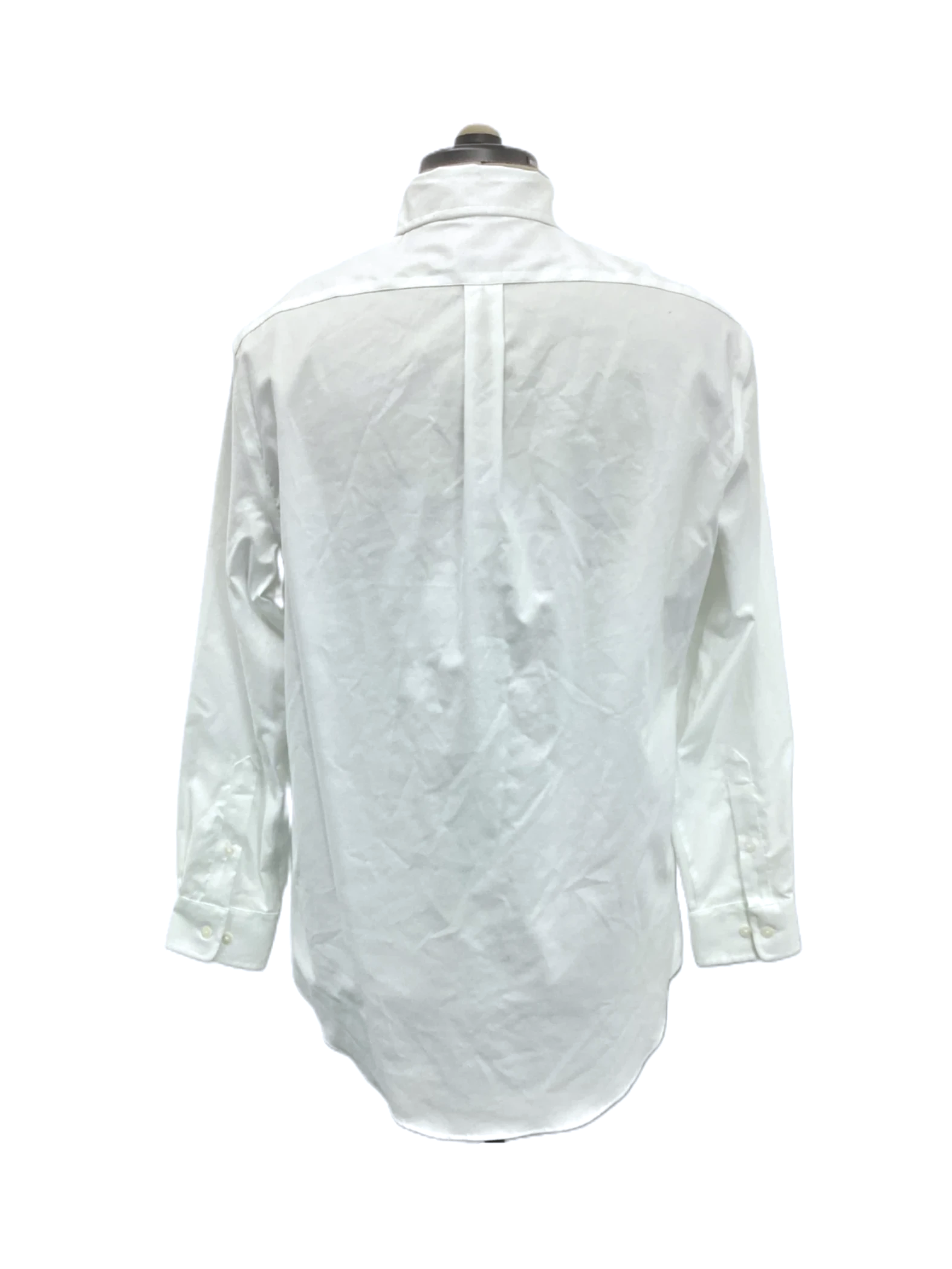 This is a regular fit white button-up shirt for men made from stretch fabric. There is a small stain on the right sleeve.