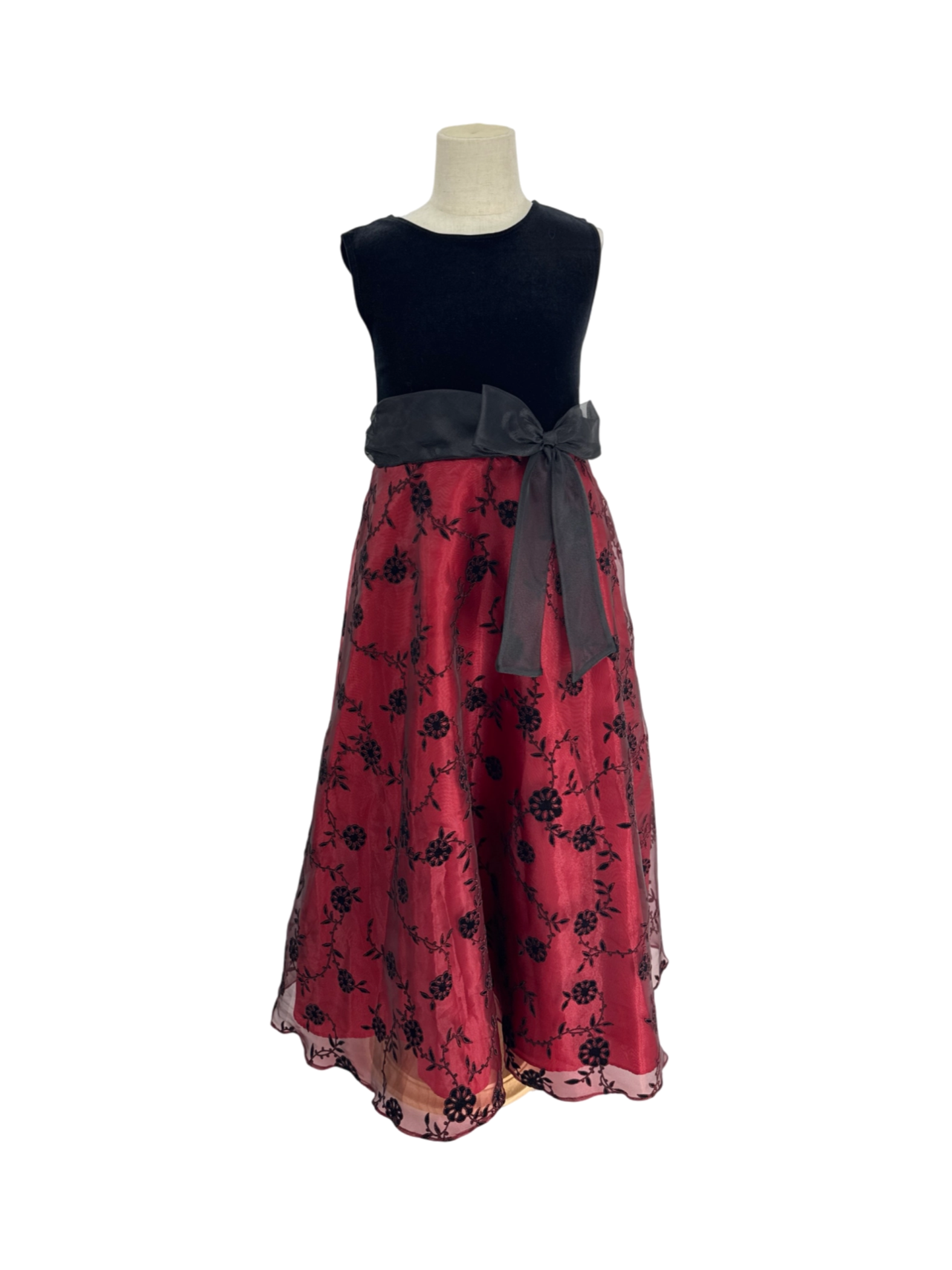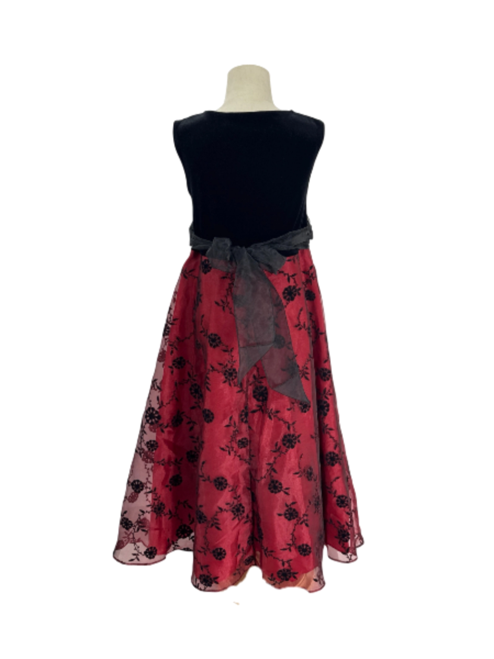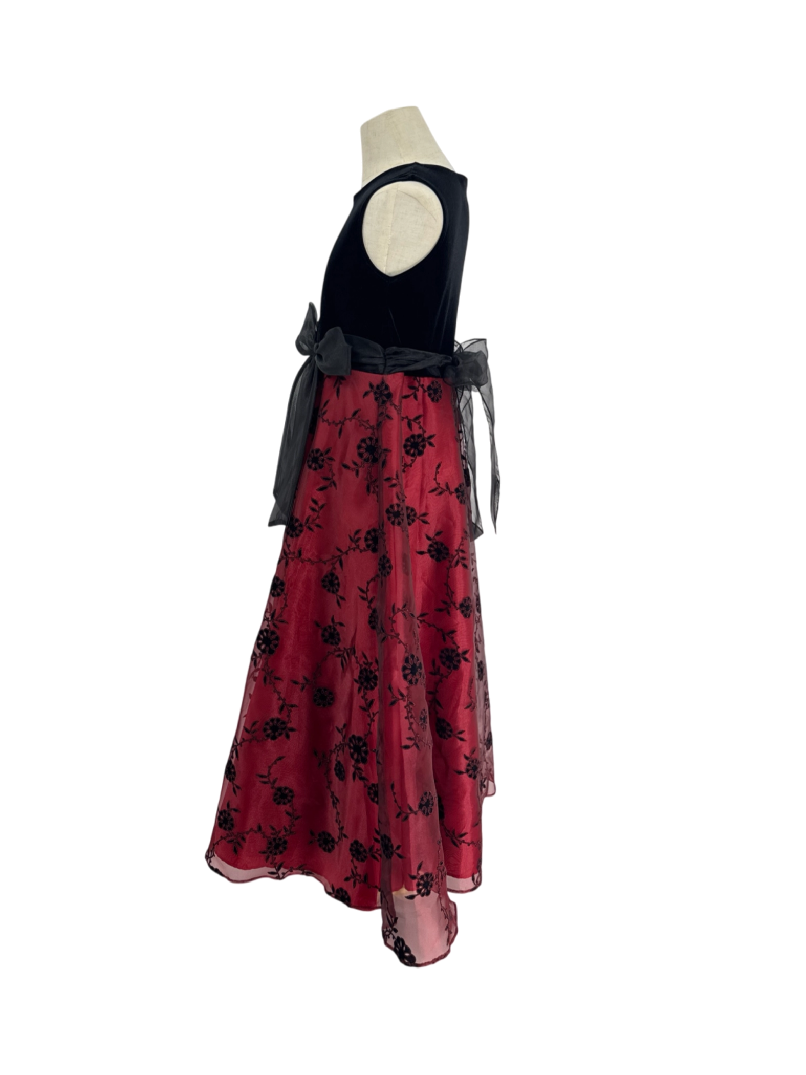 A girls' dress in red and black floral design with a velvet bodice, an embroidered mesh skirt, and a bow accent.