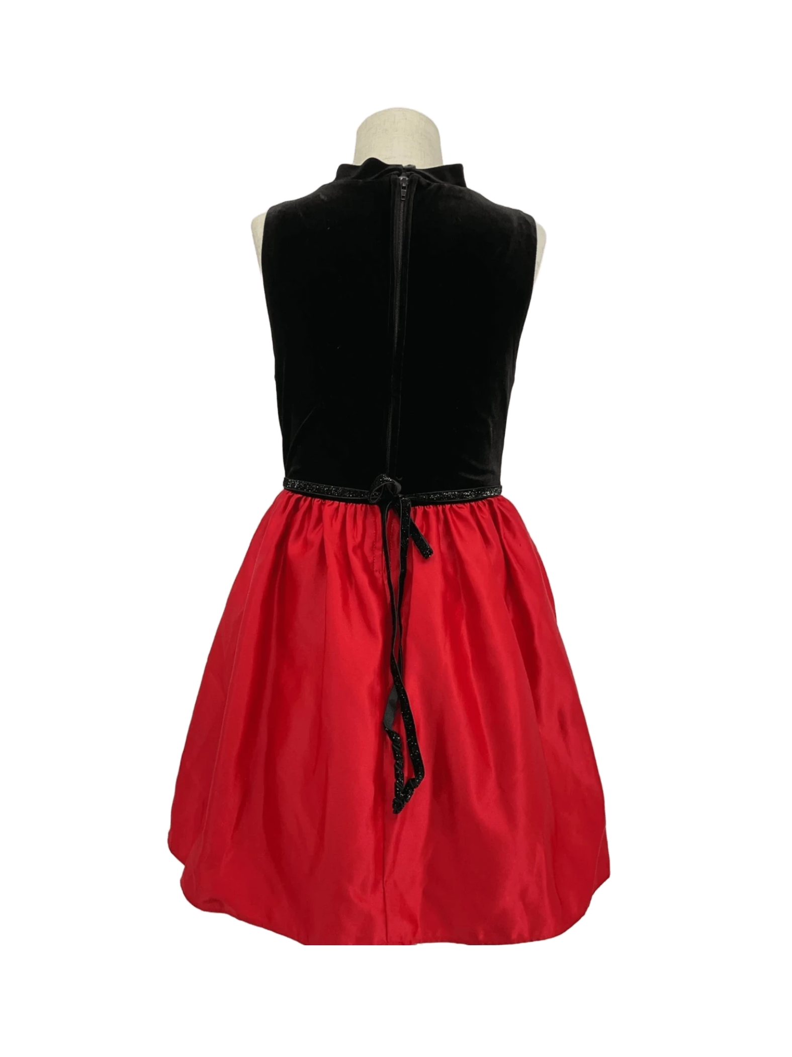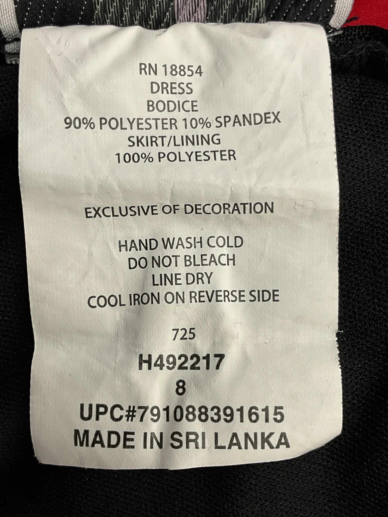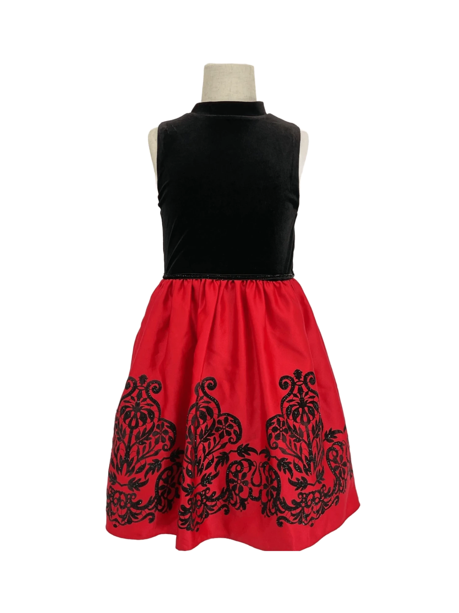 A red and black dress with floral designs for girls in size 8 is available, but there is a small fading on the floral designs.
