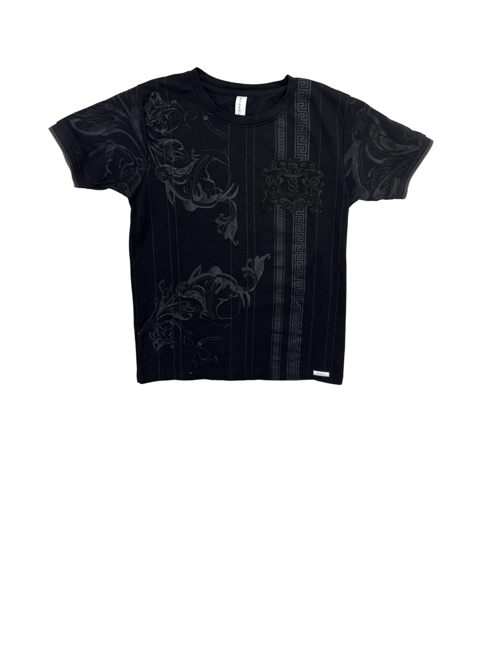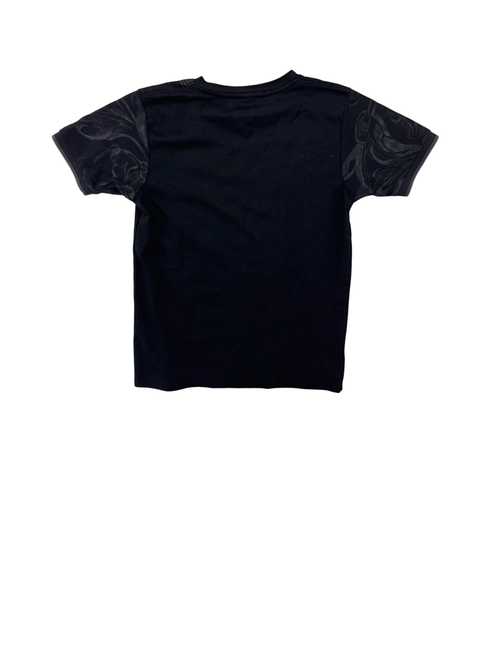 This stylish, pre-owned Red Sound T-shirt for boys features a unique design. Crafted from a blend of polyester and spandex, it offers comfort and durability. This black tee showcases an intricate pattern and is perfect for a casual yet fashionable look. With its crew neckline and short sleeves, it is ideal for warm weather. A versatile addition to any boy's wardrobe.