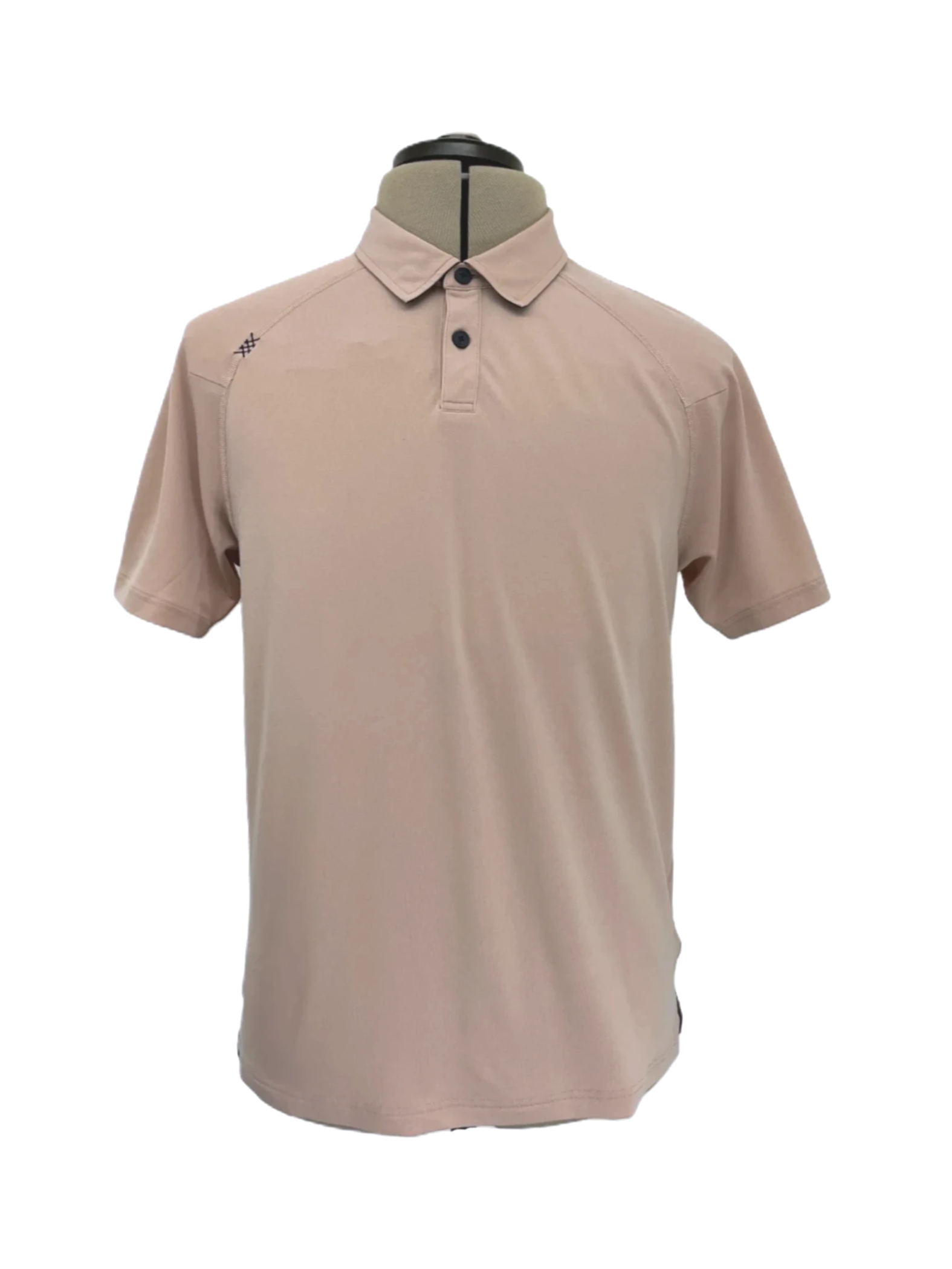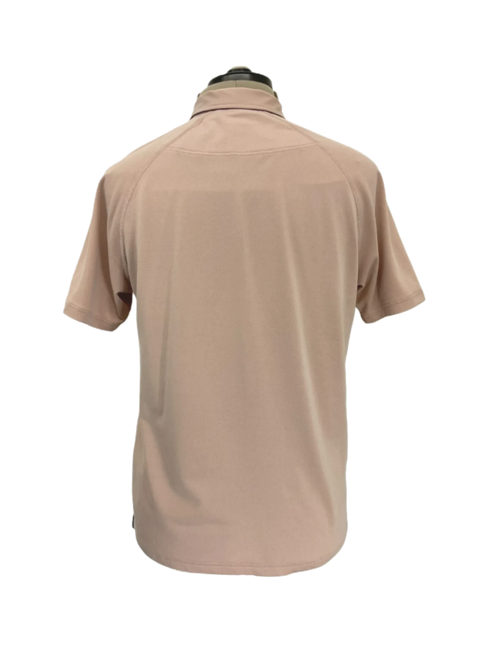 Men's light Dusty Pink polo shirt in size Medium, with performance stretch and button-up short sleeves.
