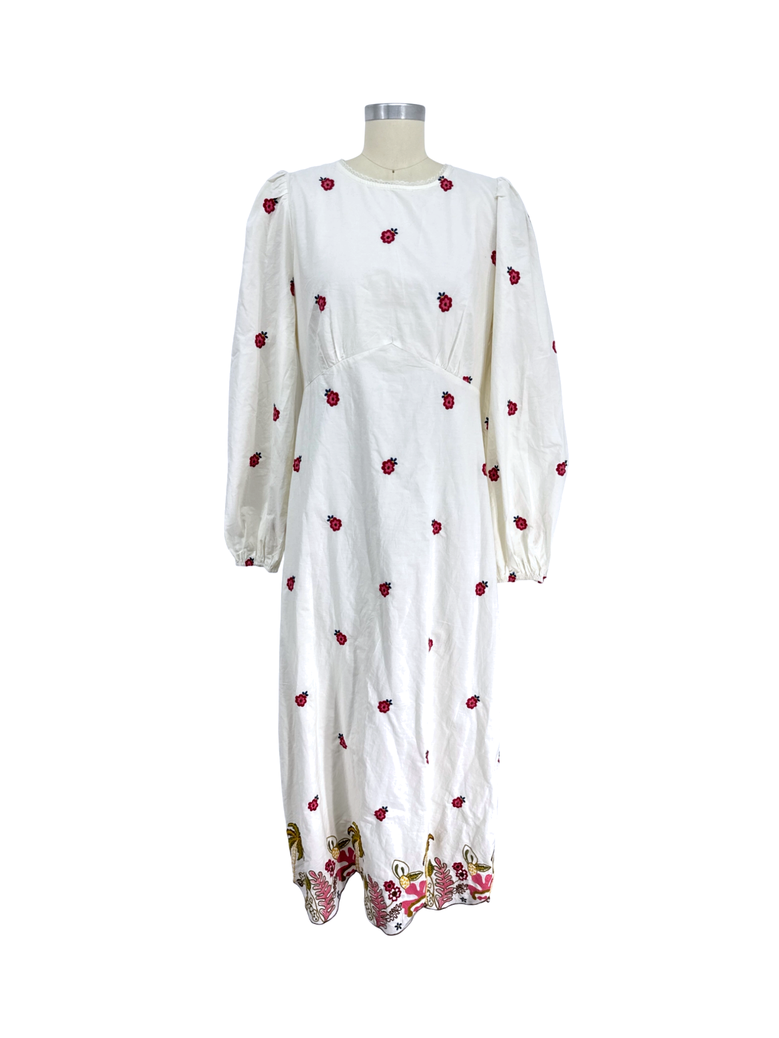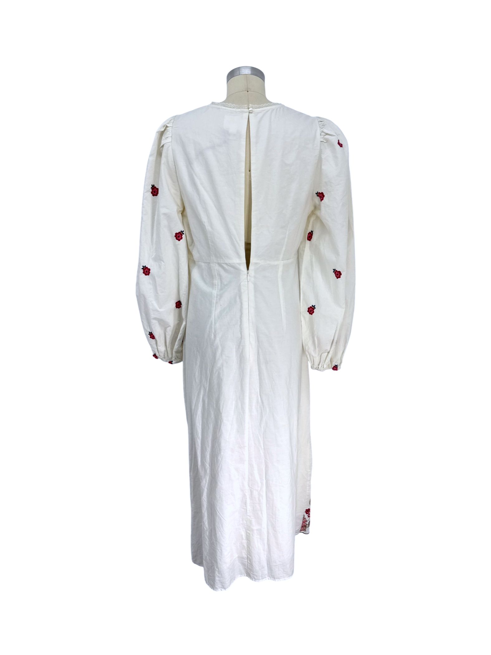 This beautiful pre-owned River Island dress is perfect for spring and summer. The white midi dress is adorned with delicate floral embroidery, creating a fresh and feminine look. This A-line dress features a round neckline and long sleeves. Made from a blend of cotton and polyester. Ideal for casual outings or a special occasion, this dress will keep you comfortable and stylish all day long. A stylish addition to any wardrobe.
