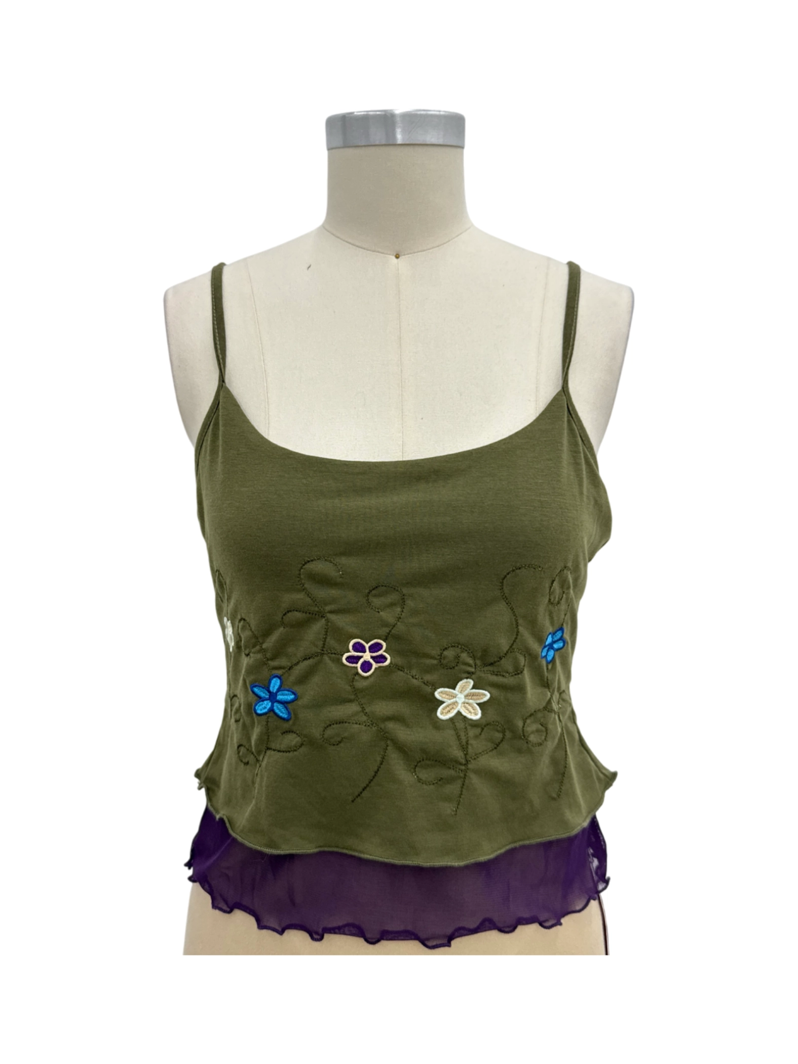 Embrace a touch of bohemian flair with this pre-loved ROMWE tank top. This stylish piece features a delicate floral embroidery, and a layered design. Perfect for warm weather, it's crafted from a comfortable blend of polyester and spandex. The spaghetti straps and relaxed fit make it an ideal choice for a casual day out or layering under a jacket for a chic, vintage-inspired look.
