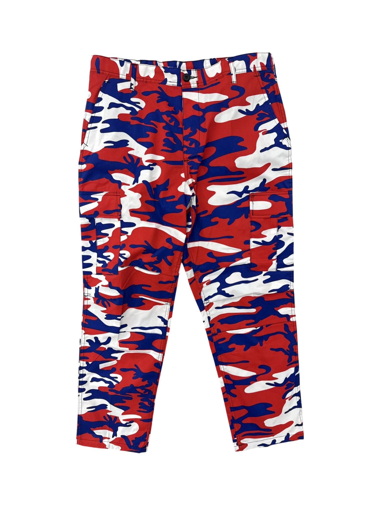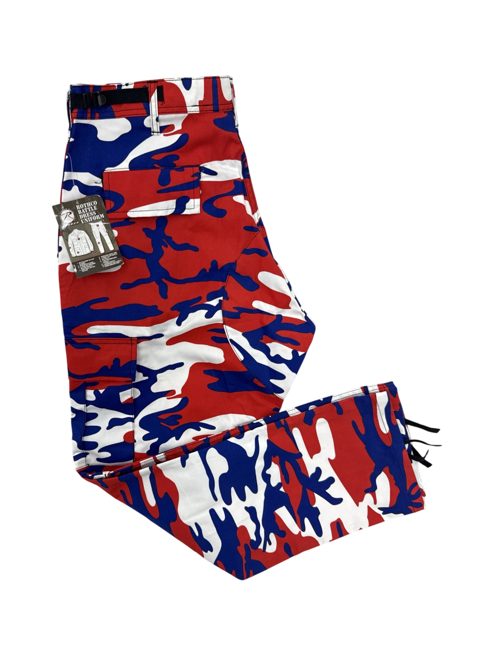 These Rothco BDU cargo pants are a standout addition to any wardrobe. Featuring a bold red, blue, and white camouflage pattern, they're perfect for making a statement. Crafted from a durable cotton and polyester blend, these pants offer both comfort and resilience. With multiple pockets and a classic straight-leg cut, they provide functionality and style. Ideal for outdoor adventures or casual wear, these pre-owned pants are a great find.