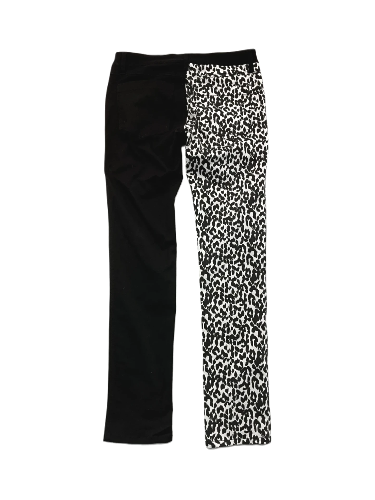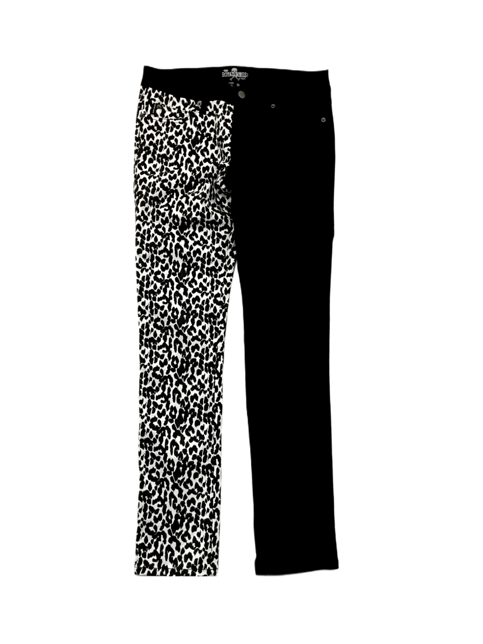 Step out in style with these unique Royal Bones jeans! These eye-catching jeans feature a striking two-tone design, combining a classic black with a bold animal print. Made from a comfortable blend of cotton and spandex, they offer a flattering fit with a straight leg cut. These pre-owned jeans are in excellent condition and ready to elevate your wardrobe. Perfect for those who love to make a statement, these jeans are a must-have for any fashion-forward individual.