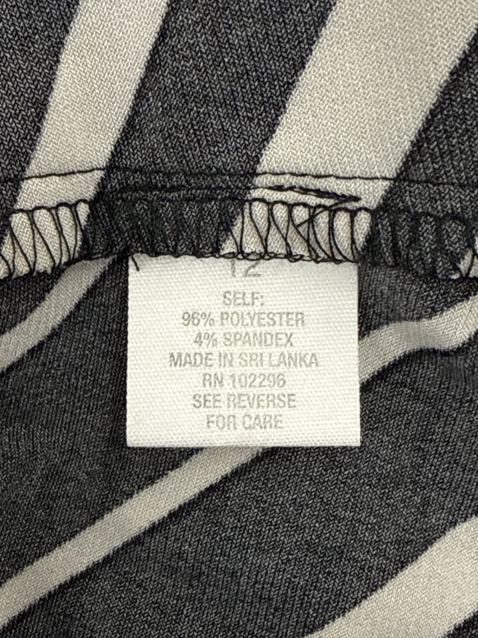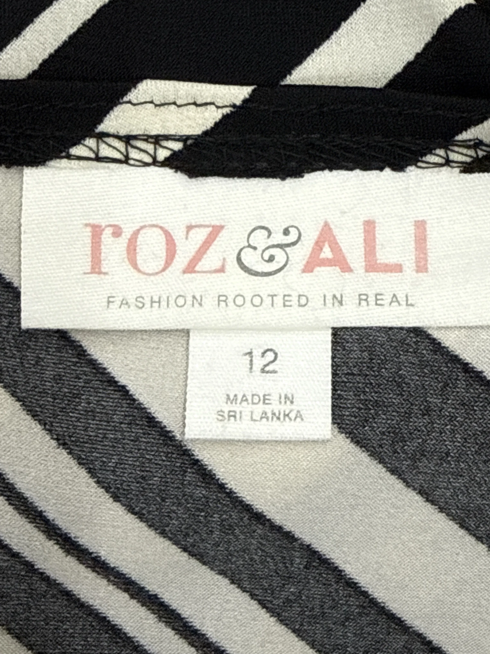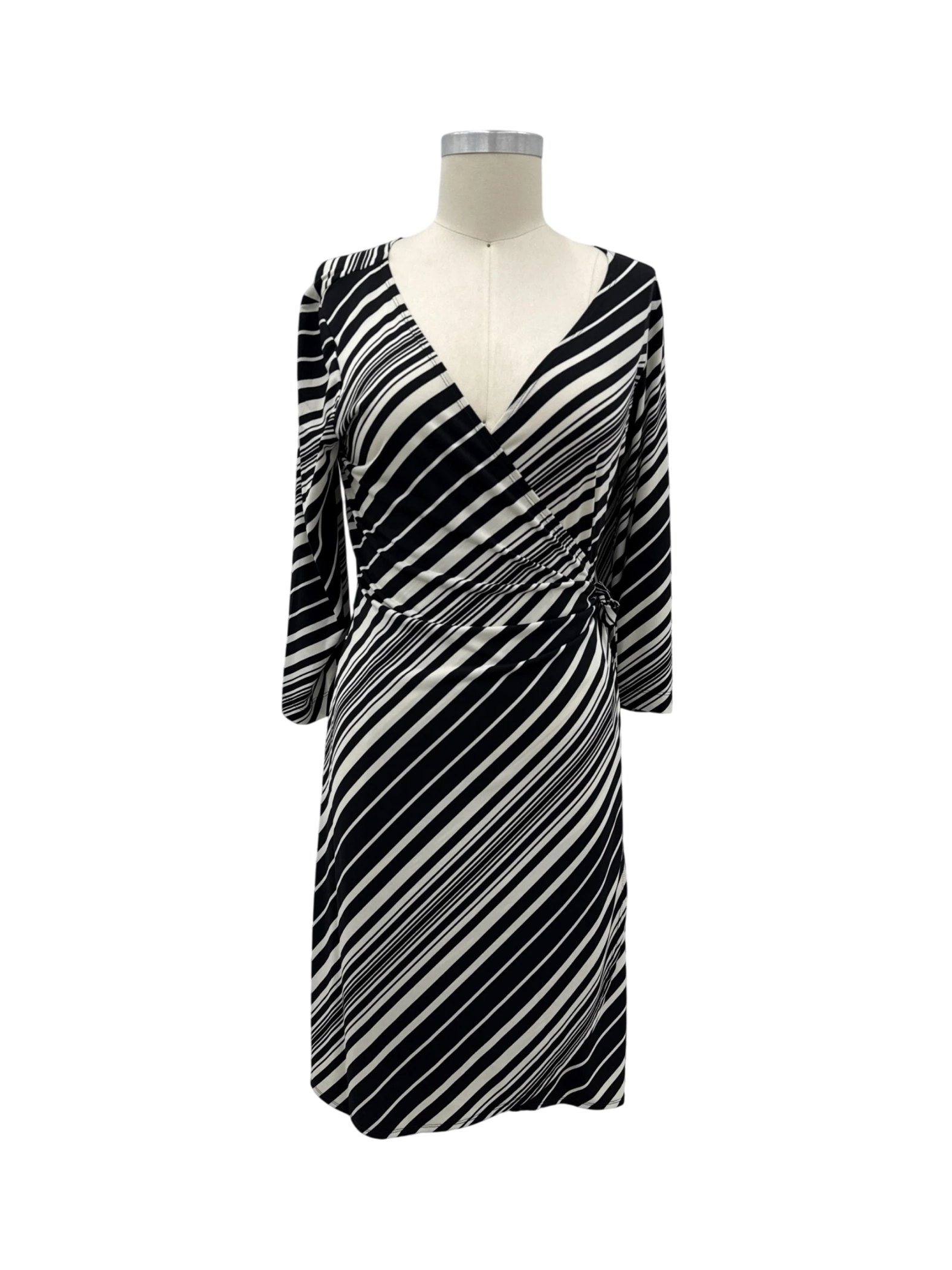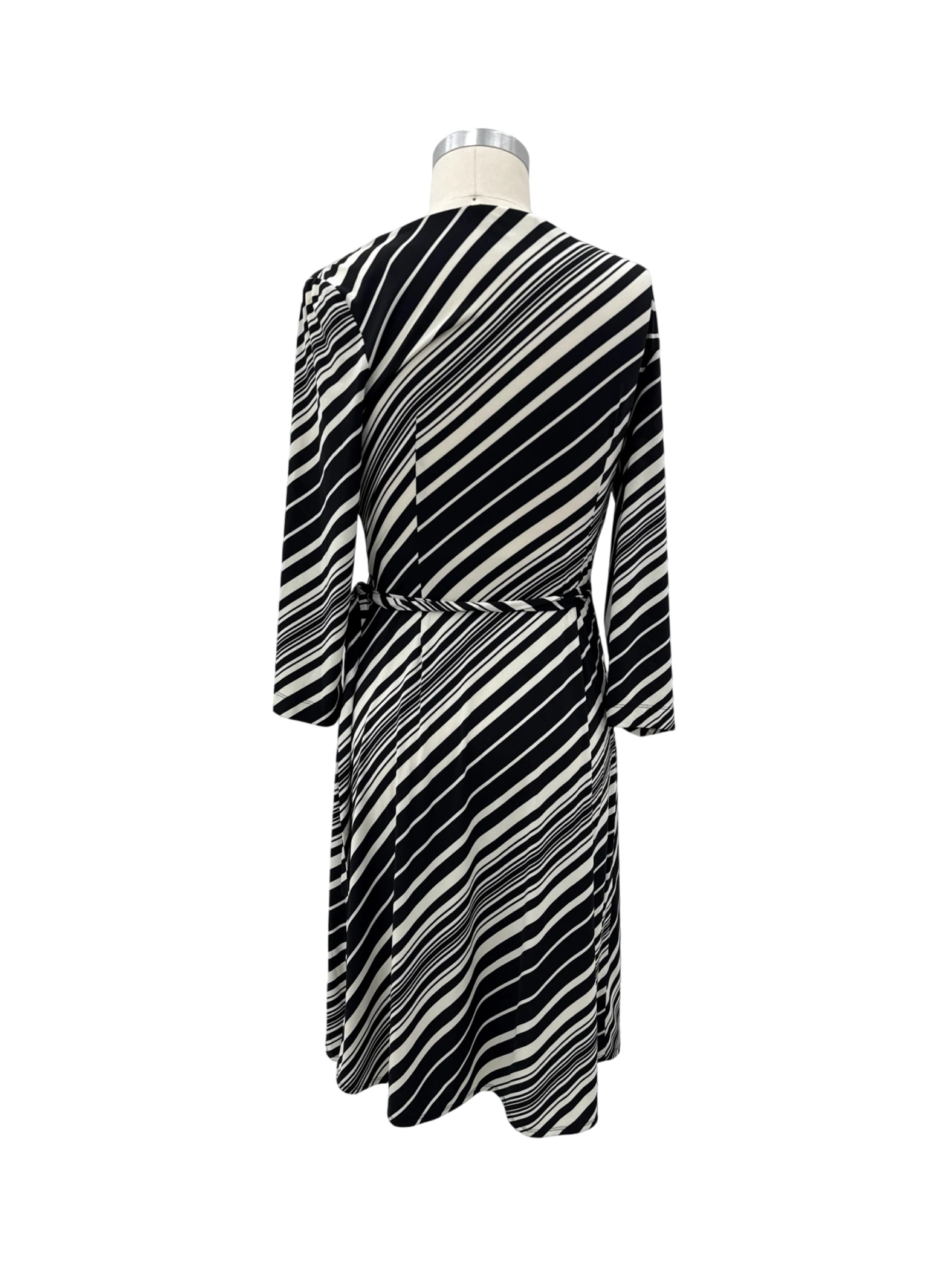This elegant Roz & Ali dress, a secondhand gem, features a flattering A-line silhouette with a wrap-style V-neckline. The black and white striped pattern offers a classic yet contemporary look. Crafted from a blend of polyester and spandex, this midi-length dress promises both comfort and style. Perfect for a casual day out or a semi-formal event. This dress is a great addition to your wardrobe.