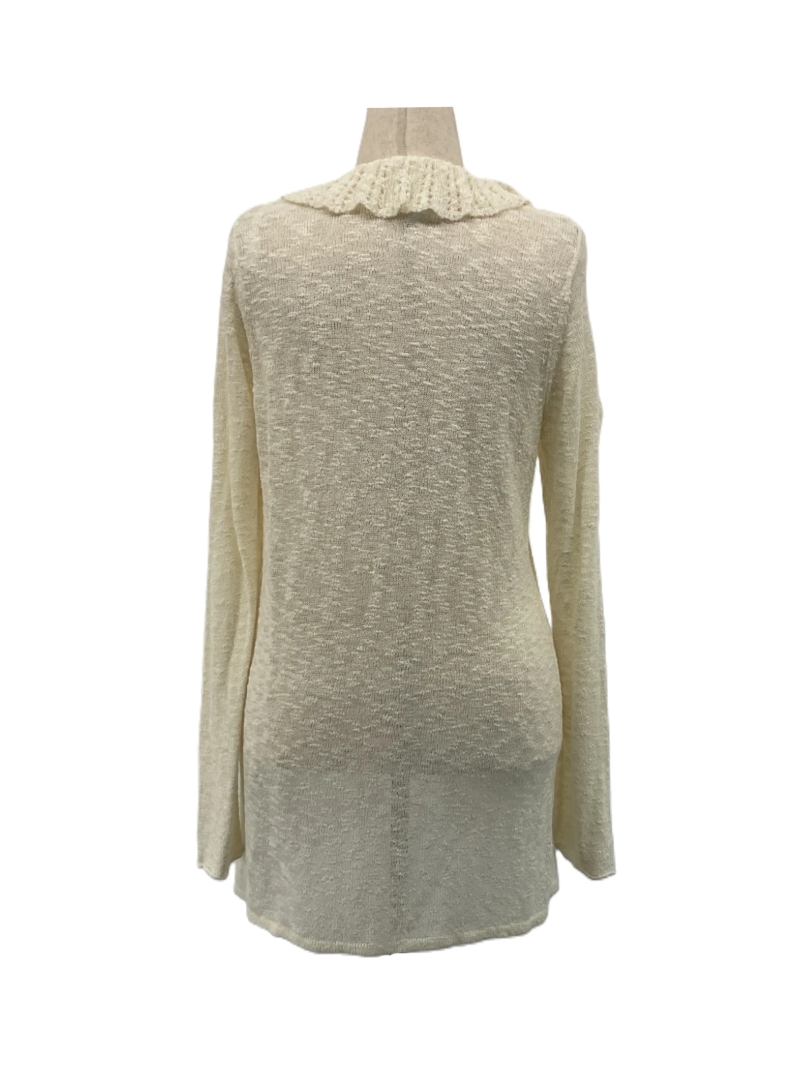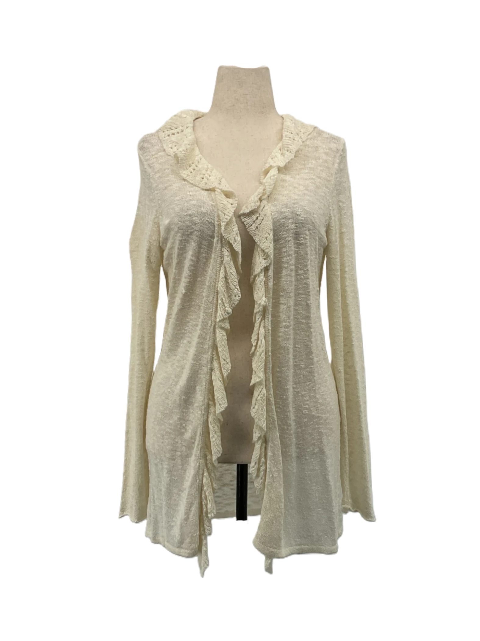 The size XL Sarah Spencer cream cardigan features cascading ruffles and an open front design.
