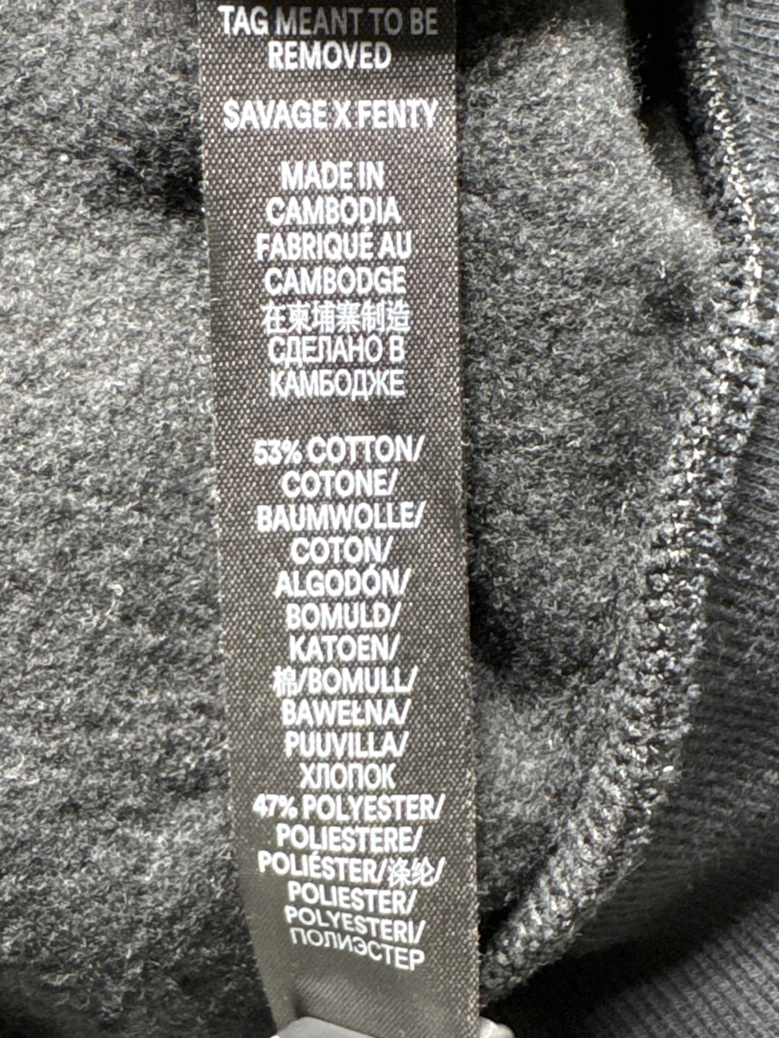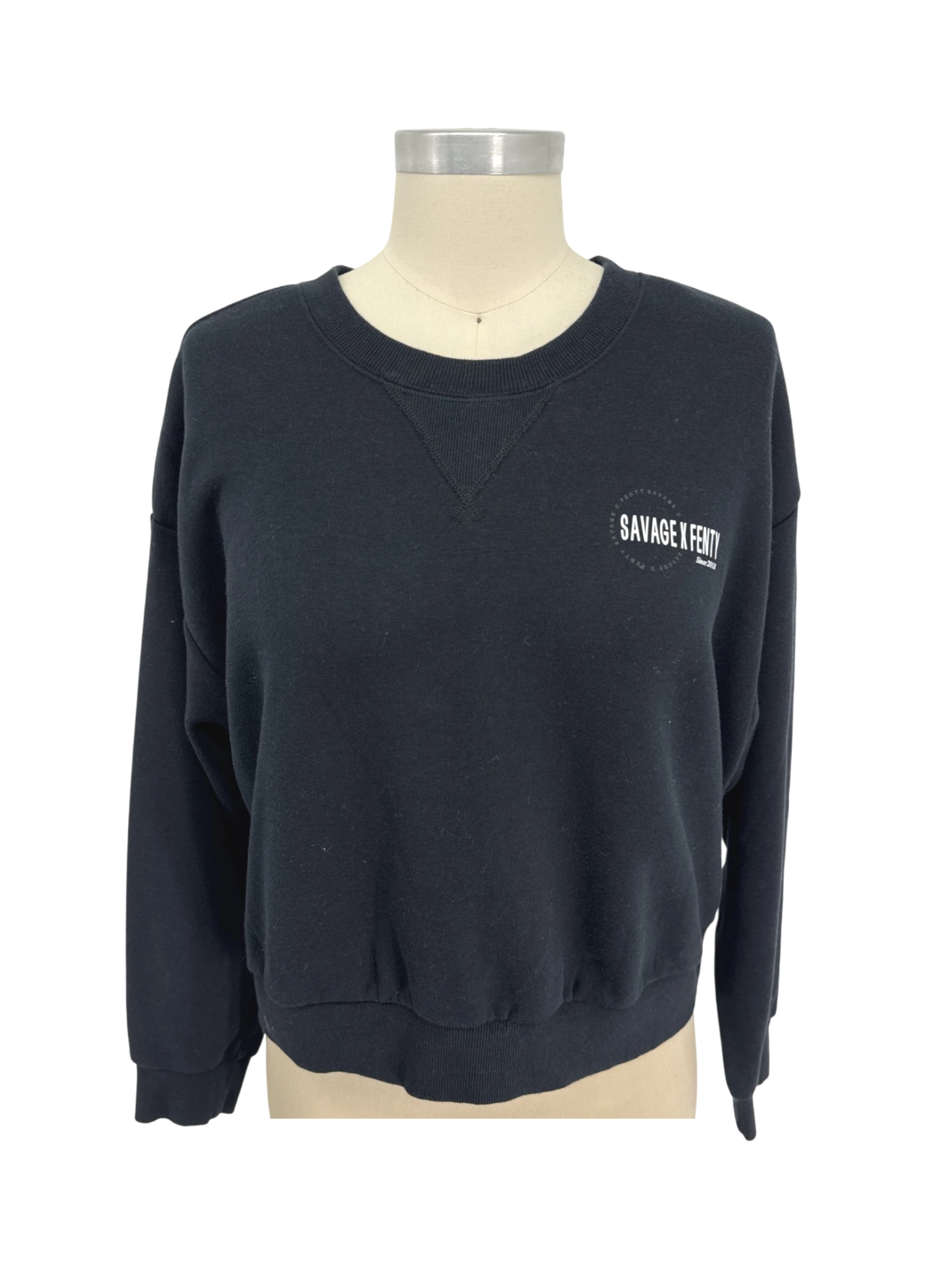 This pre-owned Savage X Fenty sweater is a comfortable and stylish addition to any wardrobe. This black pullover is made of a soft cotton-polyester blend and features the Savage X Fenty logo. Perfect for layering or wearing on its own. This sweater is a versatile piece that can be dressed up or down. Ideal for everyday wear during the cooler months.