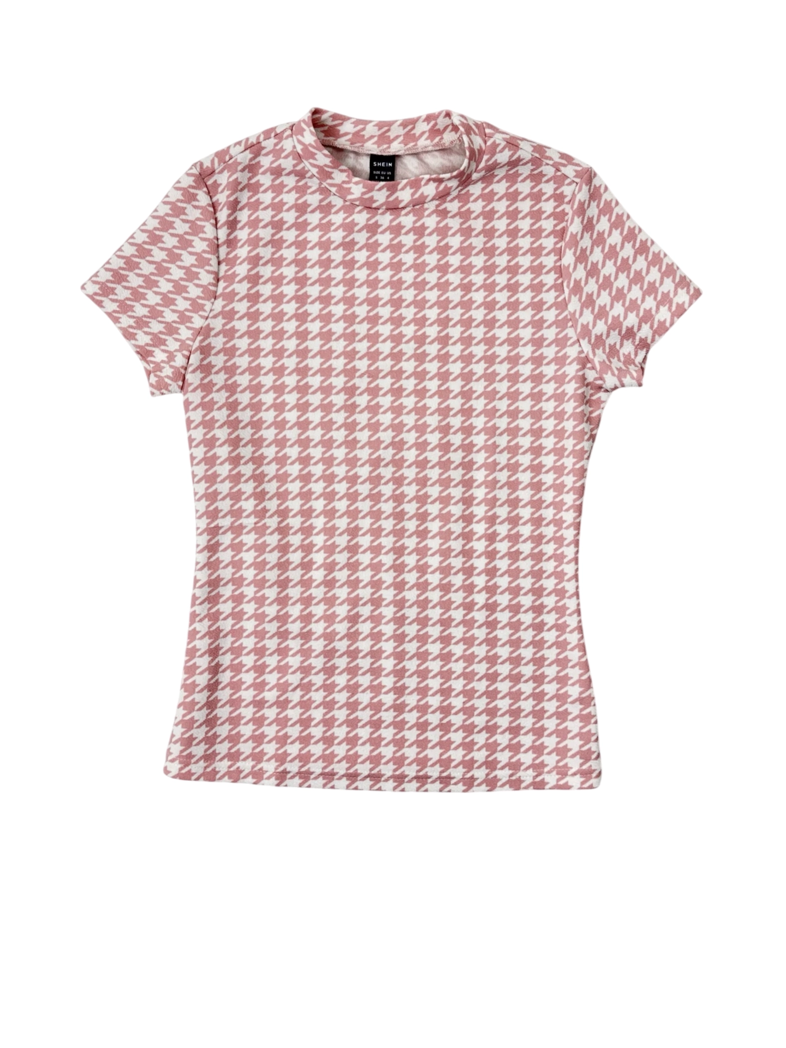 This SHEIN T-shirt is a stylish addition to any wardrobe. The top features a chic geometric print in pink, perfect for adding a pop of color to your outfit. With its flattering fit and comfortable polyester material, this pre-owned tee is ideal for casual wear. The shirt is in excellent condition and ready to be styled. Great for spring and summer days.