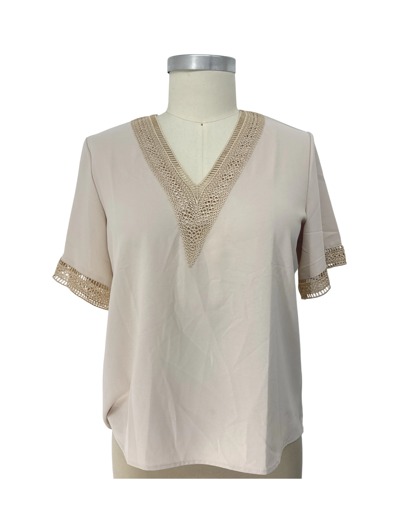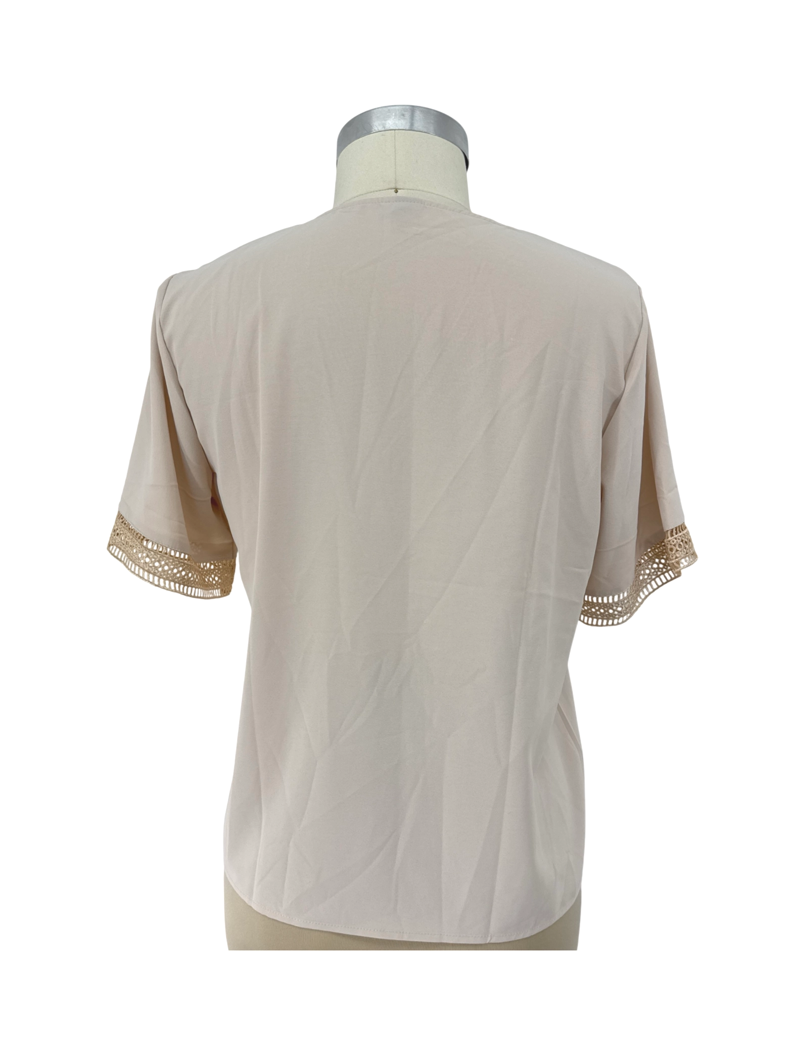 This gently used SHEIN blouse is a versatile addition to any wardrobe. It features a flattering V-neckline, short sleeves, and delicate lace detailing. The blouse is made from 100% polyester, offering a lightweight and comfortable fit. Perfect for warm weather, this top can be dressed up or down, making it ideal for casual outings or smart-casual occasions. Its neutral beige color makes it easy to pair with a variety of bottoms and accessories.