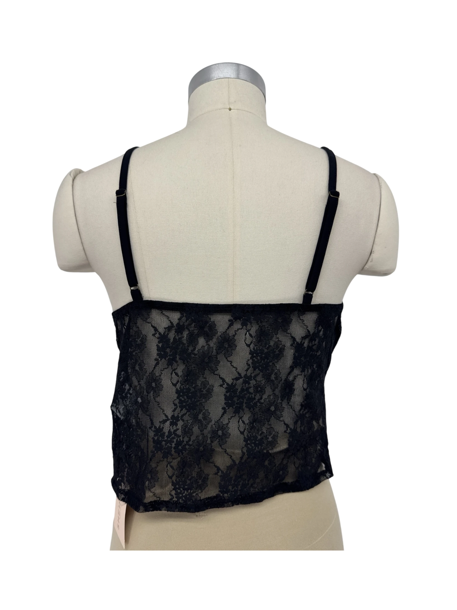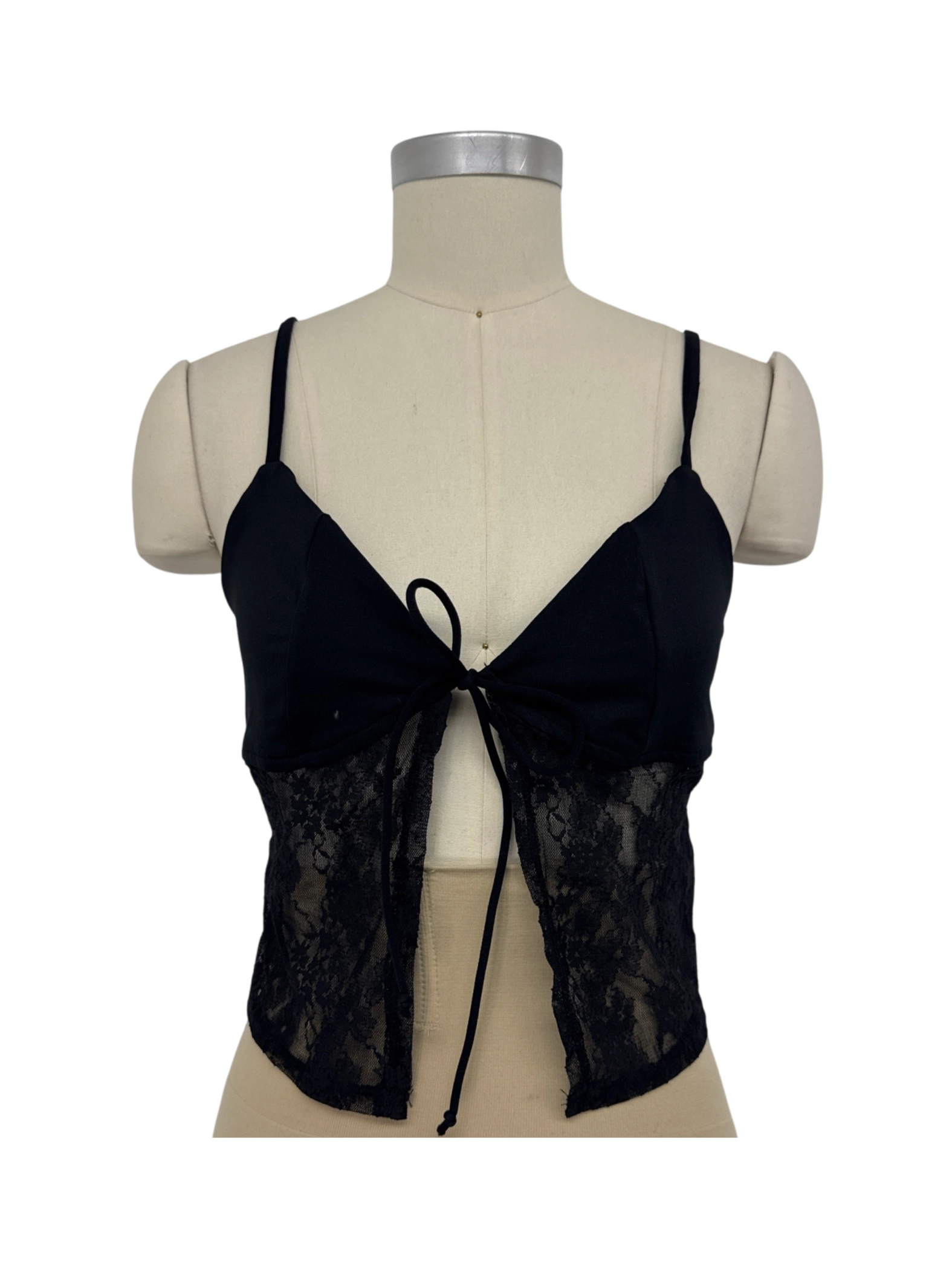 This elegant SHEIN crop top is a perfect addition to your wardrobe. Featuring a stylish V-neck and delicate lace detailing, this tank top exudes a touch of femininity. The spaghetti straps and cropped design make it ideal for warm weather. Made from a blend of polyester and elastane for a comfortable fit. A versatile piece for pairing with high-waisted jeans, skirts, or shorts, this top is a stylish choice for any occasion. This is a second-hand product.