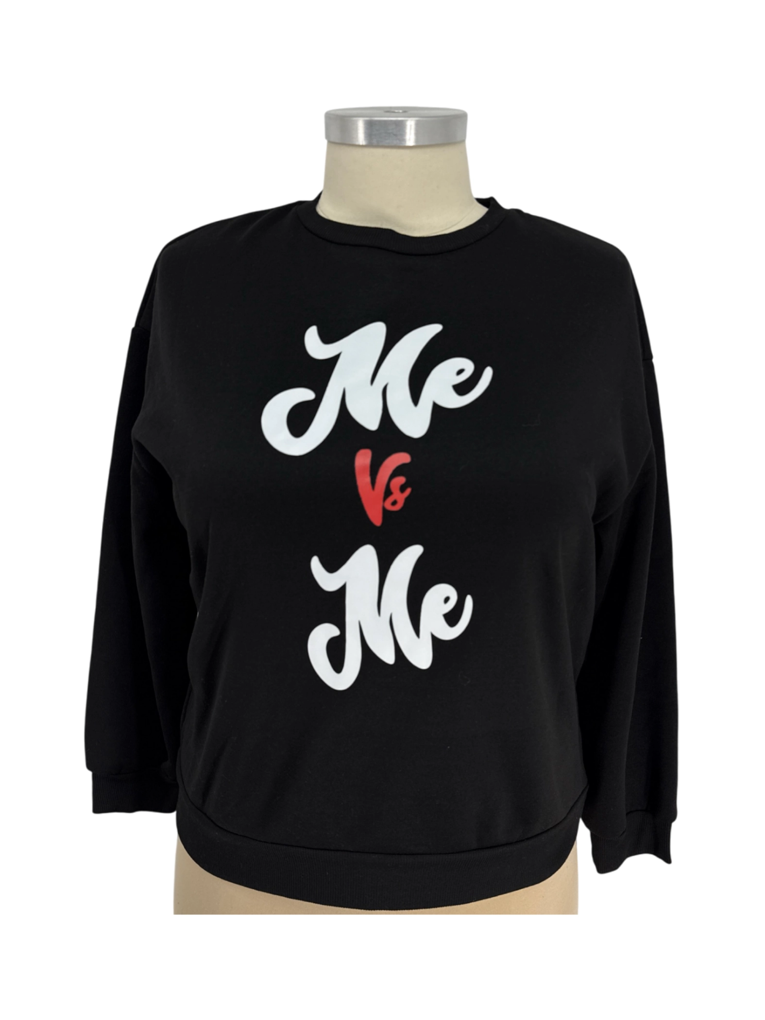 Elevate your casual wardrobe with this pre-owned SHEIN sweater. This stylish top features a unique 'Me vs Me' design in white on a classic black backdrop. Crafted from comfortable polyester, it offers a relaxed fit, perfect for layering or wearing on its own. Ideal for cooler seasons, this sweater is a versatile addition to any closet, offering both comfort and a touch of personality. A perfect blend of style and affordability.