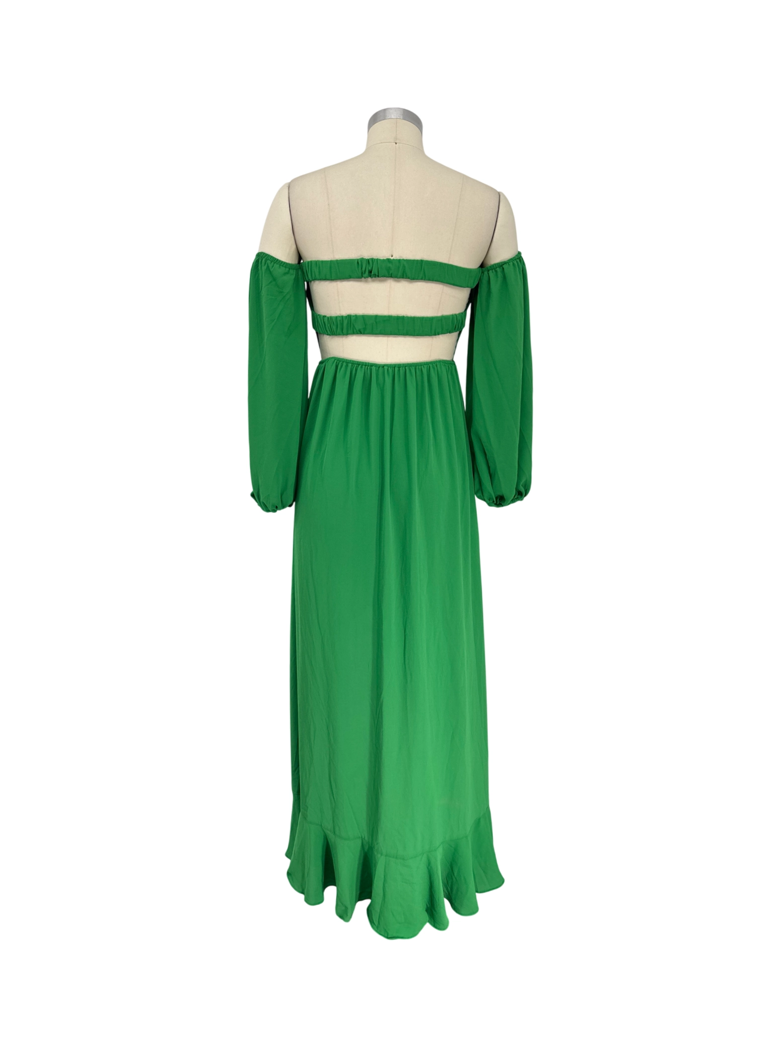 This stunning pre-owned SHEIN maxi dress is a head-turner! Featuring a vibrant green hue, this dress is perfect for warm weather or a night out. The dress has a flattering off-the-shoulder design, cut-out detailing, and a flowy skirt. Made from lightweight and comfortable polyester, it's a stylish and versatile addition to any wardrobe. This SHEIN dress is a great find. Great for any occasion.