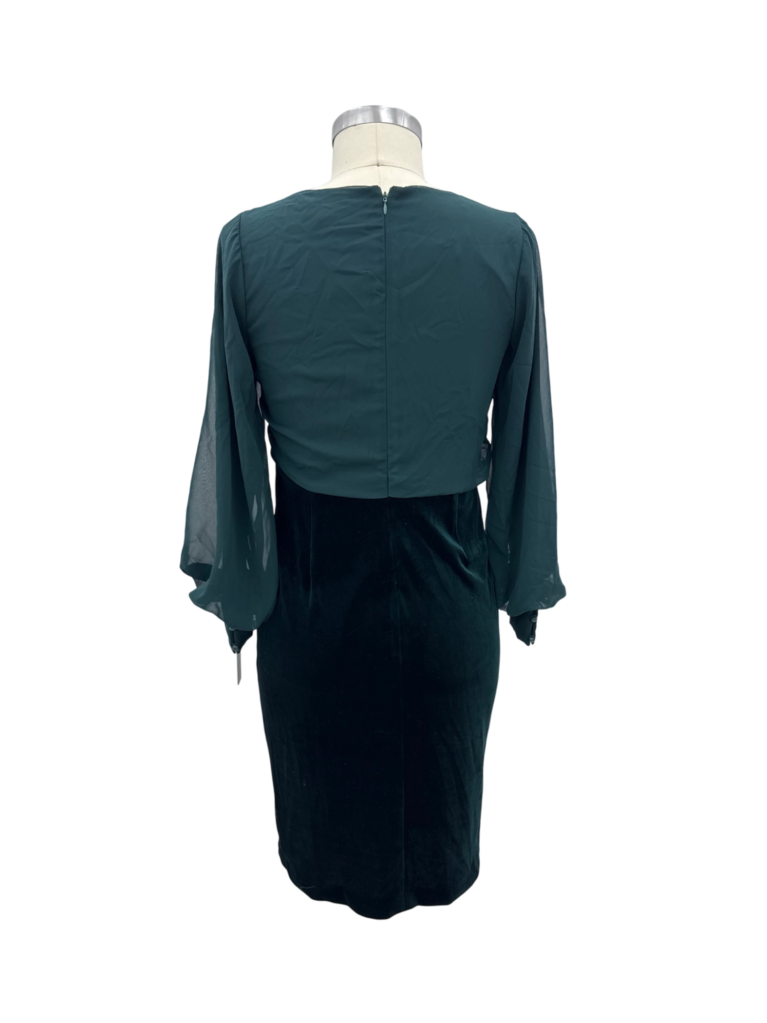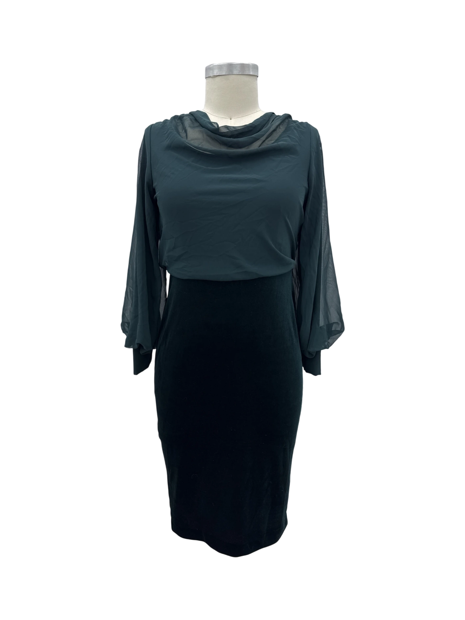 This elegant pre-owned Shelby Nites dress is perfect for any cocktail party or special occasion. Crafted from a blend of polyester and spandex, this midi-length sheath dress features long sleeves and a sophisticated round neckline. The dress offers a comfortable fit and a flattering silhouette. Made in Vietnam, this dress is in excellent condition and ready to be the highlight of your wardrobe.