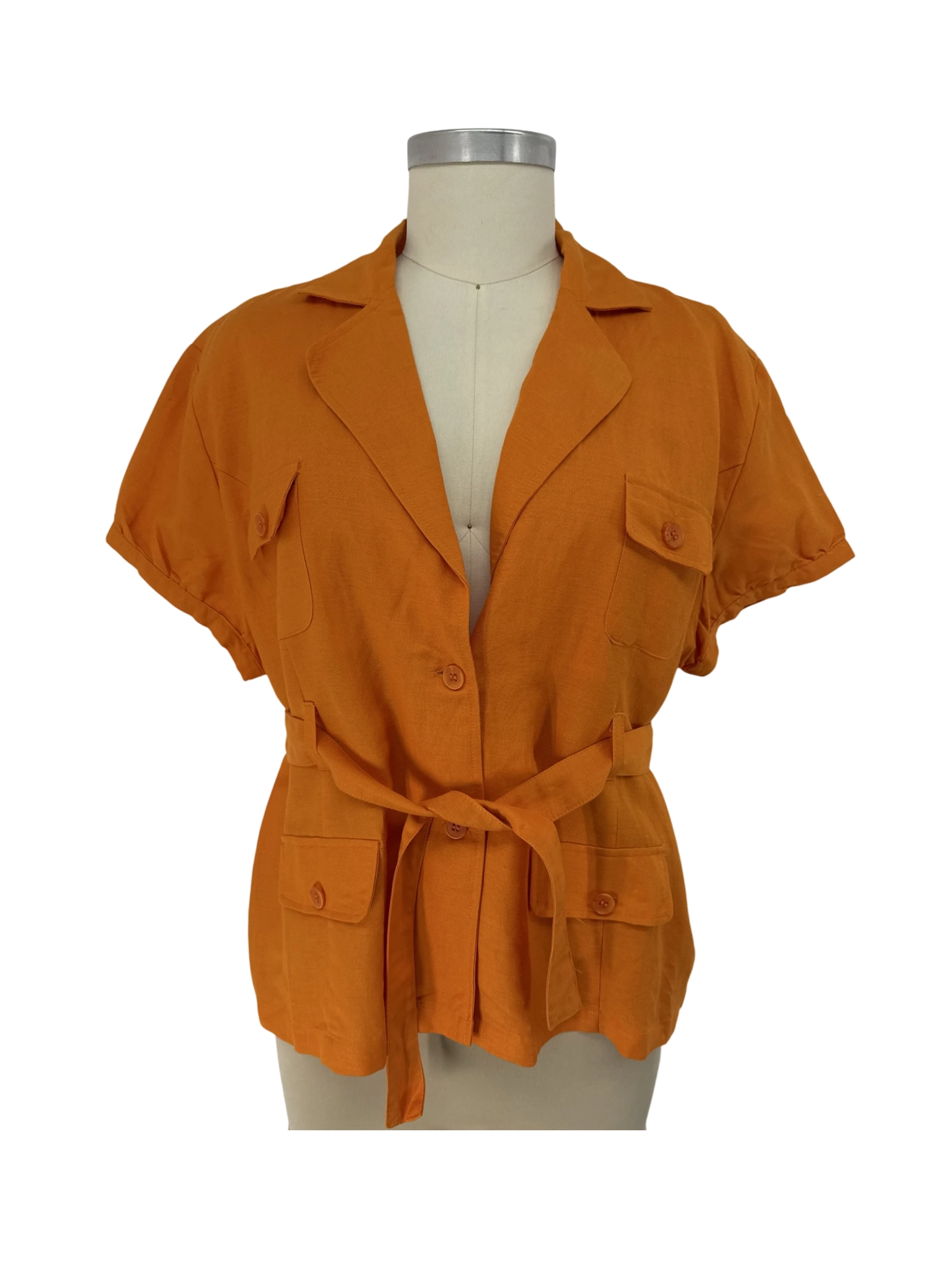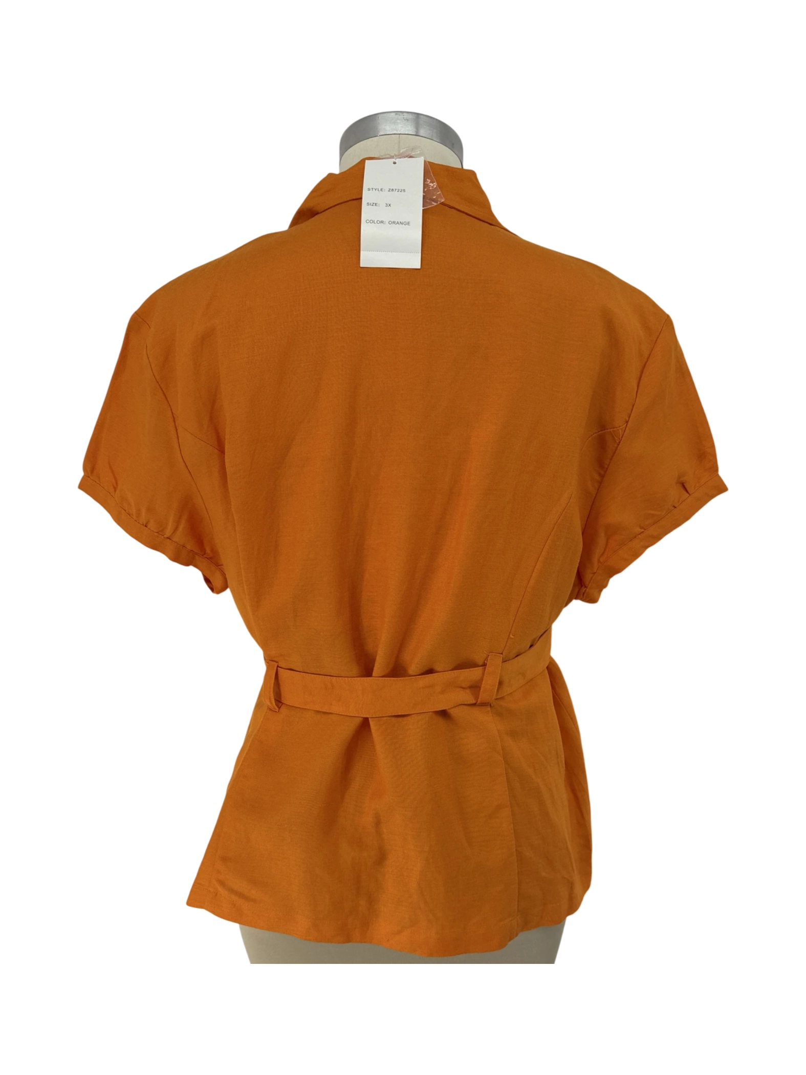 This Sherry Taylor blouse is a vibrant and stylish addition to your wardrobe. This pre-owned top features a unique belted design, enhancing your silhouette with its flattering cut and chic appeal. Made with a comfortable blend of Ramie, Rayon and Polyester, it offers both style and ease of wear. Perfect for Spring and Summer. Its bright orange hue is perfect for any occasion. This blouse exudes timeless elegance, making it a perfect choice for a fashion-forward look.