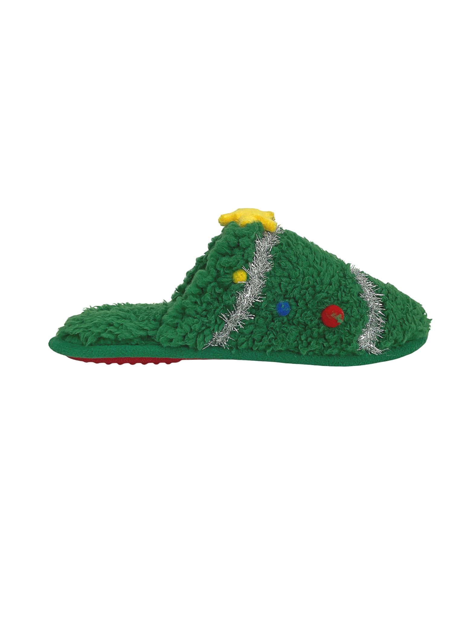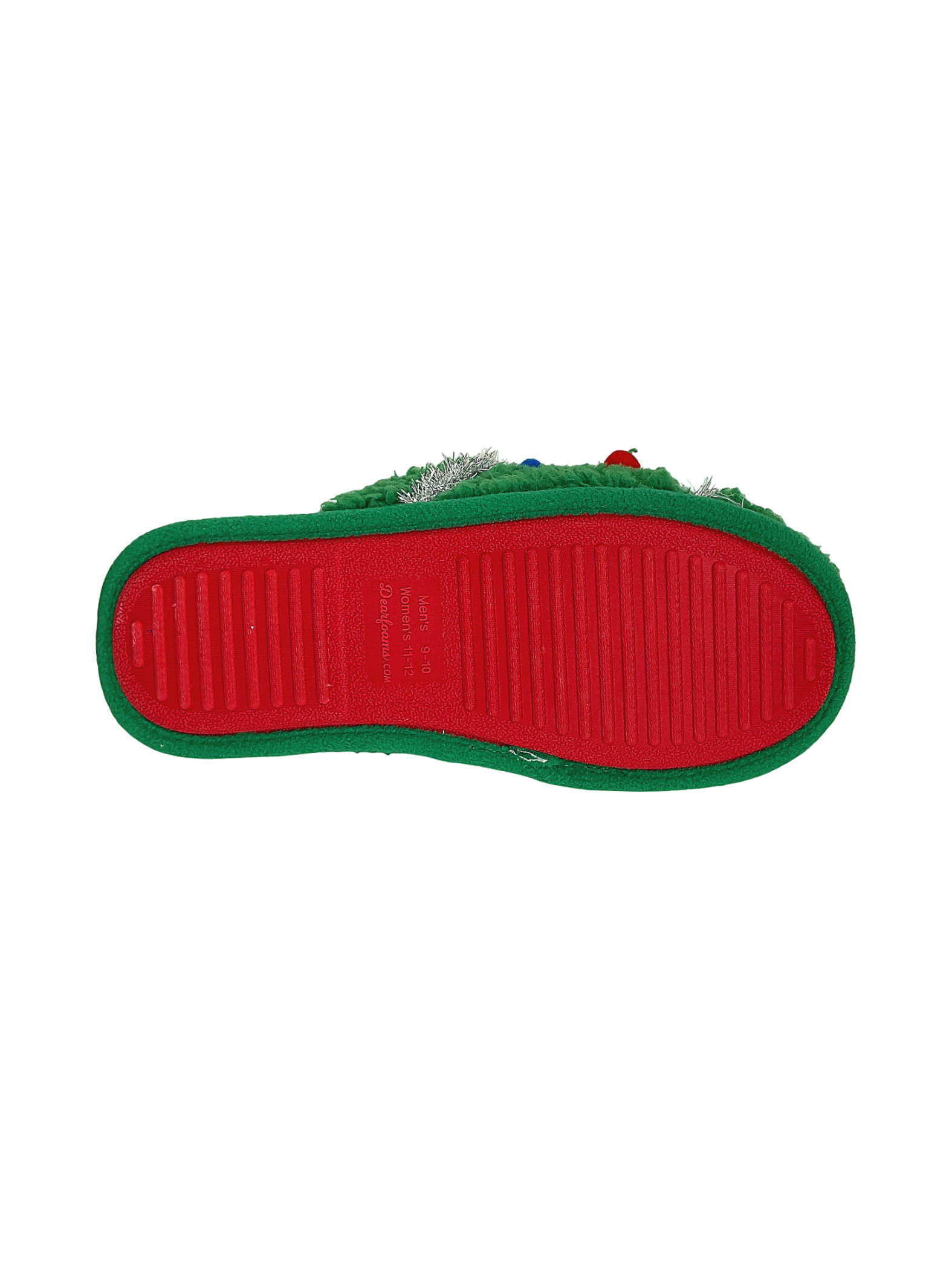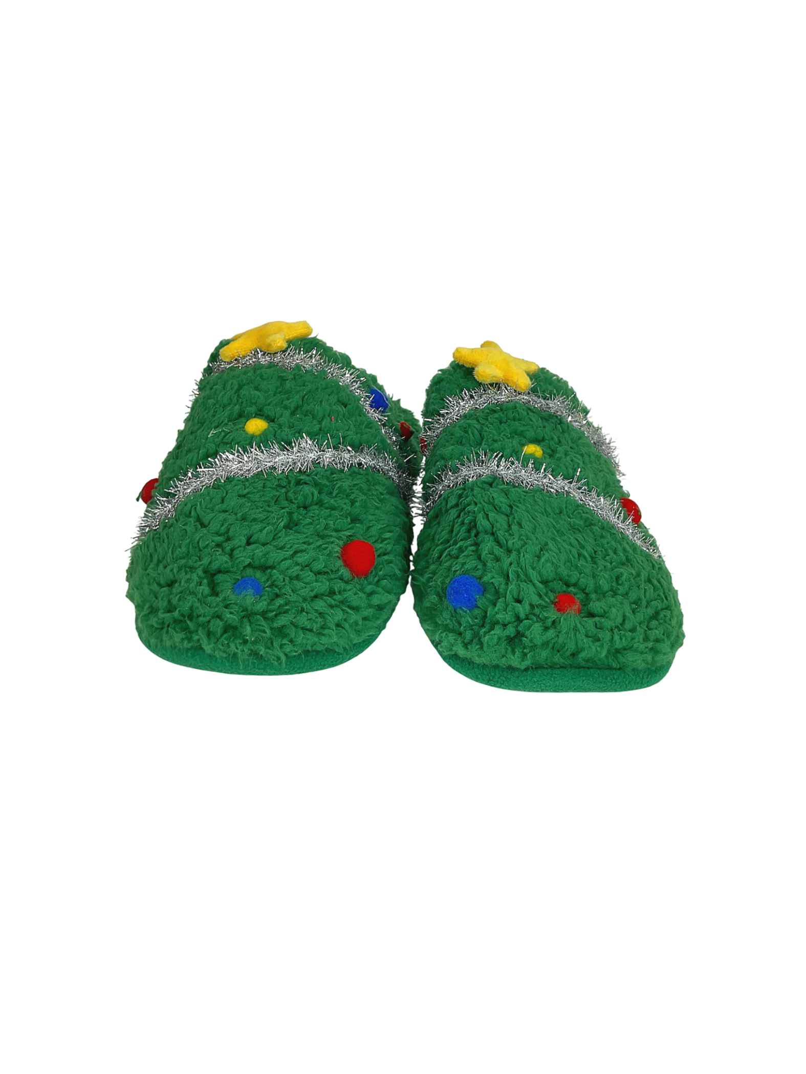 These are unisex Christmas slippers designed in the shape of a Christmas tree. They are made of soft, plush green material that resembles tree branches and are decorated with silver tinsel and colorful "ornament" accents. The top of the "tree" has a yellow star. These slippers are intended for indoor use and provide warmth and comfort.