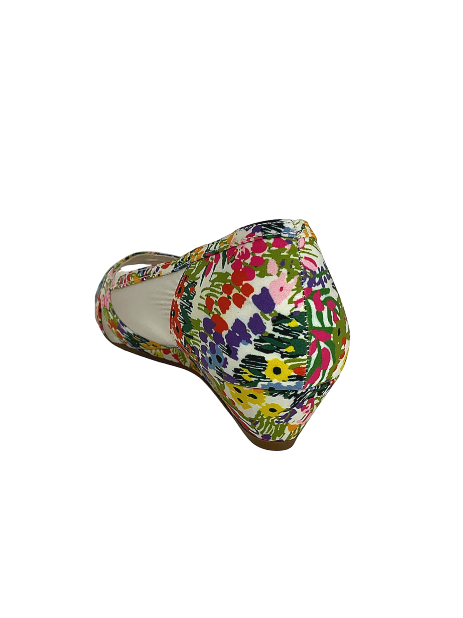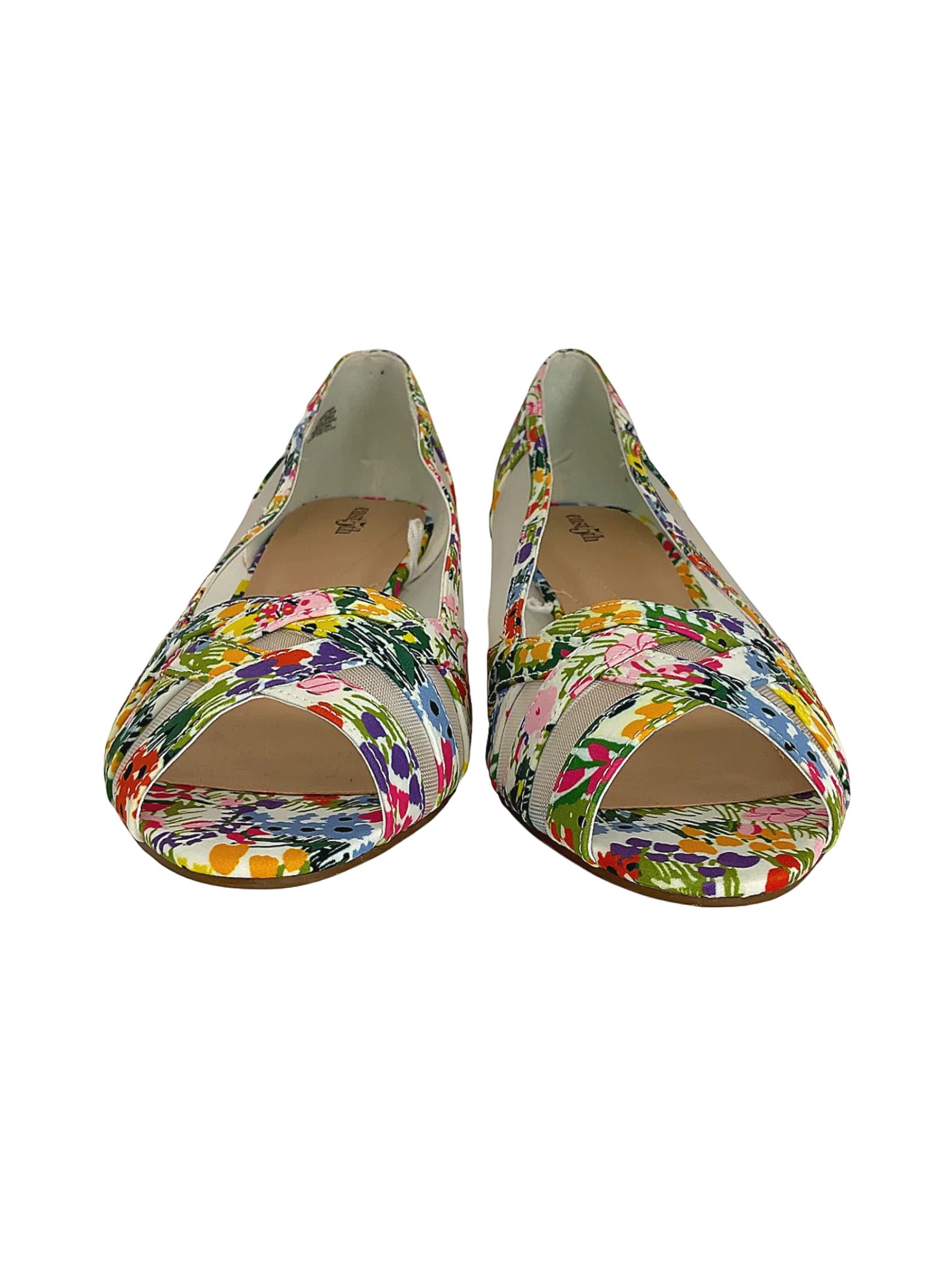 East 5th Rani slip-on shoes are women's shoes in size 11 that feature a floral print, peep-toe design, and slip-on style.