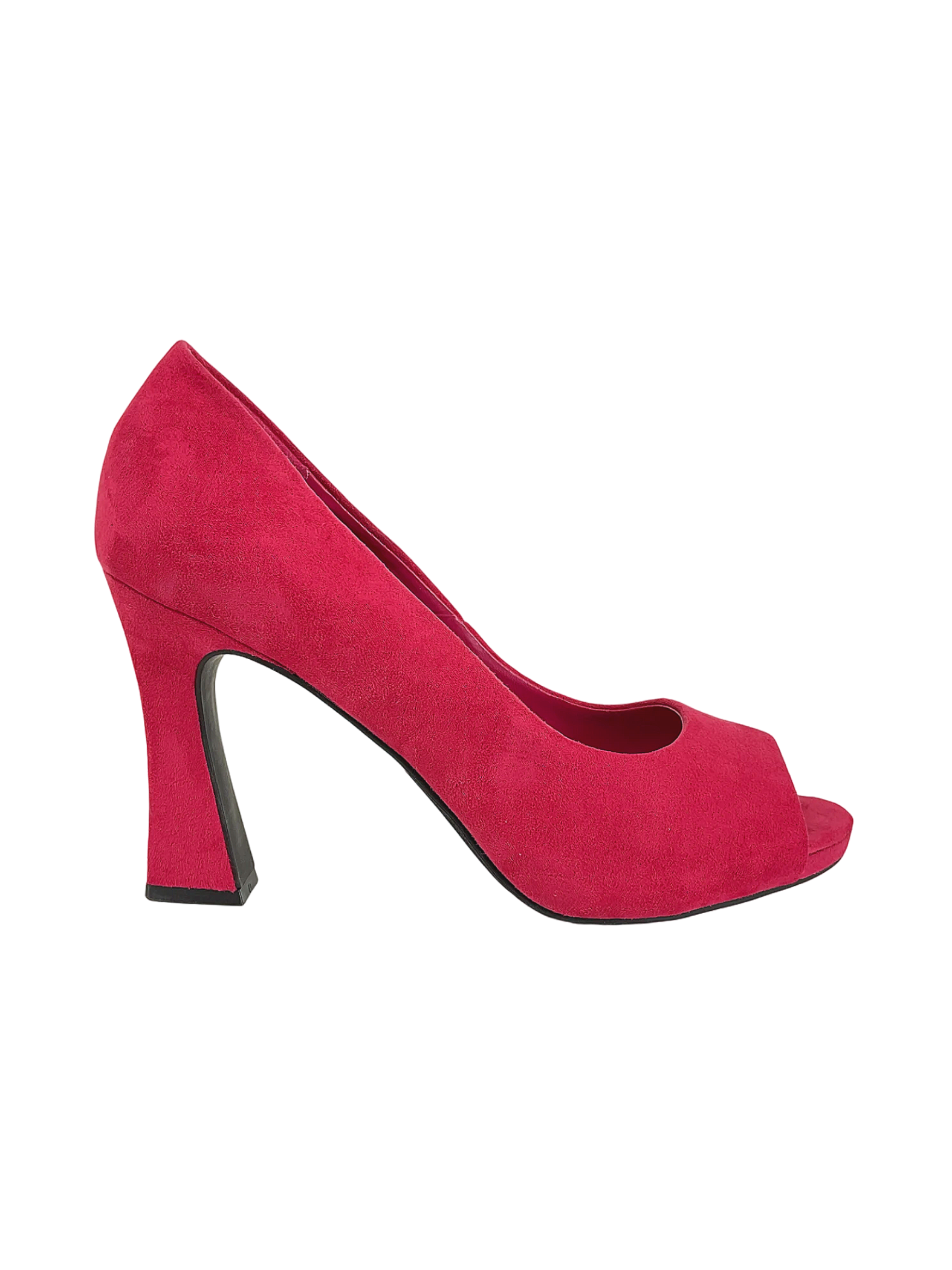 women's peep-toe heels in a bright pink suede material. These heels feature a classic pump style with an open toe, allowing the toes to be seen. The heels have a flared heel and a slingback strap with a buckle for adjustability