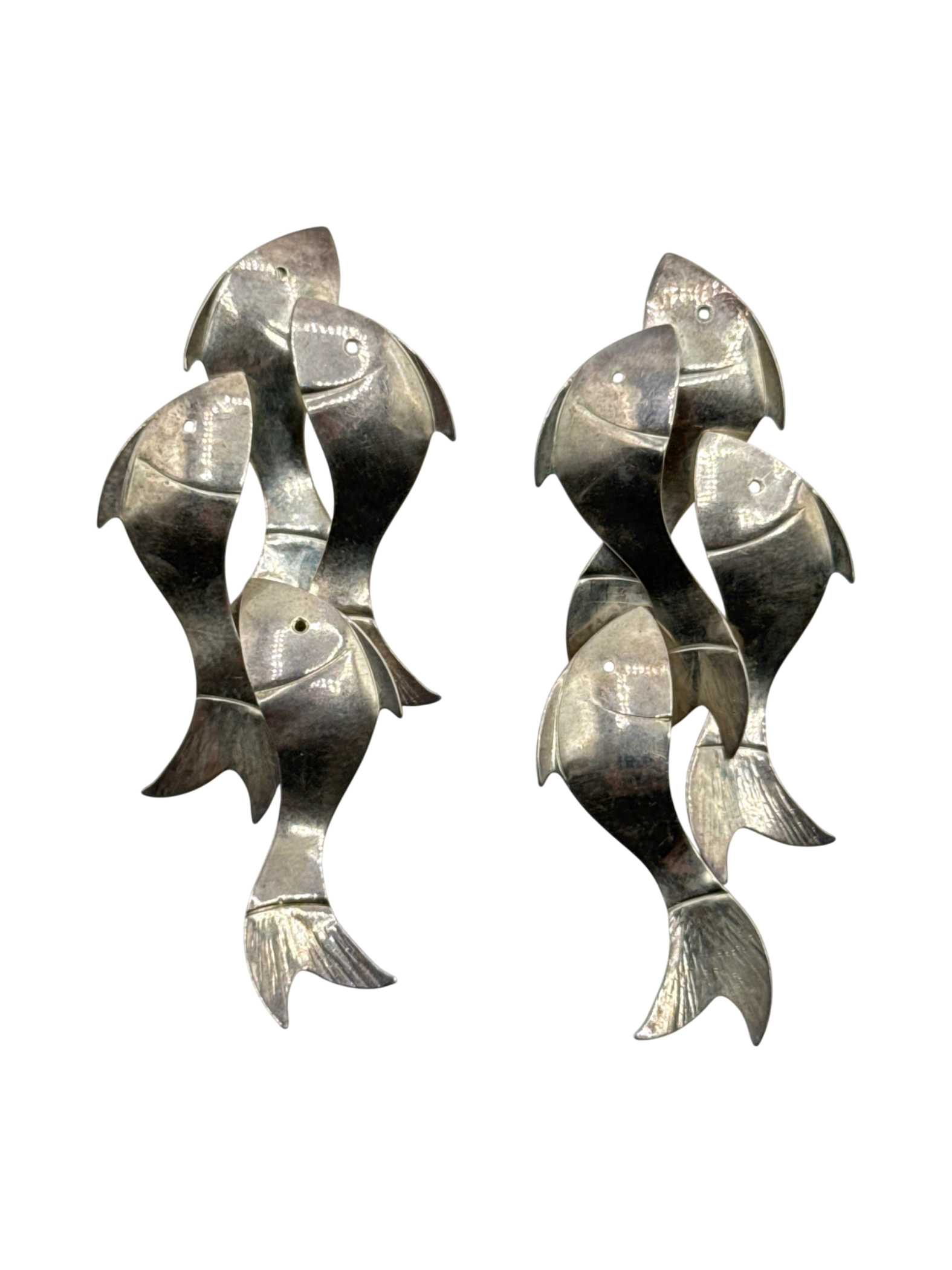 Unique vintage silver-toned fish earrings, perfect for adding a touch of whimsy to your look. These eye-catching drop earrings feature an intricate design of fish, creating a stylish statement piece. The earrings are made of metal, showcasing detailed craftsmanship and offering a unique addition to any jewelry collection. Ideal for casual wear or a special occasion, they add a splash of artistic flair and personality to your style.