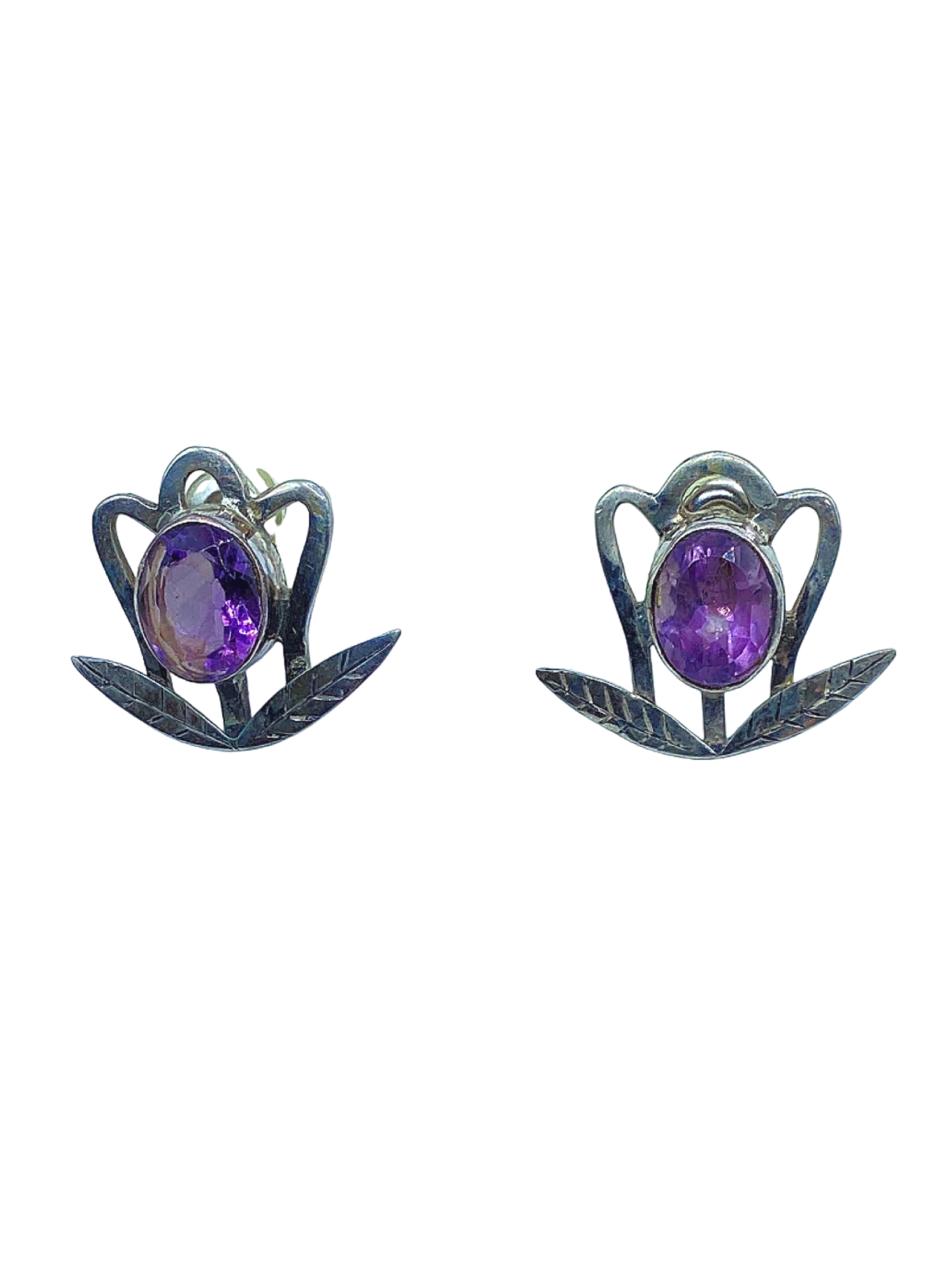 The earrings feature a distinctive floral or leaf design around the oval-cut amethyst, which adds an elegant and nature-inspired element. This design is perfect for individuals looking for a combination of classic charm and unique style.