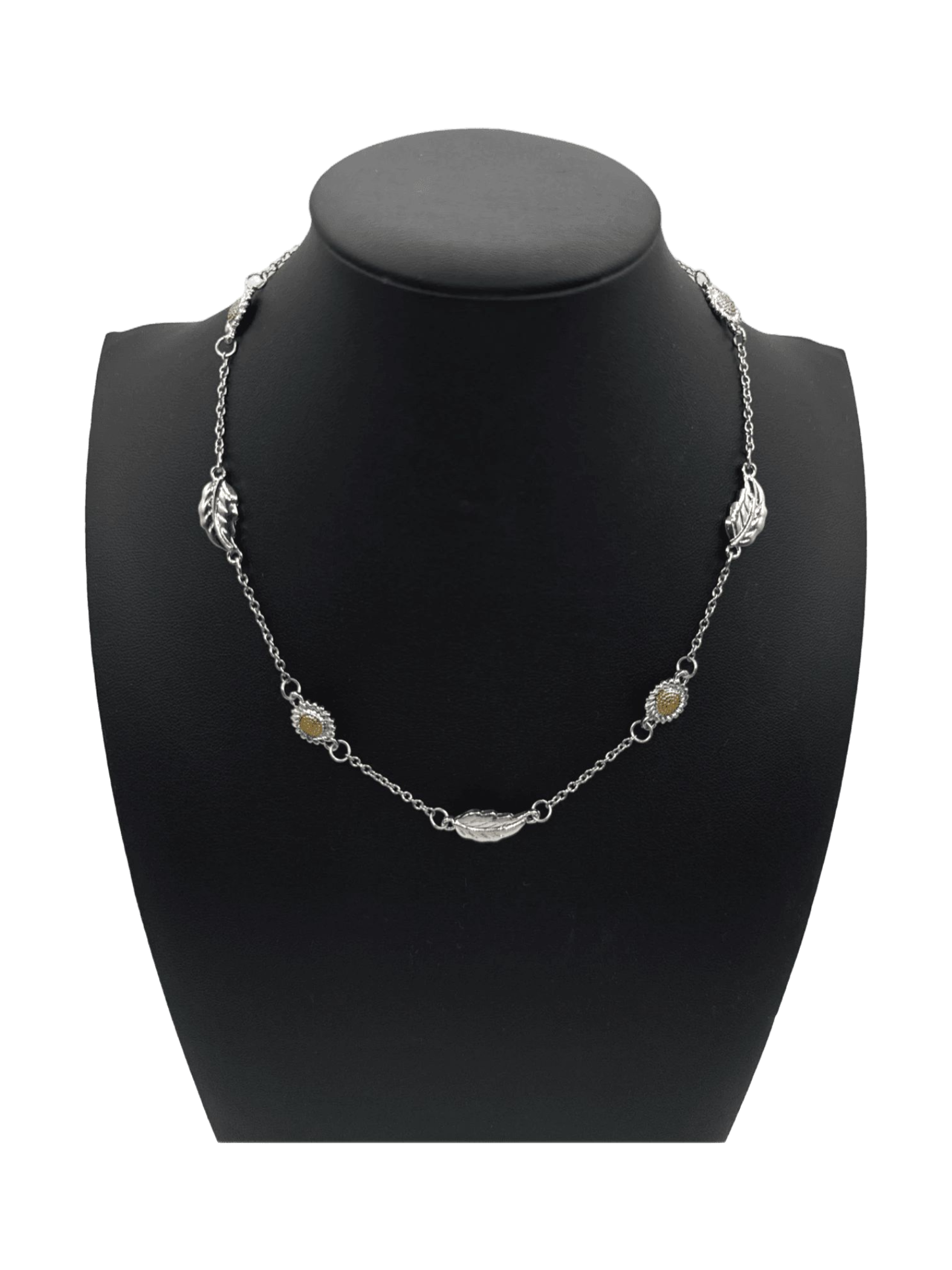 Silver-toned 14.5in necklace featuring leaf-shaped charms and sunflowers with a gold-toned center.