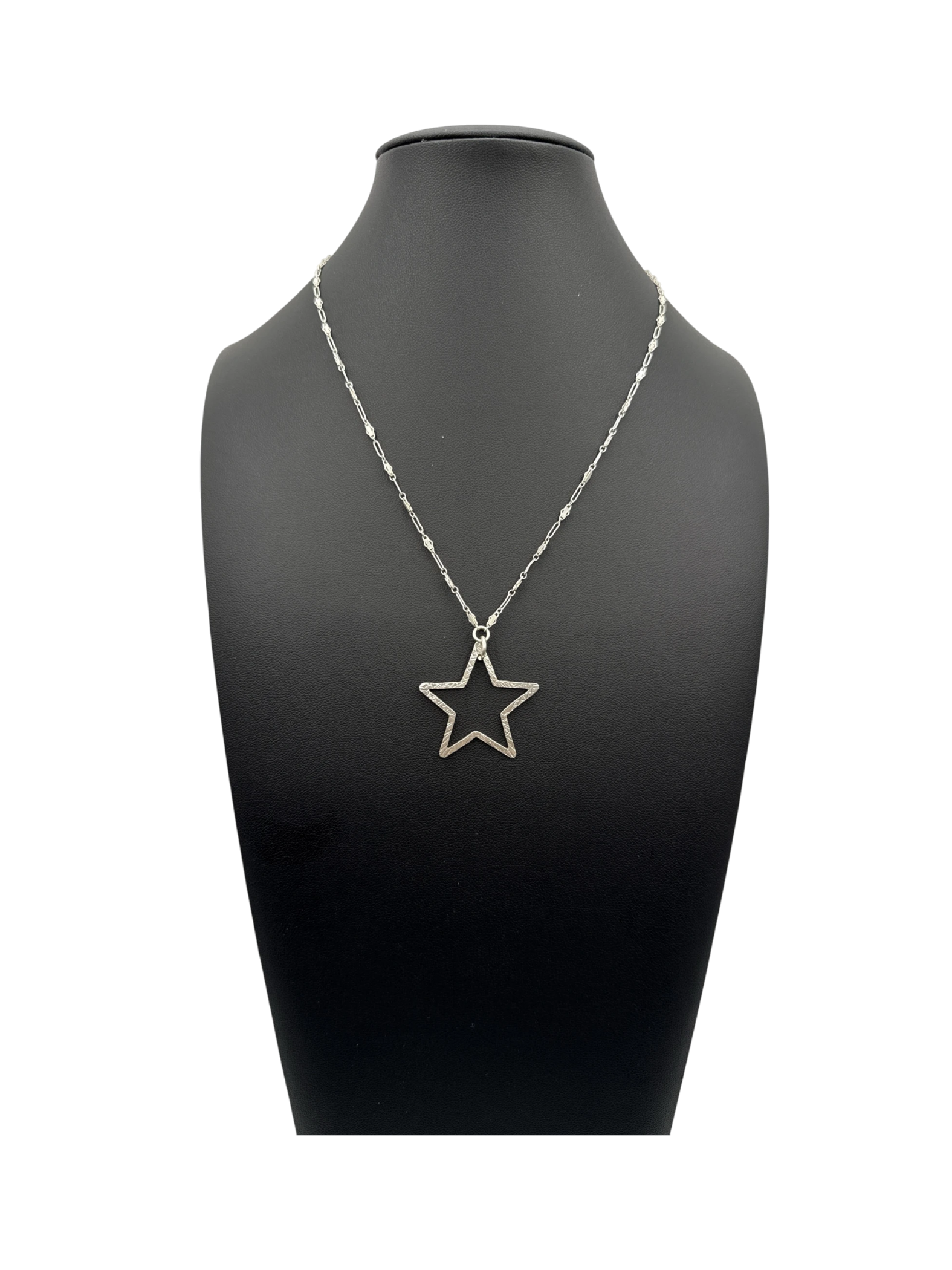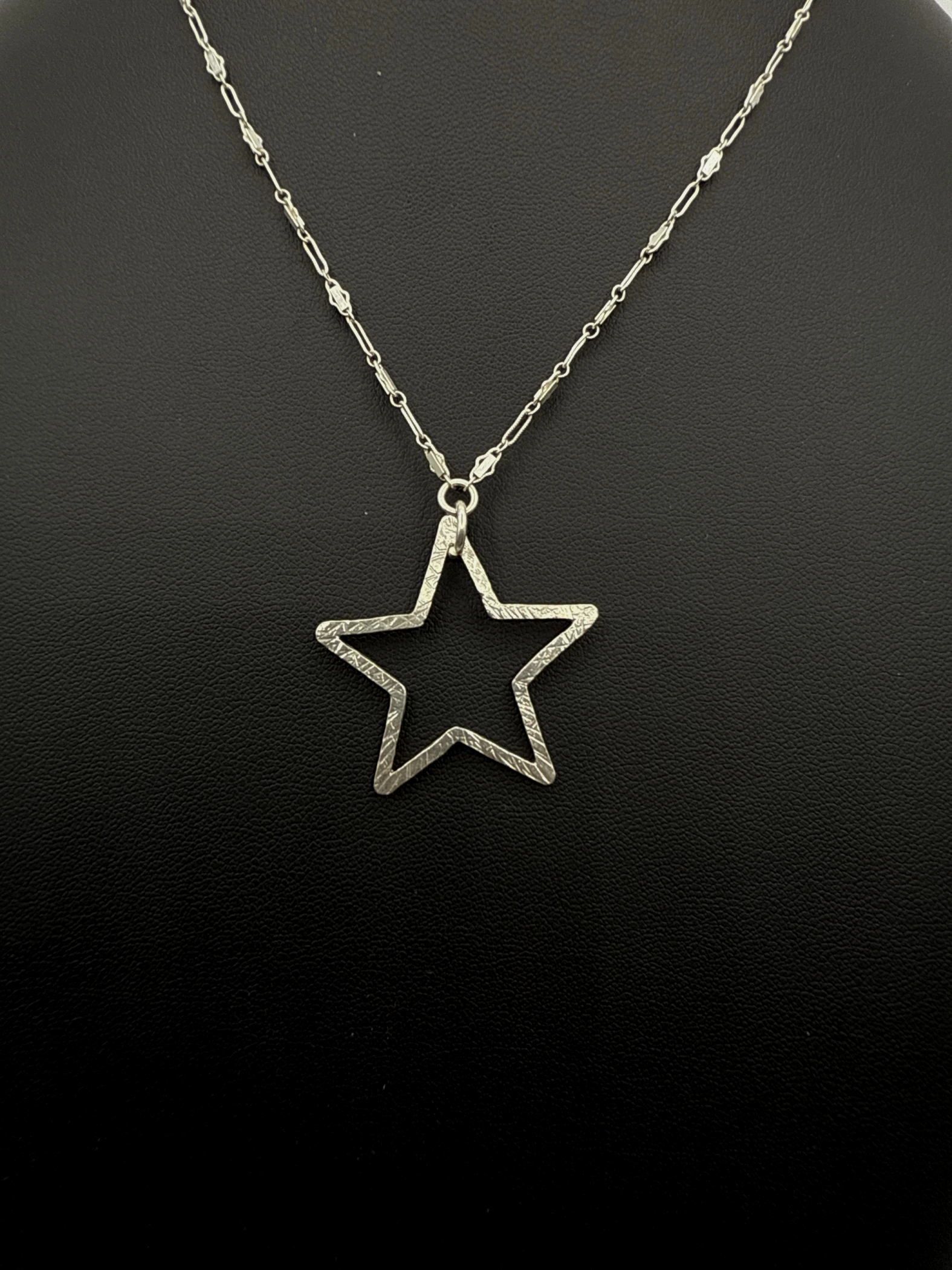 A silver necklace in 2000s style with a hollow star pendant and a toggle clasp.