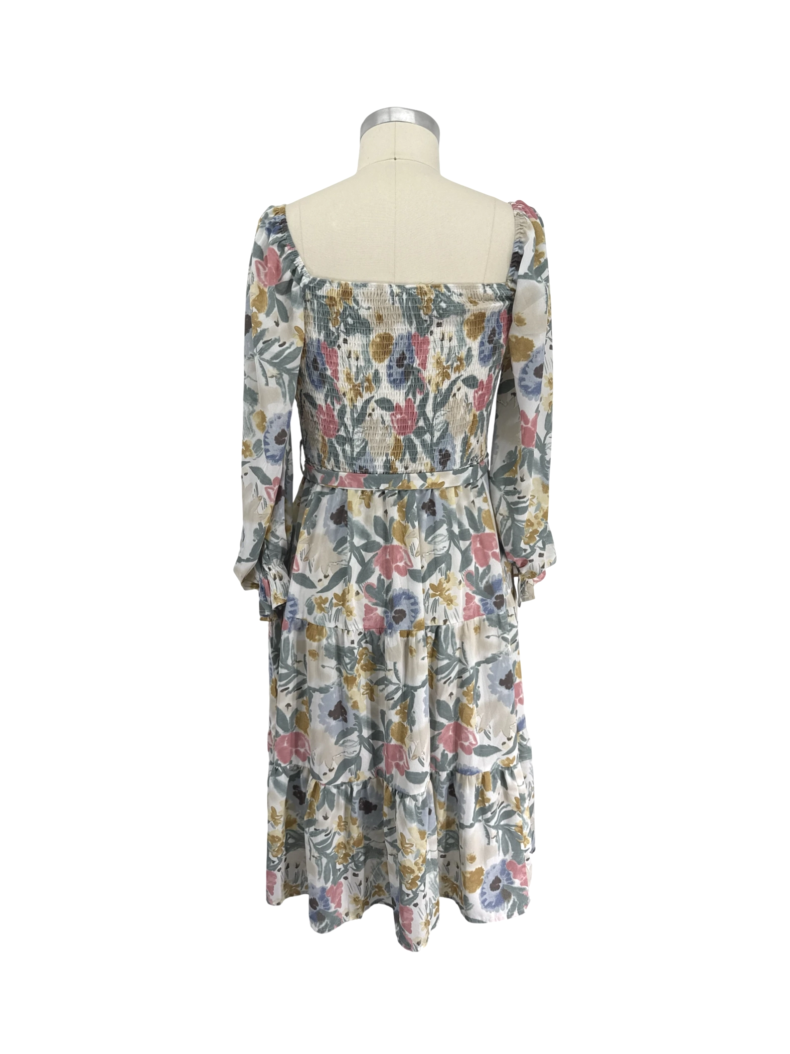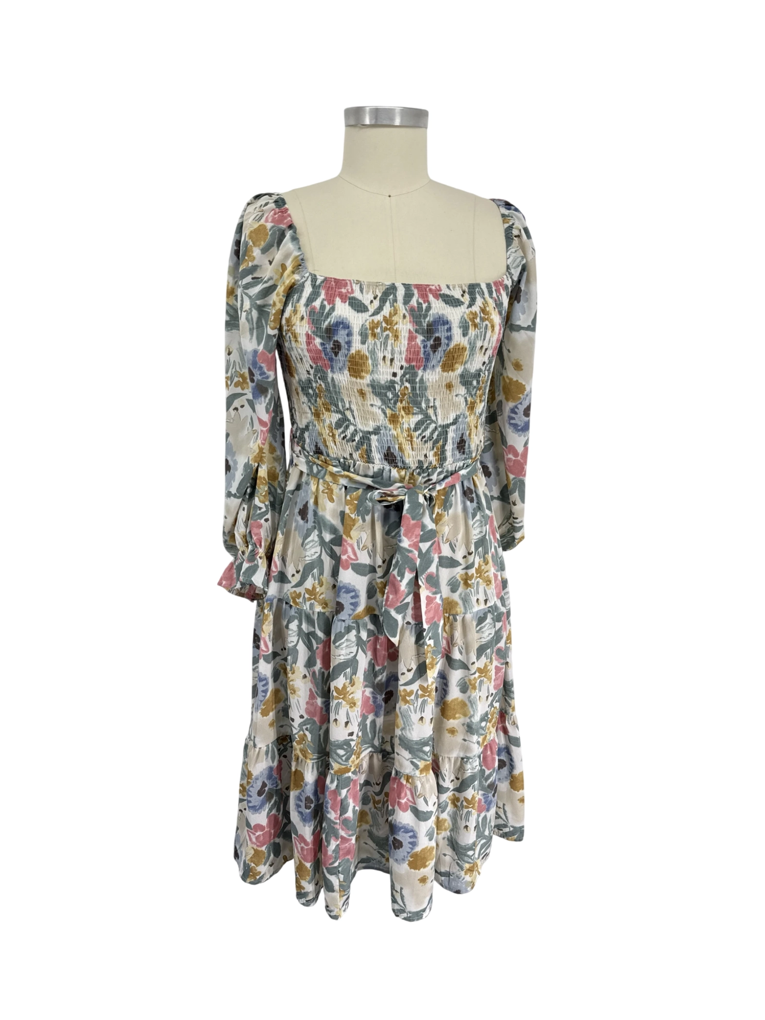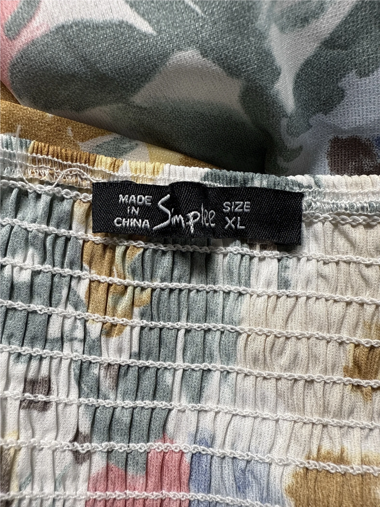 This pre-owned Simplee floral A-line dress is perfect for spring and summer. Crafted from a comfortable polyester, this midi dress features a flattering square neckline and long sleeves. The dress is adorned with a beautiful floral print, making it ideal for casual outings. The dress has a smocked bodice, and a tie waist to accentuate the figure. Perfect for adding a touch of elegance to your everyday wardrobe. An excellent, pre-owned option. The size is XL.