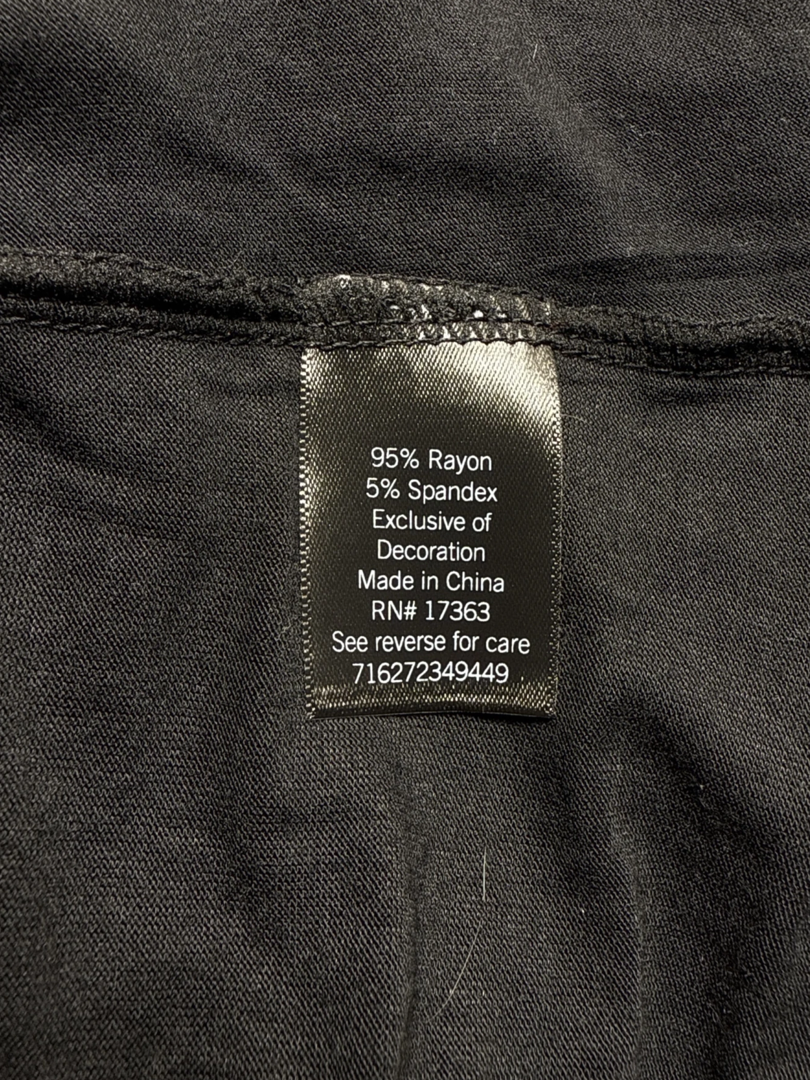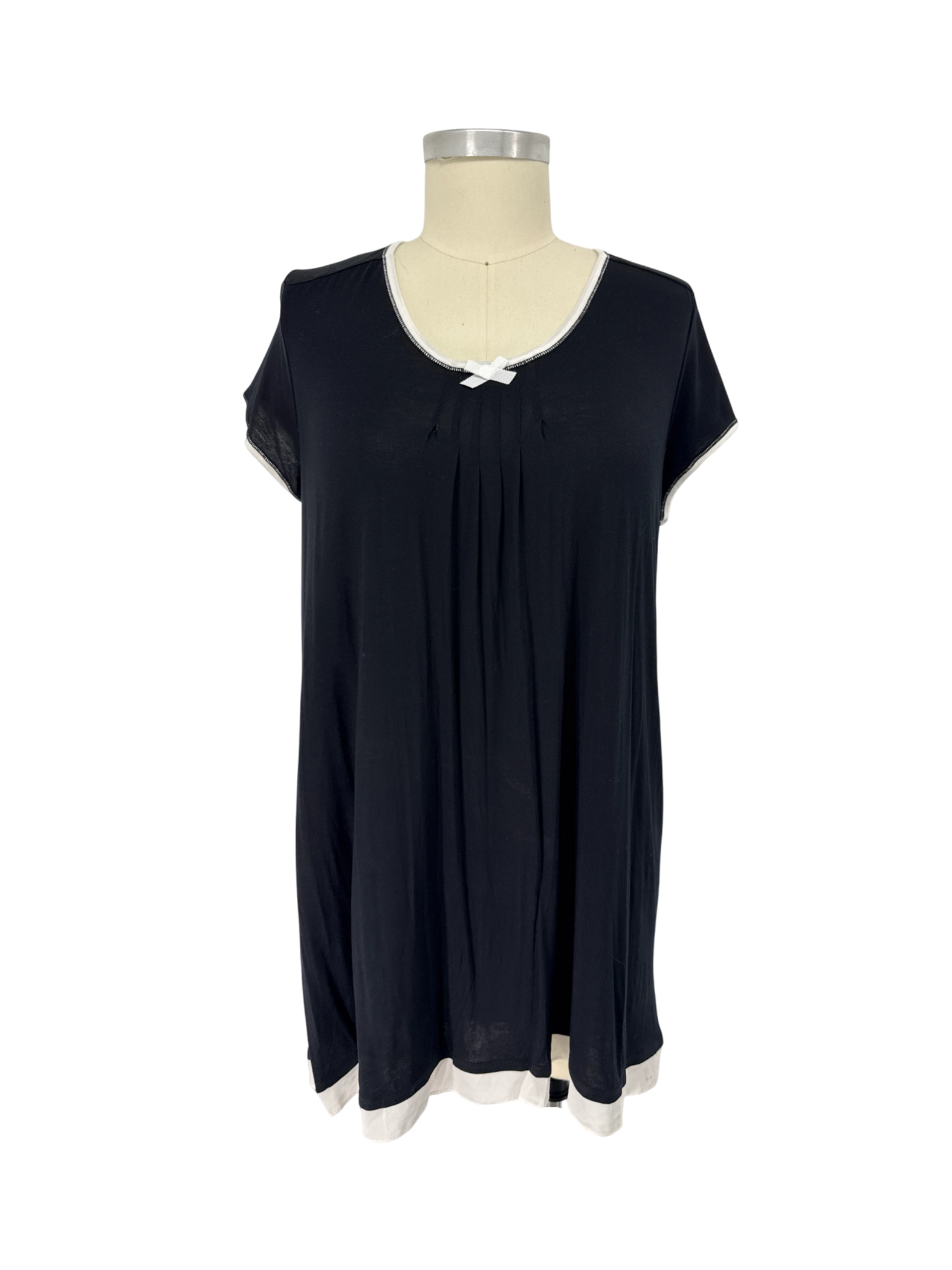 This gently used Simply Vera Vera Wang nightgown offers both comfort and style. Crafted from a soft rayon blend, this nightgown features a classic black design with white trim details, the perfect sleepwear. The flattering cut and lightweight fabric make it ideal for warm nights or a cozy evening at home. This nightgown combines elegance with everyday wear. A must-have addition to your collection. Pre-owned and ready to bring you sweet dreams.