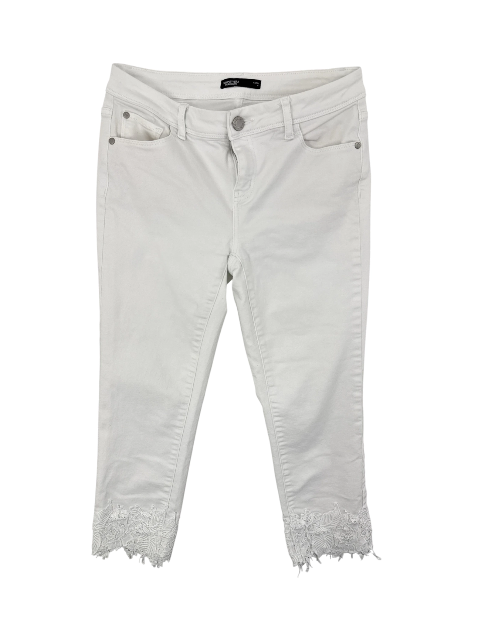 Elevate your casual wardrobe with these pre-owned Simply Vera Vera Wang capri jeans. These stylish denim pants feature a flattering skinny leg fit, perfect for a chic and comfortable look. The crisp white color makes them versatile for any outfit. Crafted from a blend of cotton, rayon, spandex and polyester for a great stretch and feel. Adorned with a unique lace detailing at the hem, these jeans add a touch of sophistication to your everyday style. Don't miss out on this must-have addition to your collection!