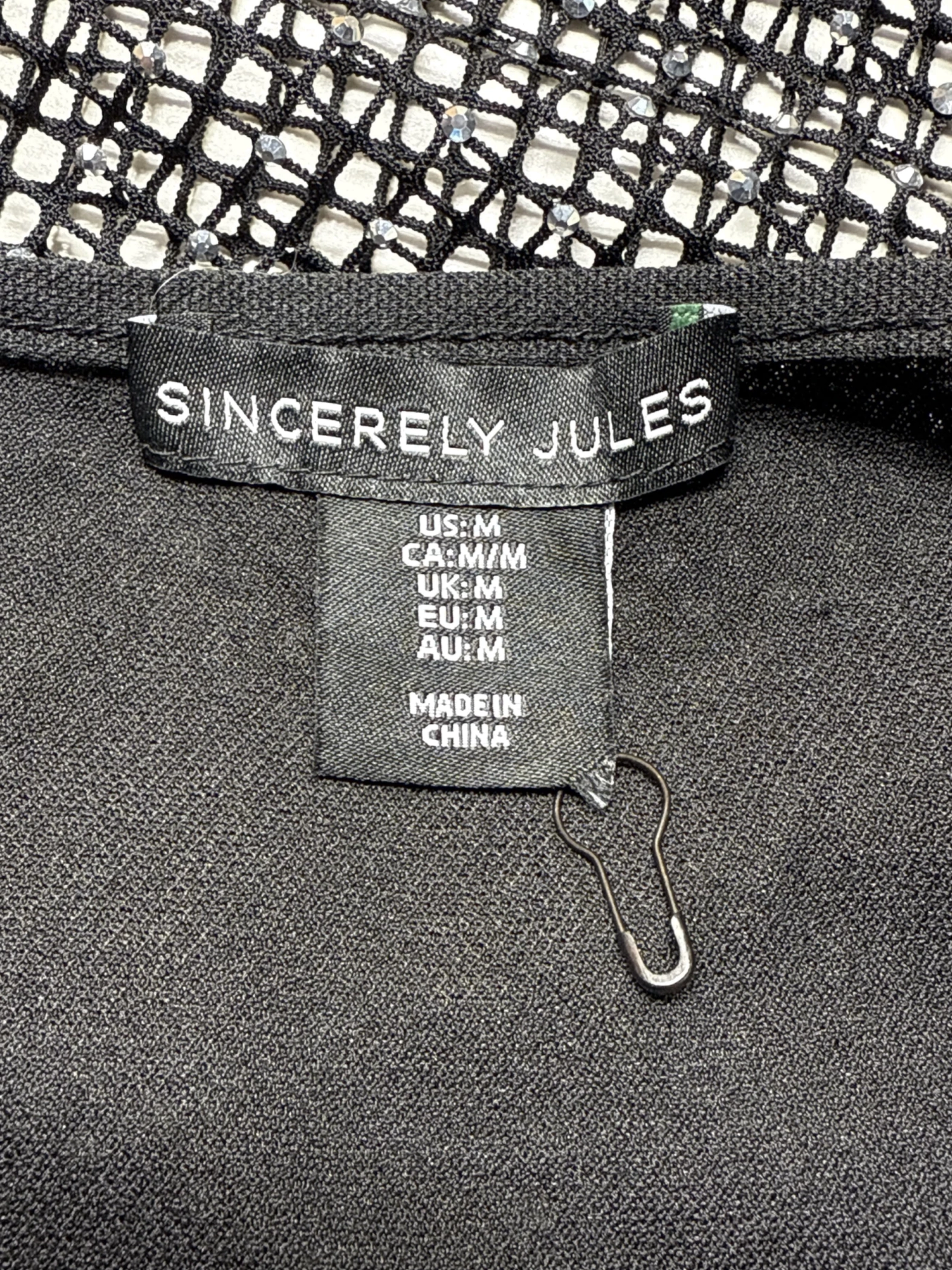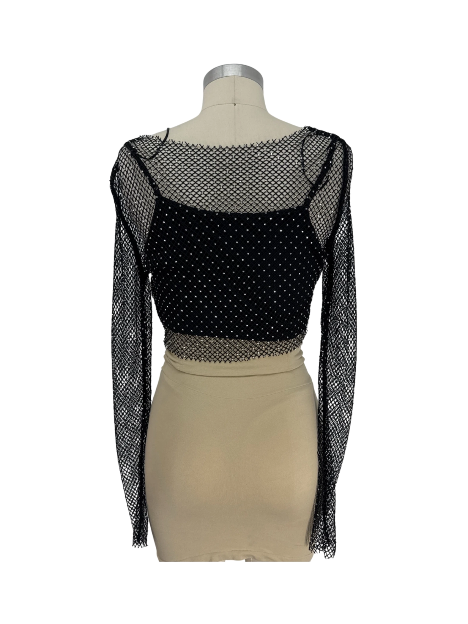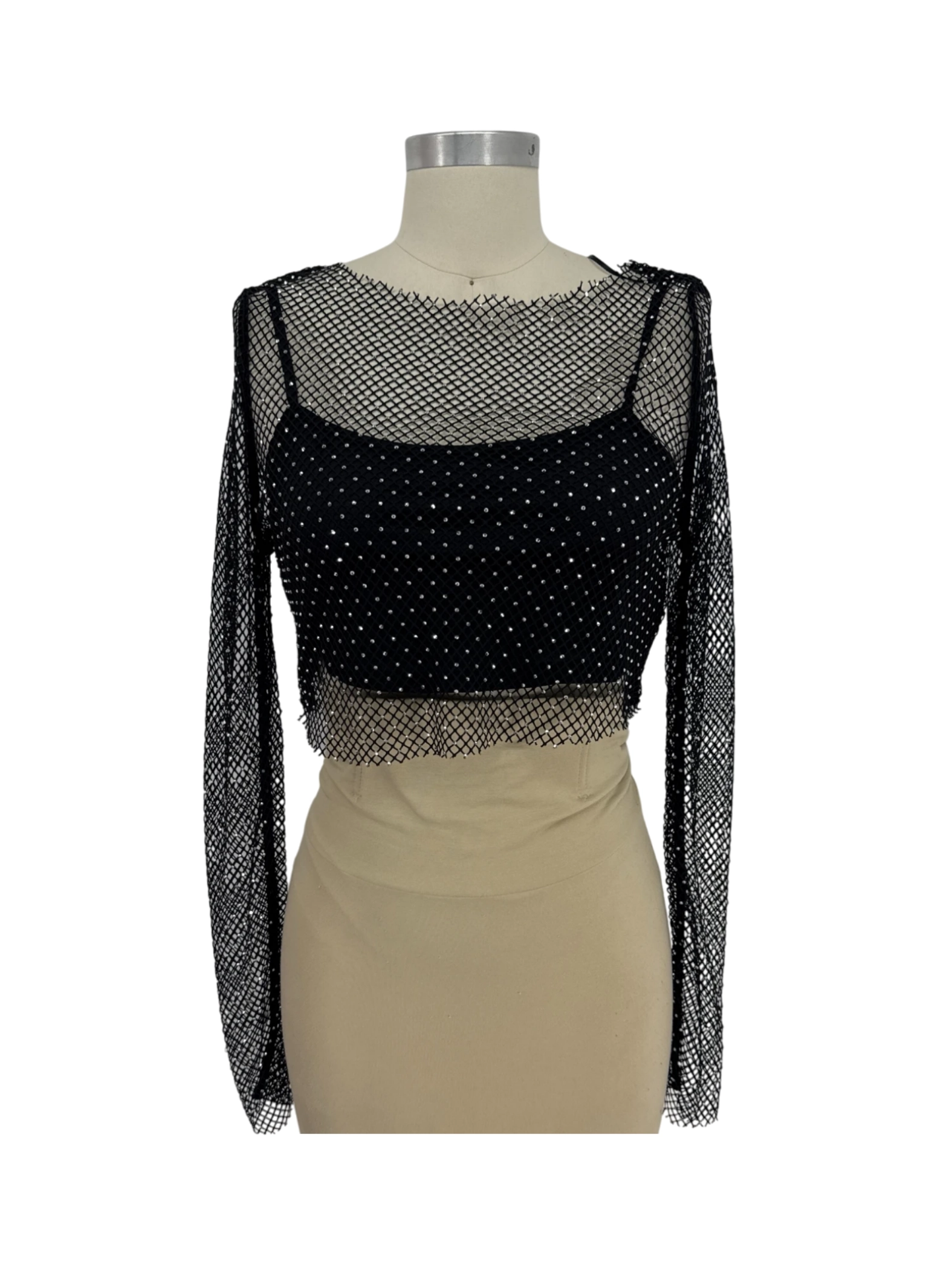 This is a pre-owned women's cropped tank top by Sincerely Jules. The top features a stylish black fishnet overlay and a bedazzled tank top. It has a scoop neck and long sleeves, perfect for a night out. Made from a blend of polyester and spandex, this top offers a comfortable fit. The cropped style adds a trendy touch to your wardrobe. Ideal for the summer season, this top can be paired with high-waisted bottoms for a chic look. This top is a must-have for fashion-forward women.