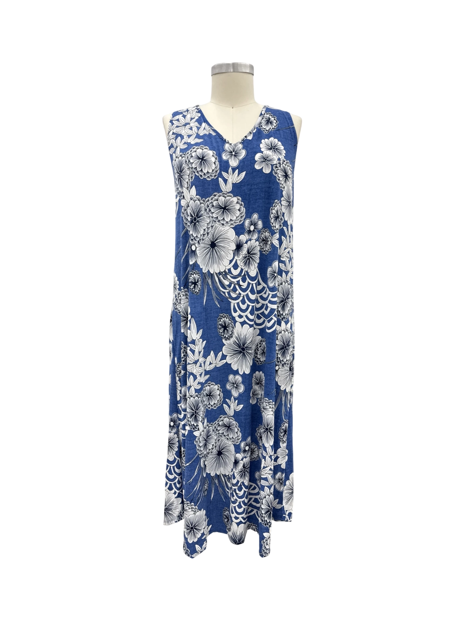 Embrace summer in this beautiful pre-owned SJS floral maxi dress. This casual A-line dress features a flattering V-neck, sleeveless design, and a vibrant blue floral print. Made from a comfortable blend of polyester and spandex, this dress is perfect for warm weather. The maxi skirt length adds an elegant touch, making it ideal for casual outings. Pre-owned dress, in very good condition.