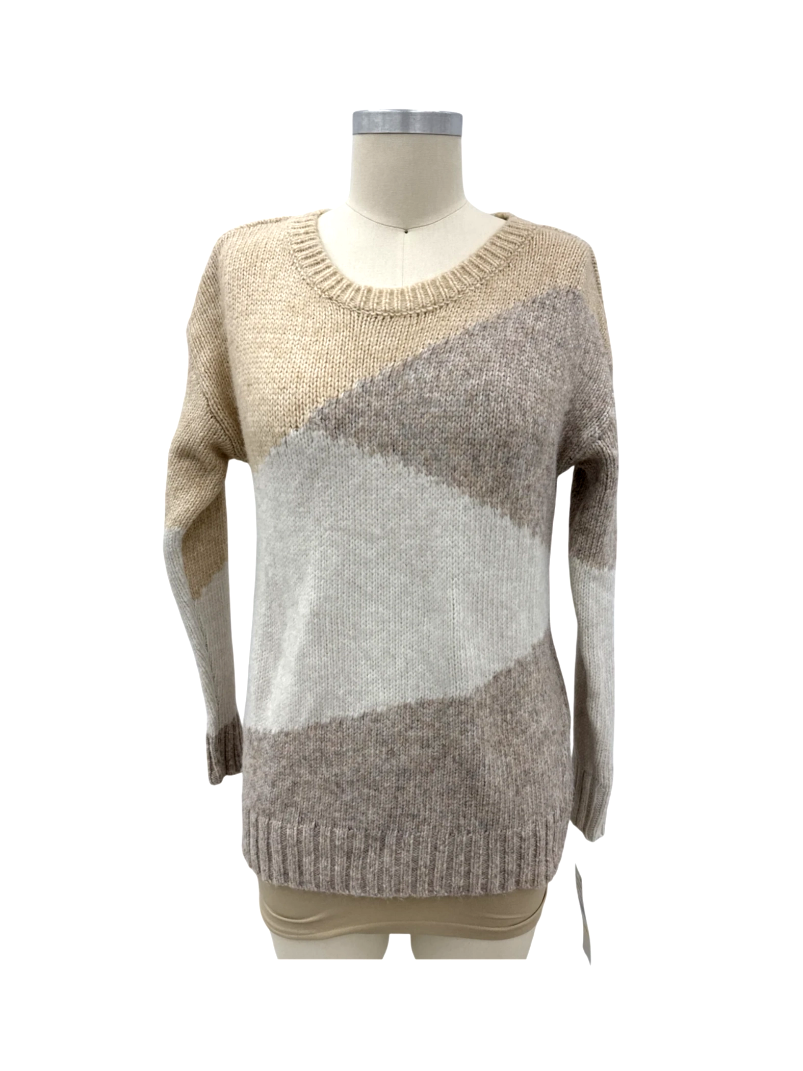 Elevate your knitwear collection with this stylish pre-owned Skye's The Limit sweater. This sweater showcases a chic color block design featuring neutral hues of white and brown. Crafted from a blend of soft and durable materials, it's perfect for chilly days. The classic round neck and pullover style make it a versatile addition to any wardrobe. This pre-loved sweater offers both comfort and style, making it ideal for layering or wearing on its own.