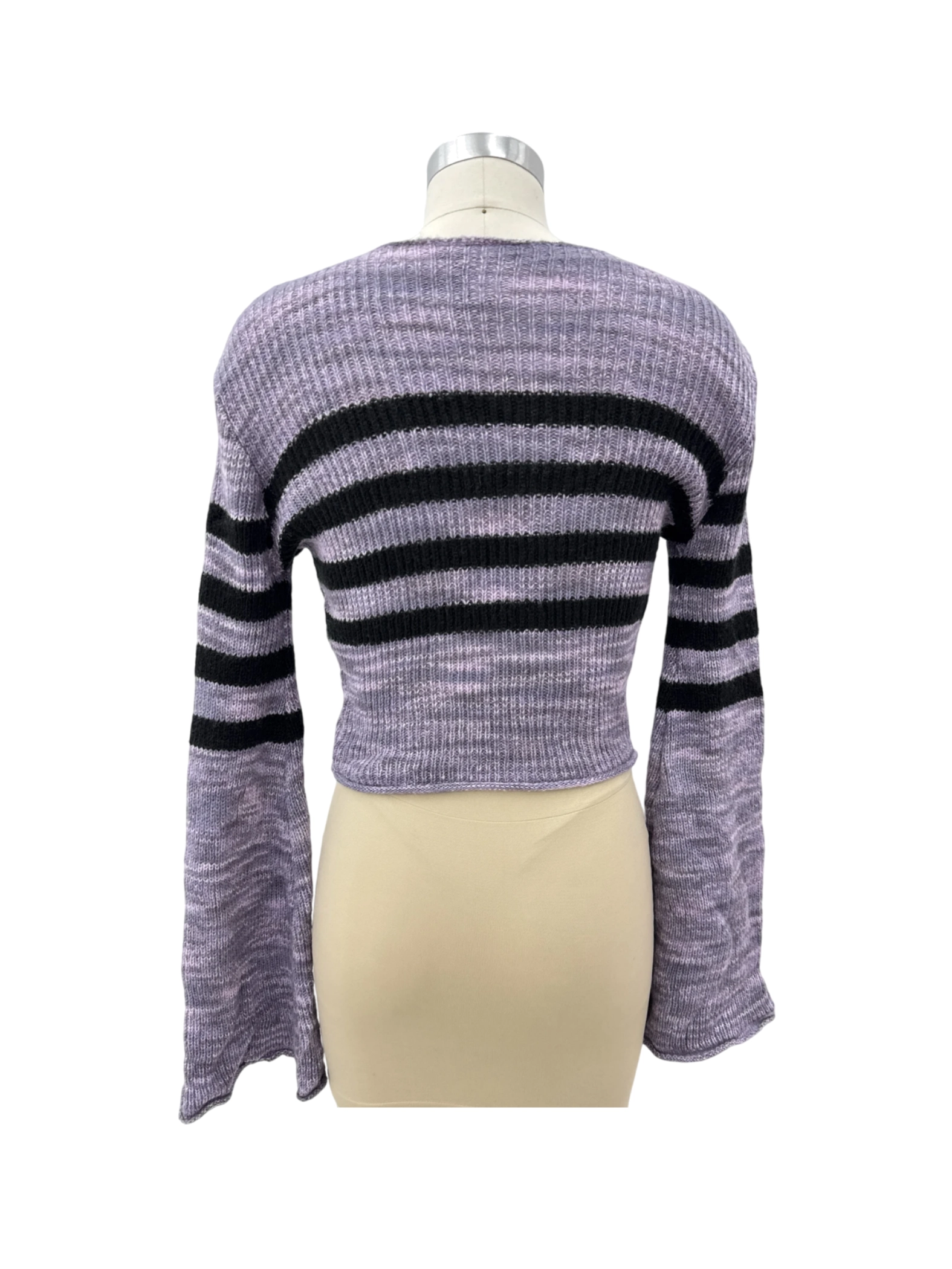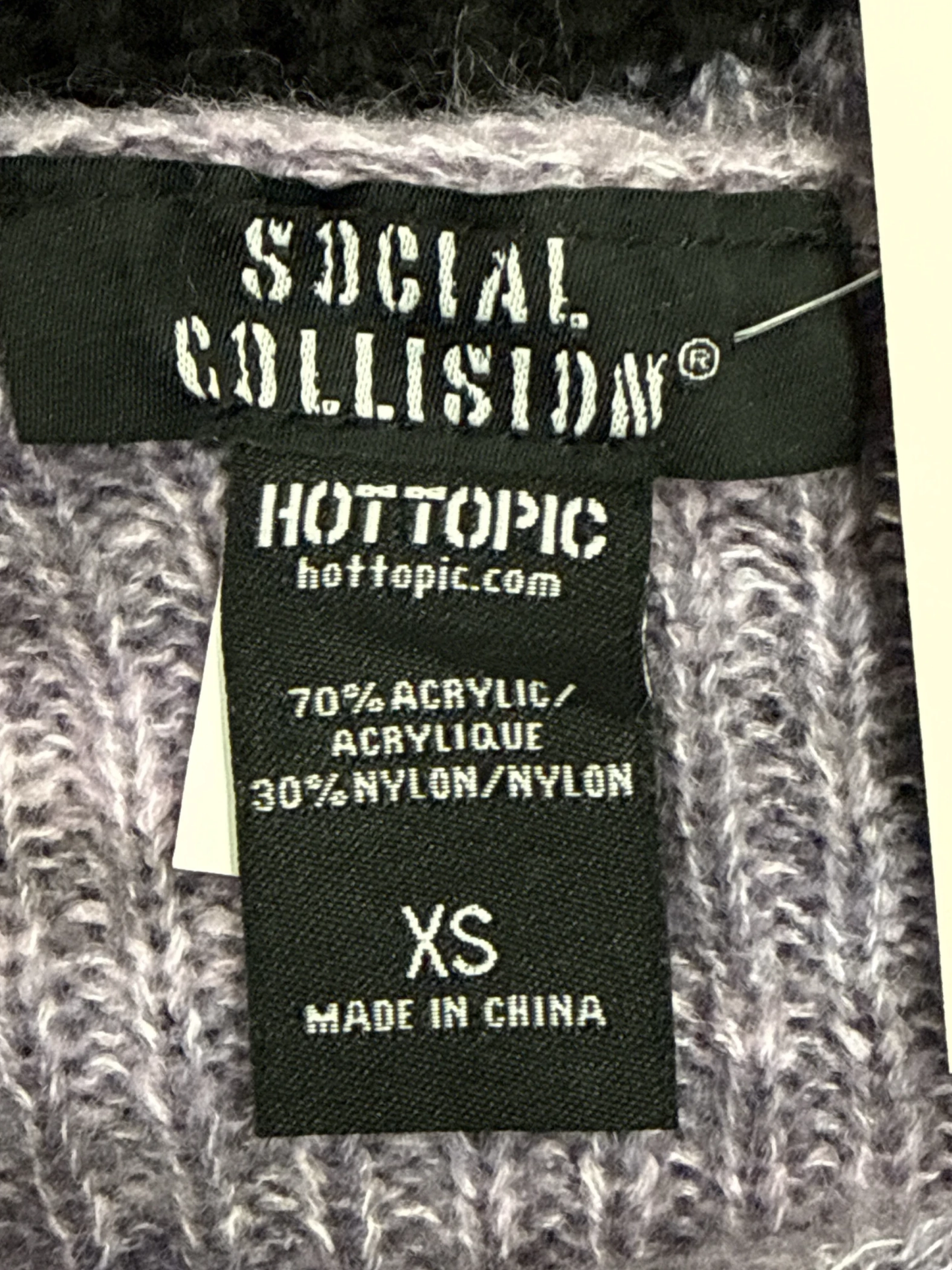 This Social Collision sweater, previously loved, is a stylish addition to any wardrobe. Featuring a unique purple and black stripe design, this sweater offers a flattering fit and a comfortable feel with its acrylic and nylon blend. Perfect for layering during cooler seasons, this versatile piece adds a pop of color to your outfits. It's a great choice for casual wear. This item is a XS.