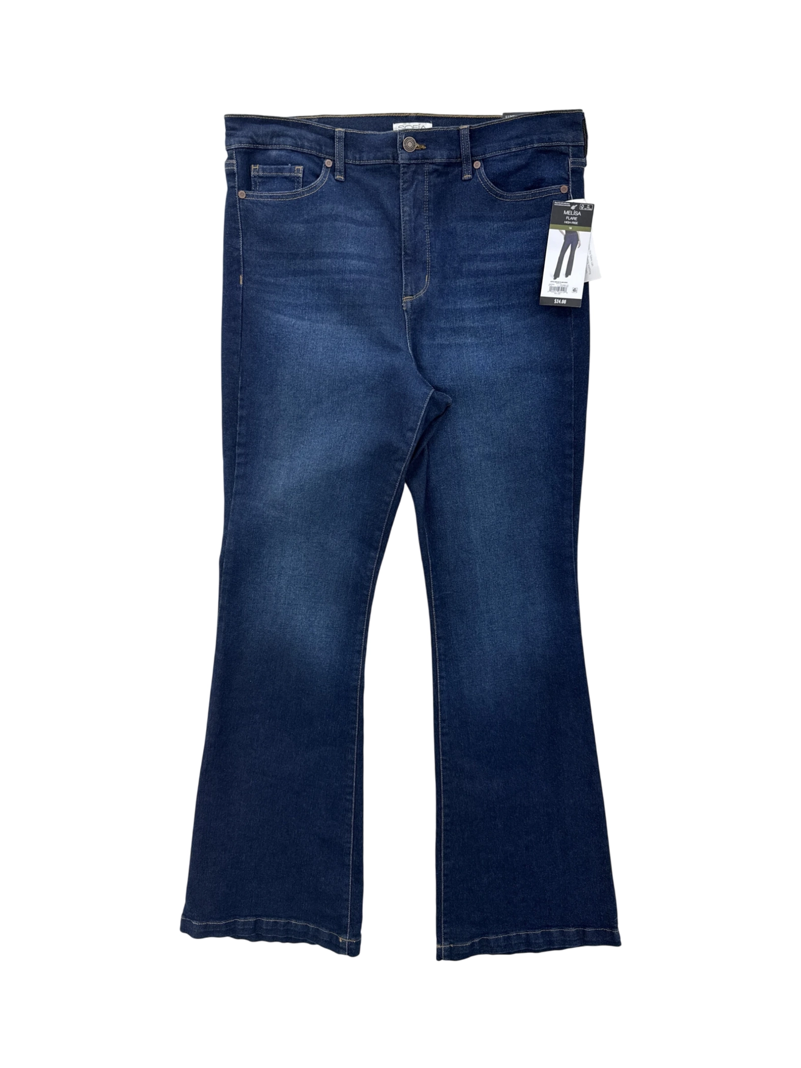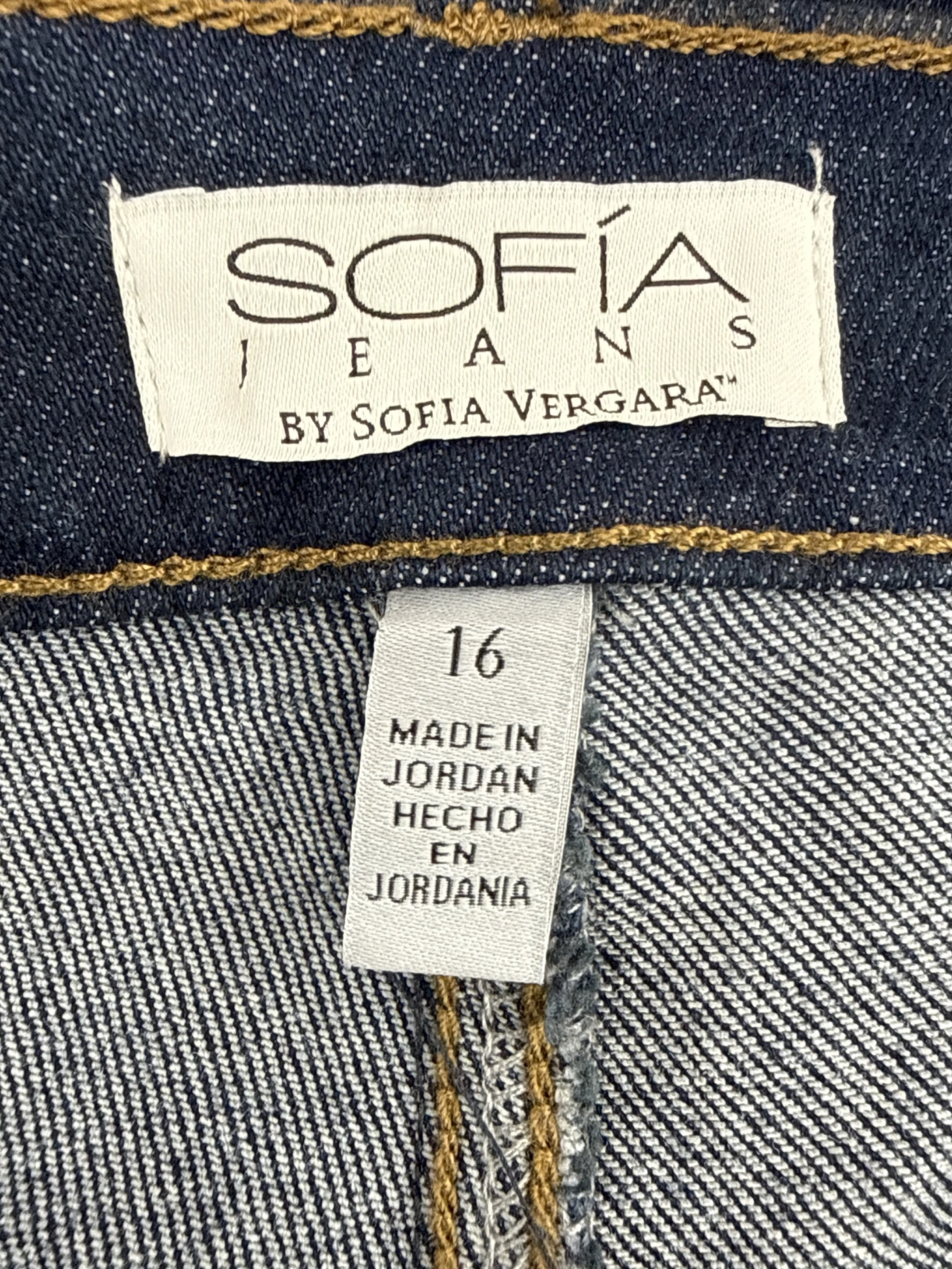 These pre-owned SOFIA JEANS by SOFIA VERGARA flared jeans in a dark denim wash offer a stylish and flattering fit. Crafted from a comfortable cotton blend with a touch of spandex, these jeans are perfect for any season. The high-waisted design enhances your silhouette, while the flared cut adds a touch of retro flair. Available in size 16, they provide a comfortable and chic option for your everyday wardrobe. Made in Jordan.