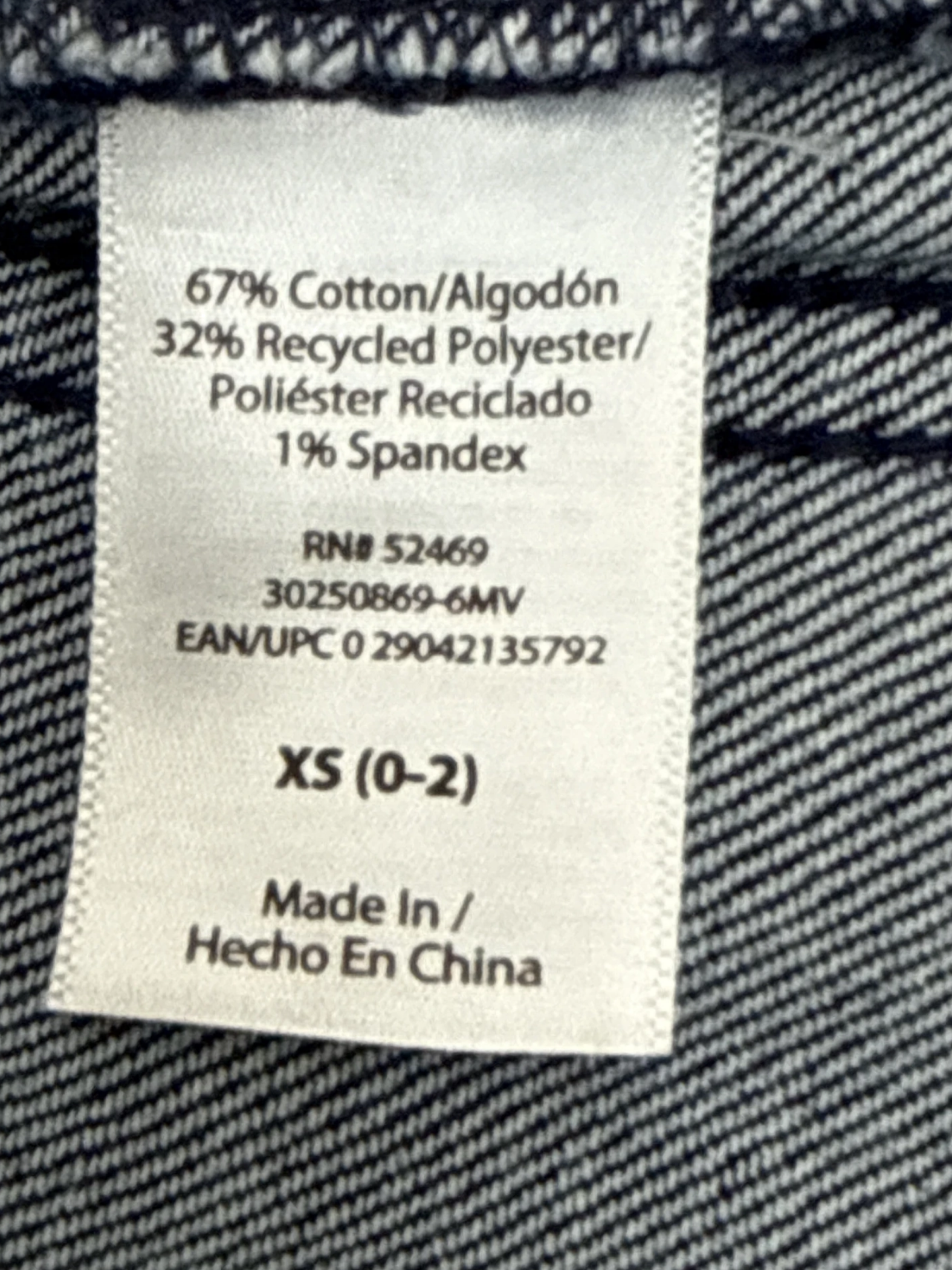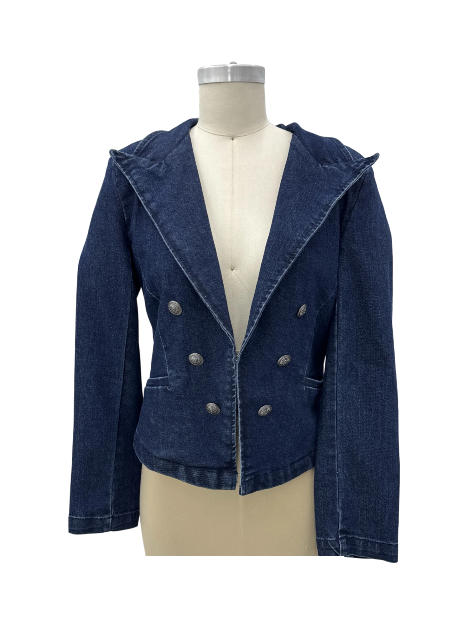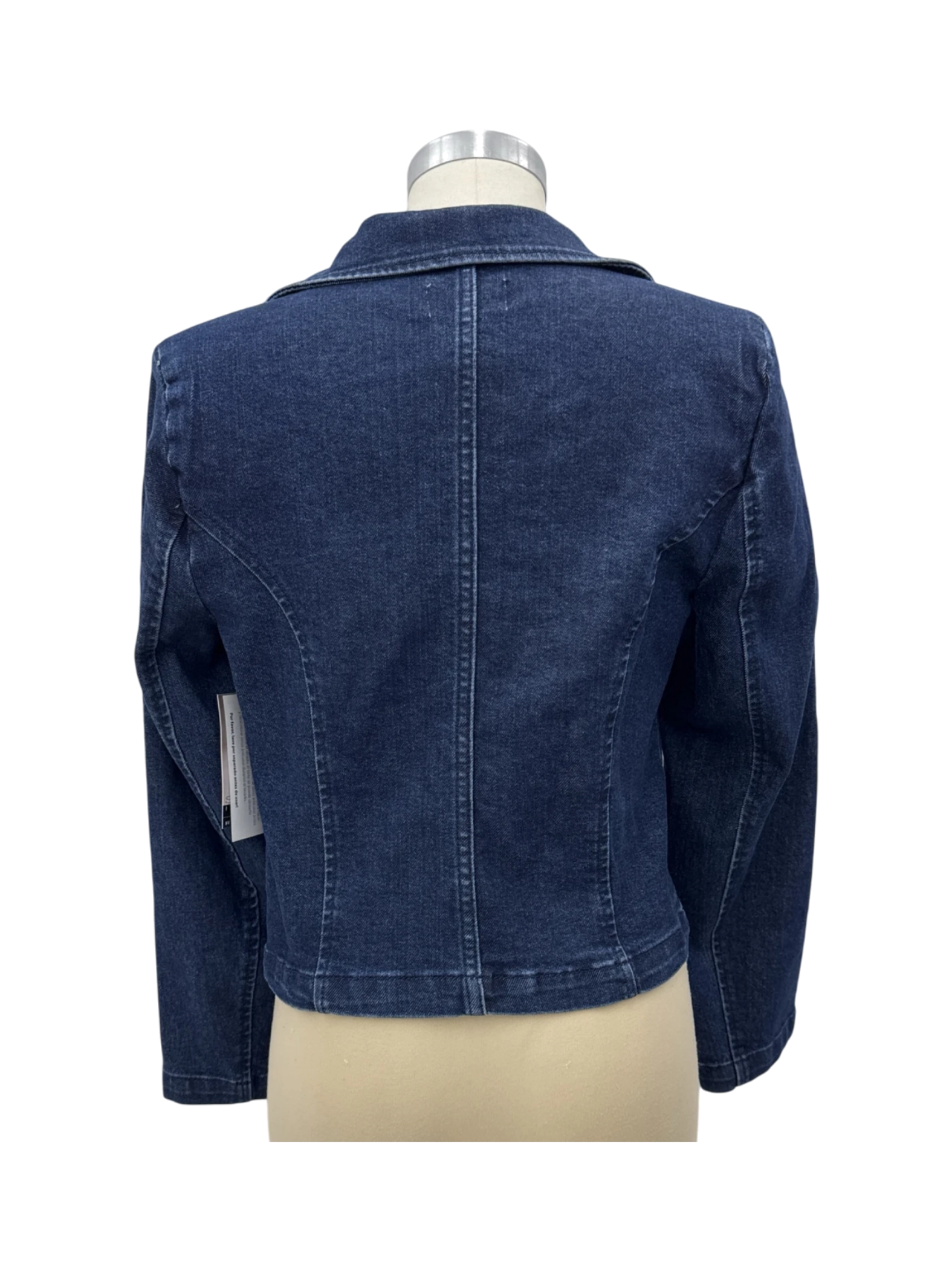 This stylish pre-owned Sofia Vergara denim jacket is a must-have for your wardrobe. It features a classic blazer design, perfect for layering and adding a touch of sophistication to any outfit. Made from a durable blend of cotton, recycled polyester and spandex for stretch and comfort. The dark blue denim color is versatile and easy to match. This jacket is perfect for spring or fall weather.