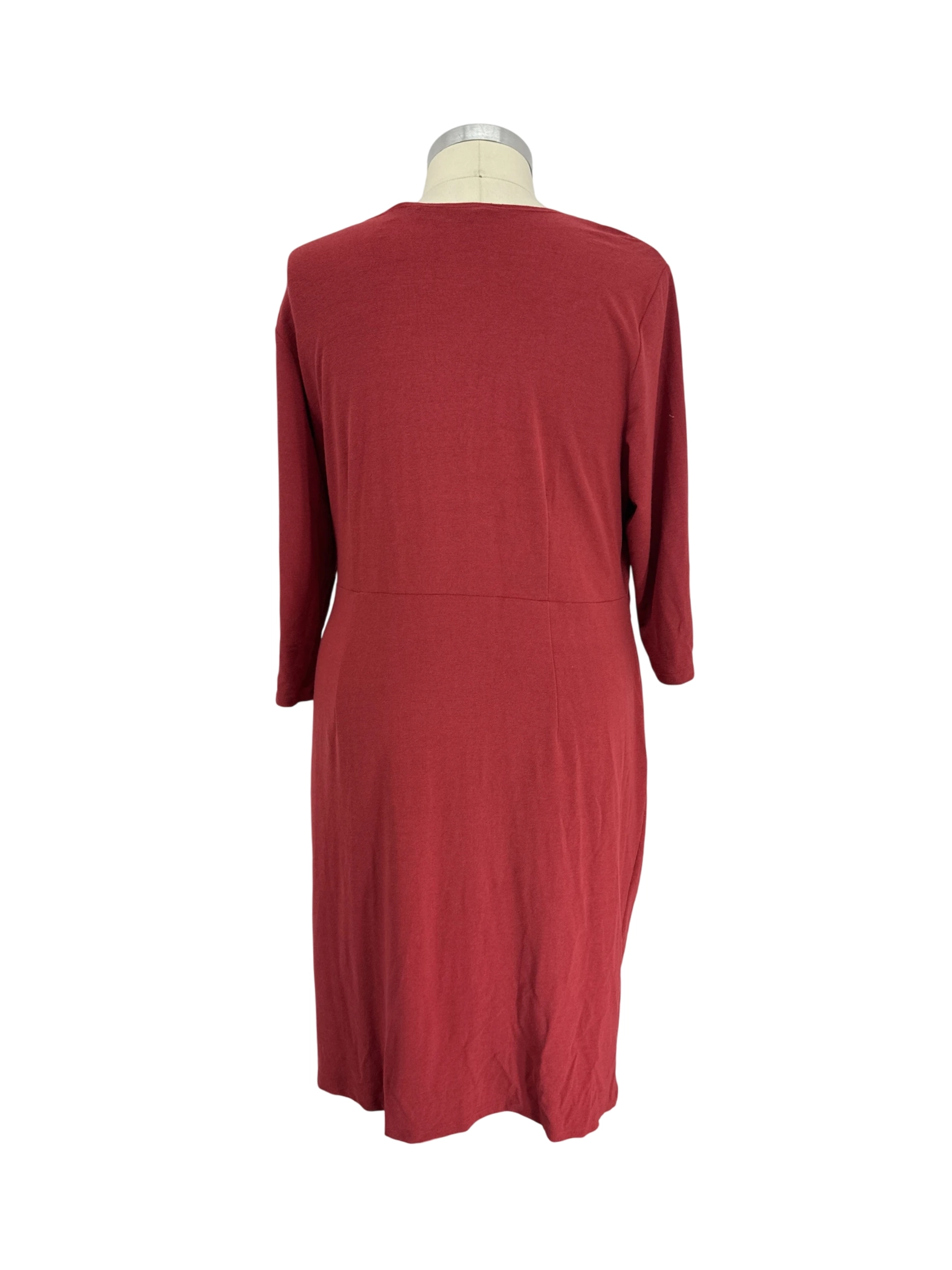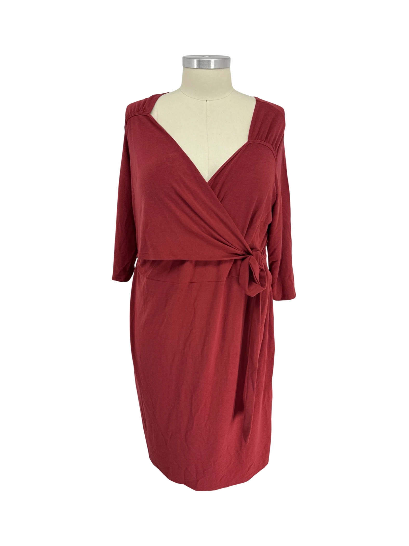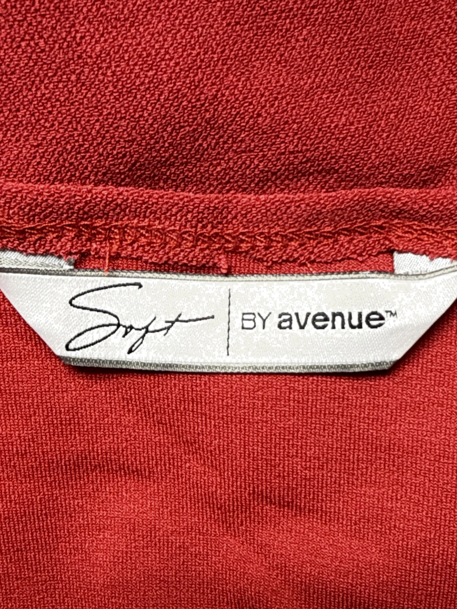 This pre-owned Soft by Avenue wrap dress is perfect for a casual yet stylish look. It features a flattering A-line silhouette and a mid-sleeve length. The dress is made from a comfortable blend of rayon, polyester, and spandex. Its deep red hue makes it a versatile piece for fall. Available in sizes 22/24 (2XL/3XL).