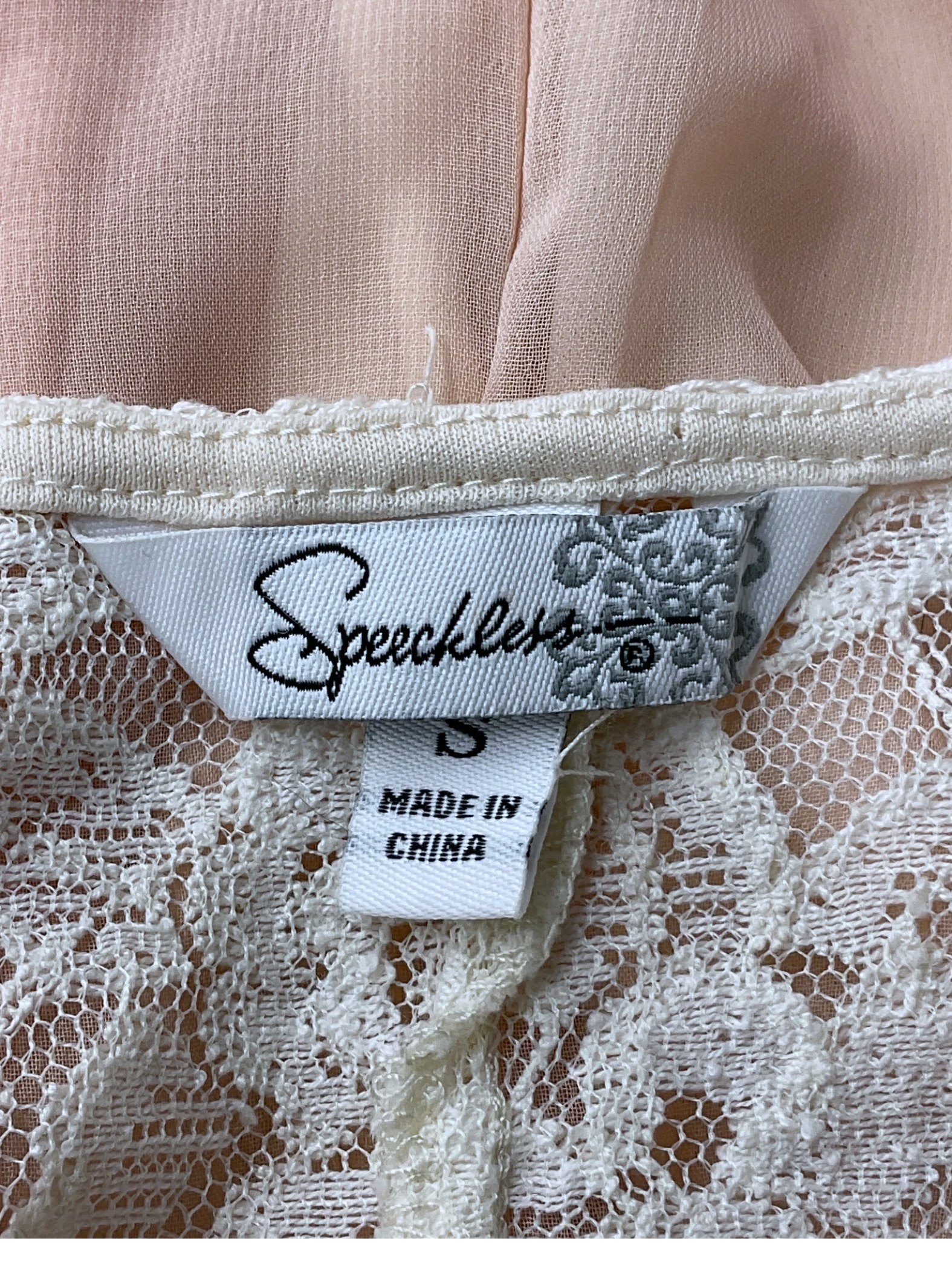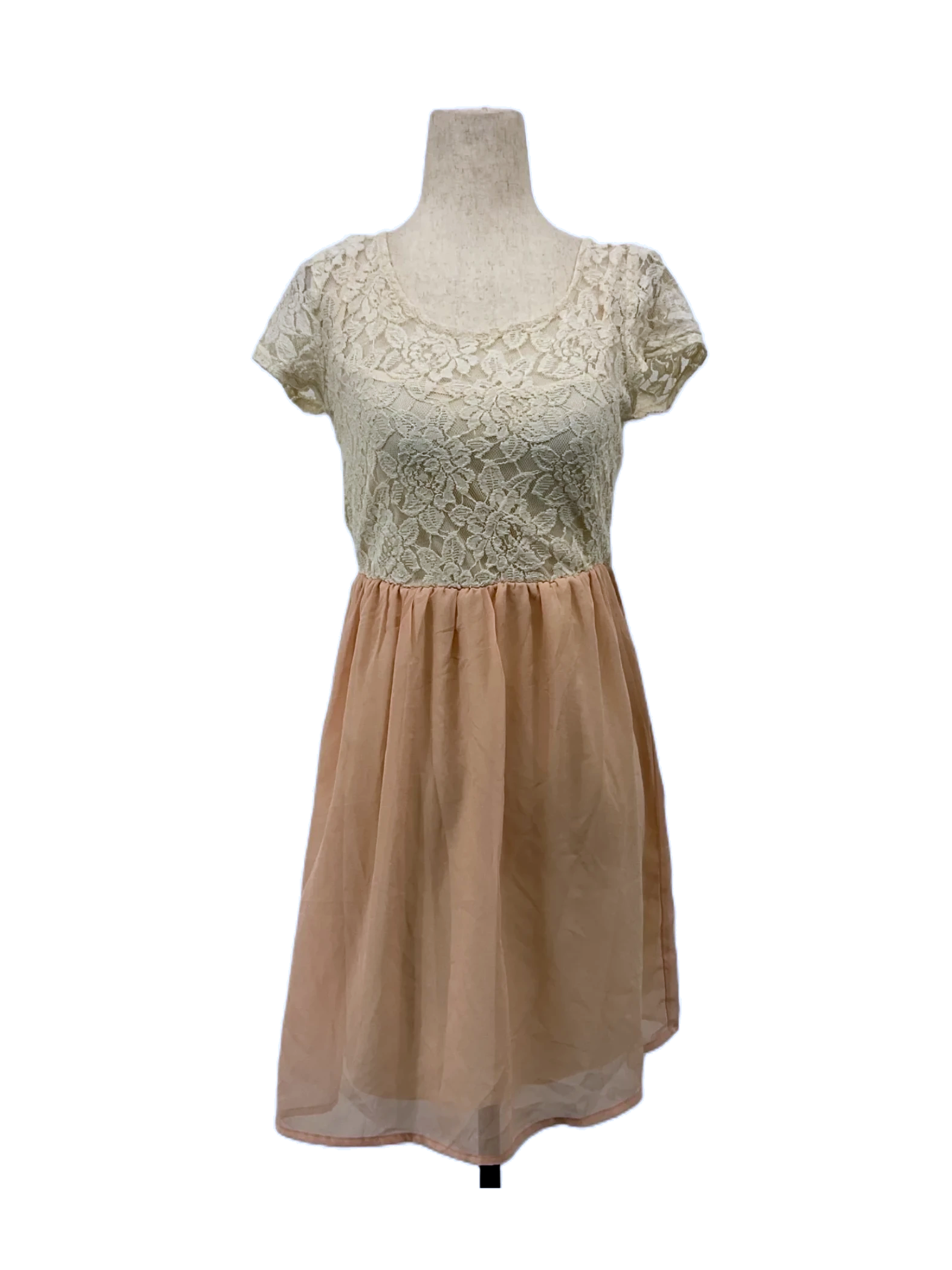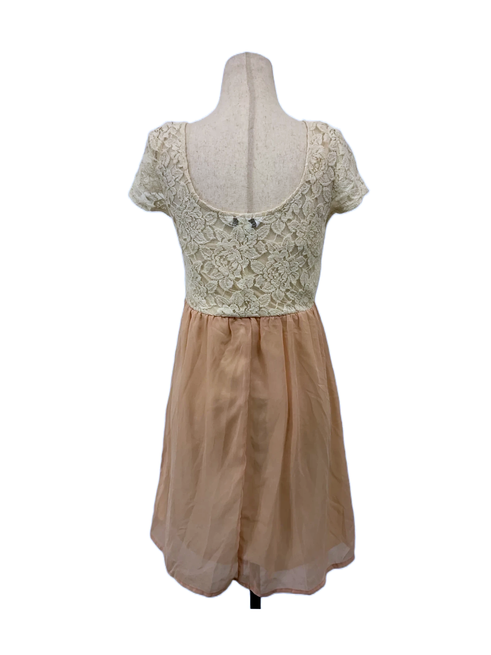 Women's short sleeve dress with a blush lace bodice and a full fit, size small.
