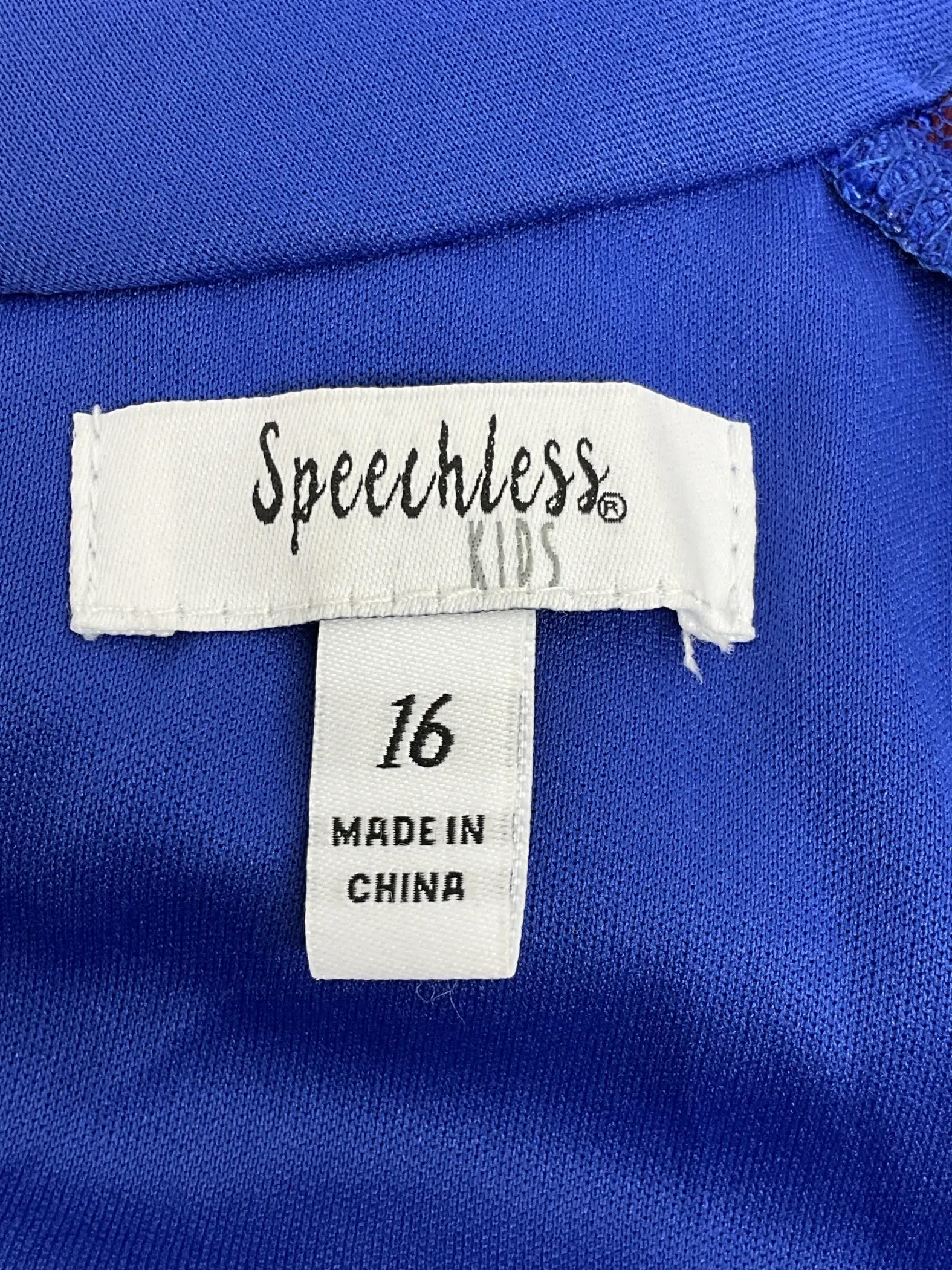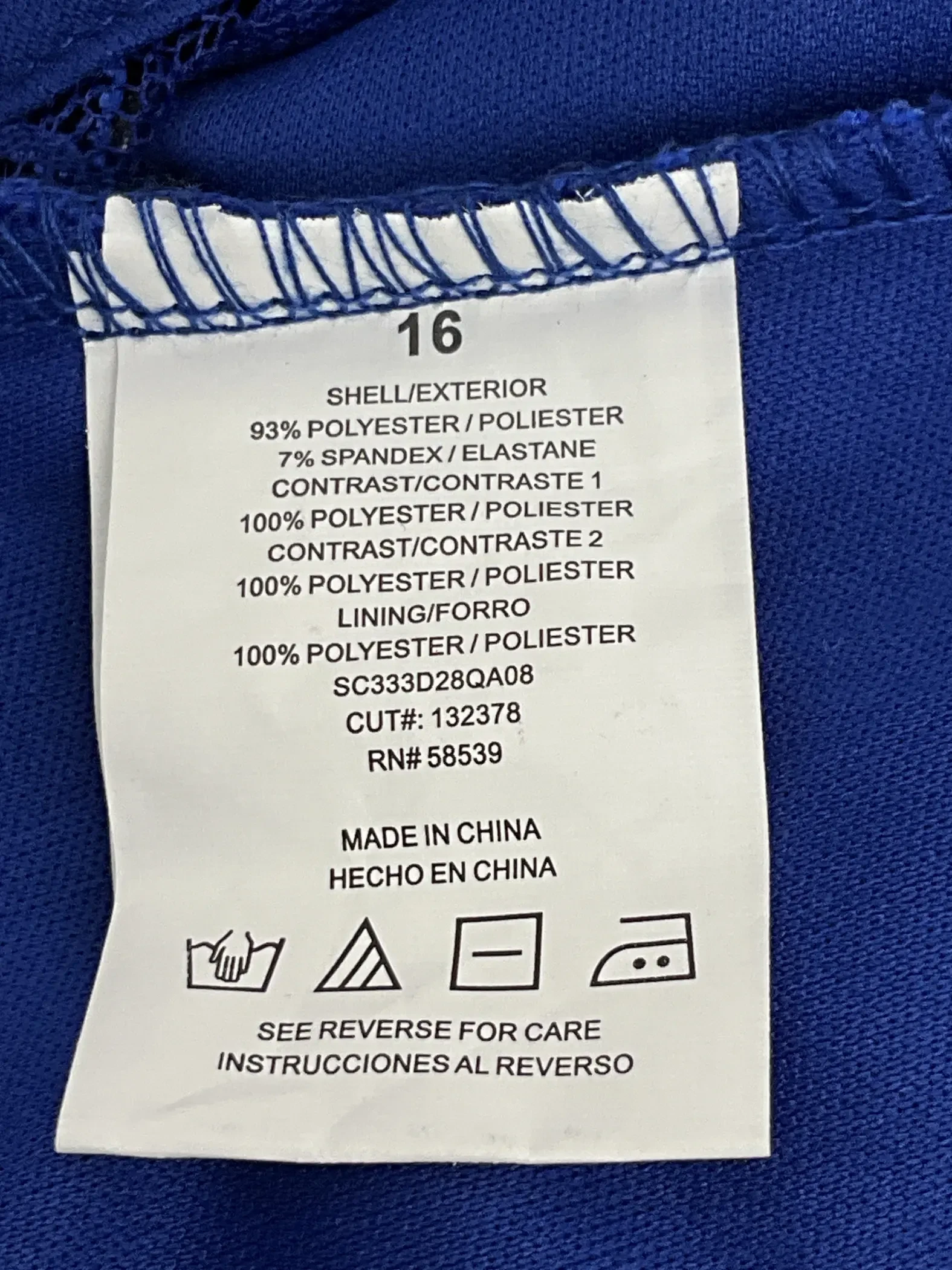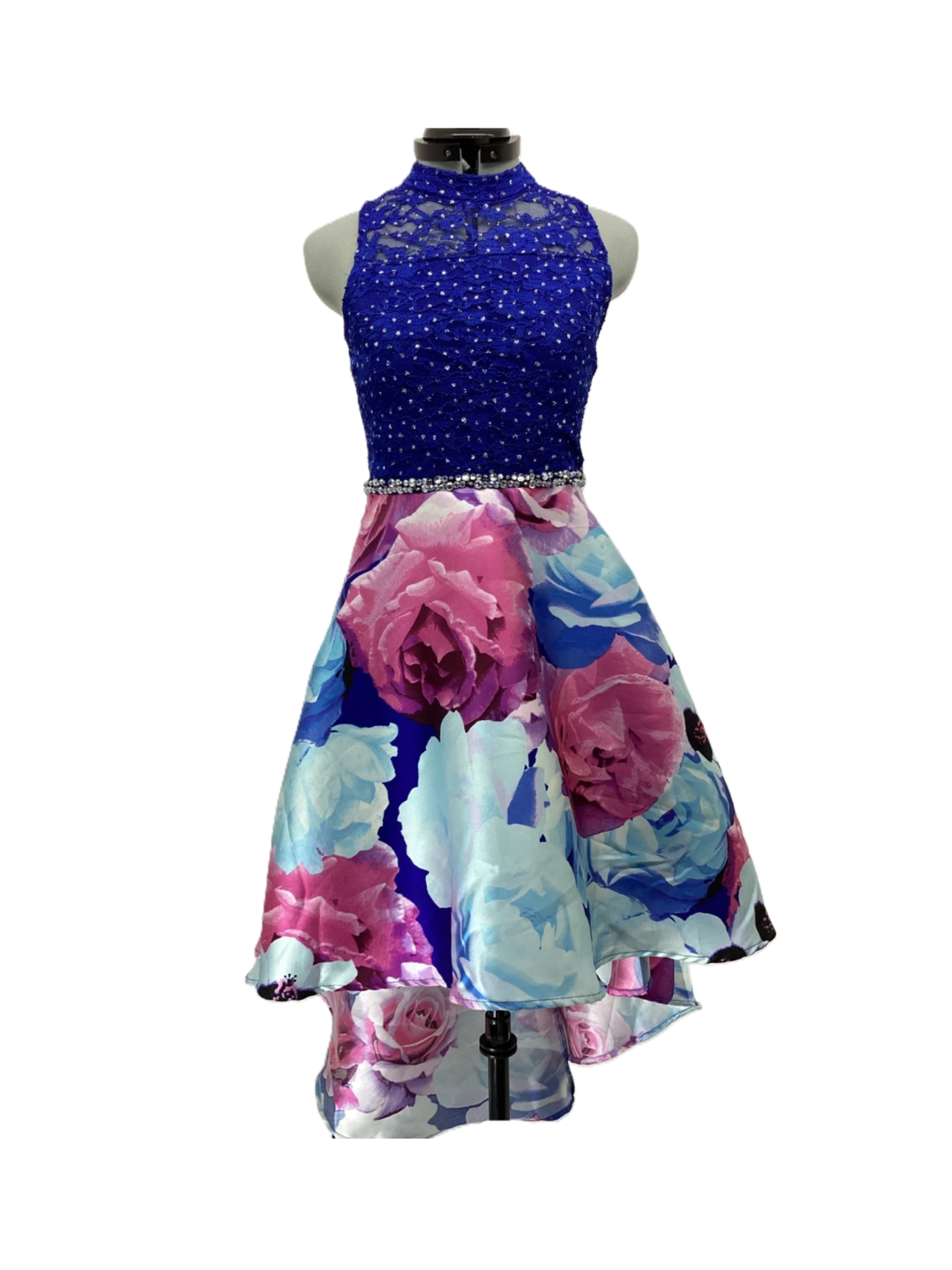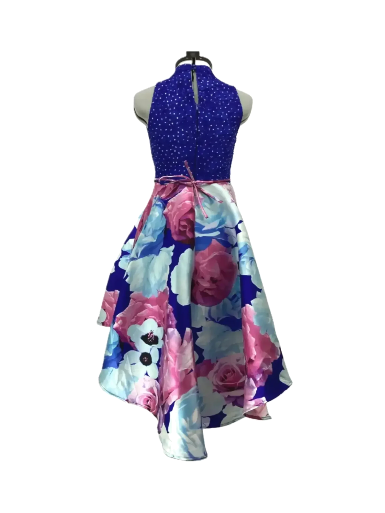 The dress is a size 16 for girls in pink and blue with a floral design. Made: Polyester and Spandex.