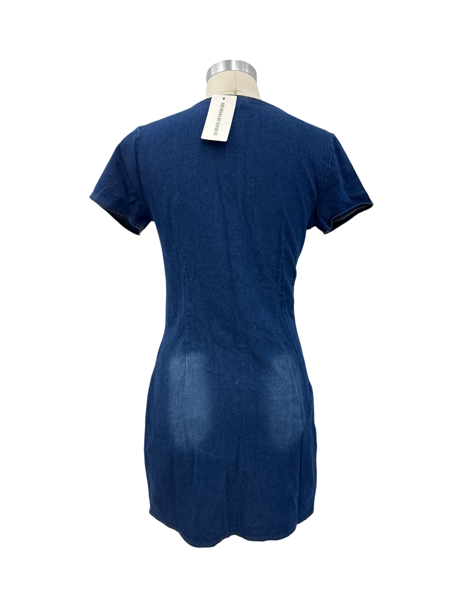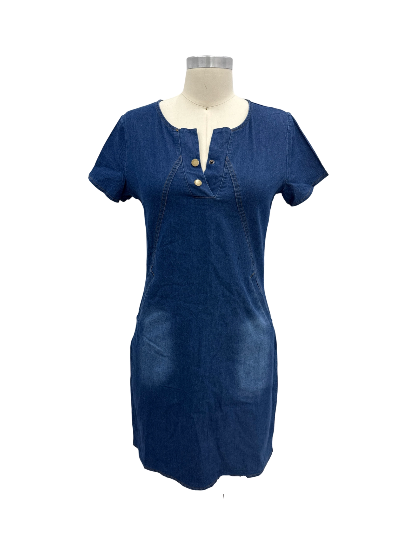 This stylish, pre-owned SSKNKN denim dress is perfect for a casual summer look. The dress features a classic A-line silhouette, short sleeves, and a flattering V-neckline. Made from durable denim, it offers both comfort and style. Whether you're heading out for a day of errands or meeting friends, this dress is a versatile addition to any wardrobe. A great find for anyone looking for a quality, sustainable fashion choice.