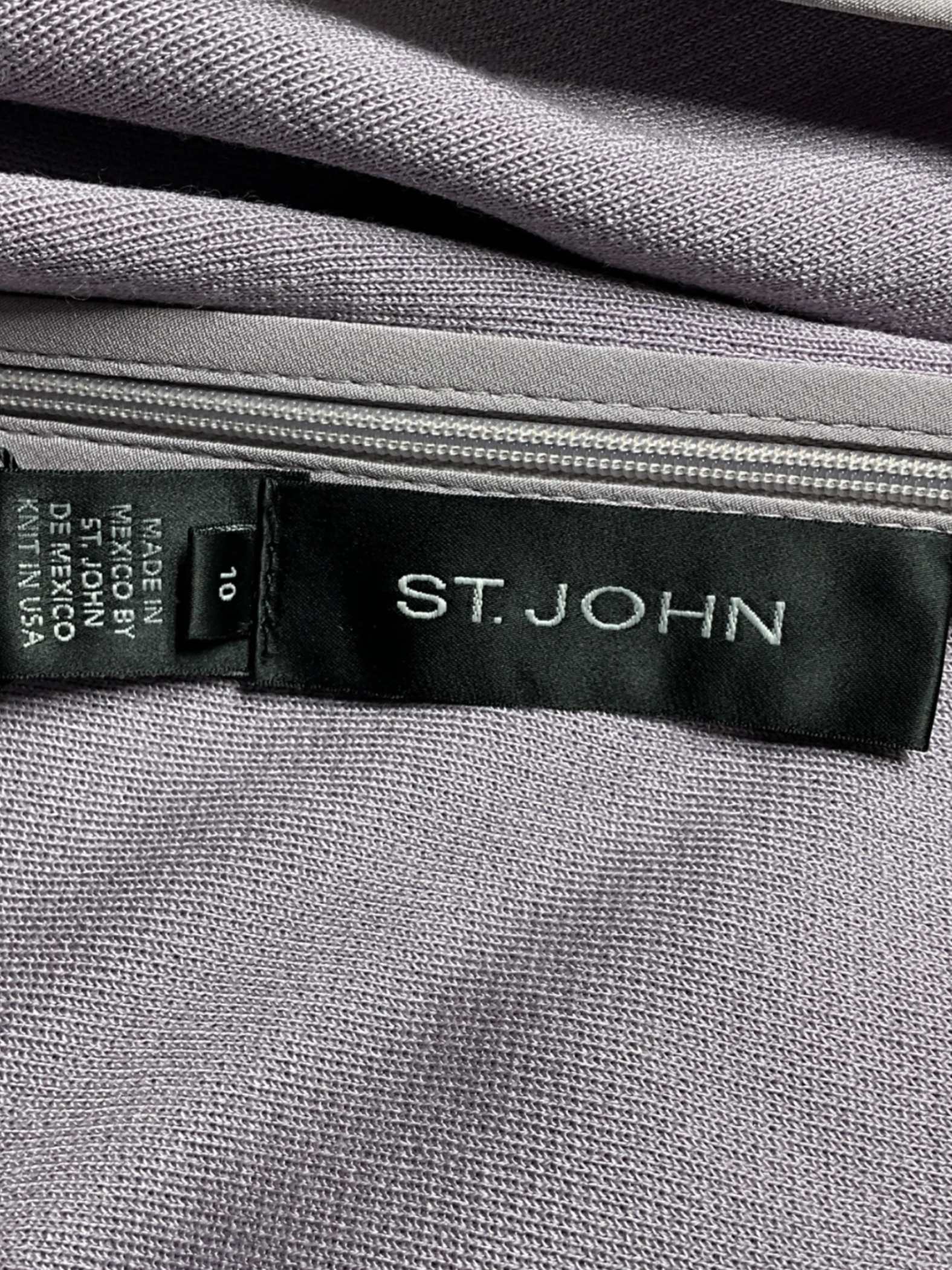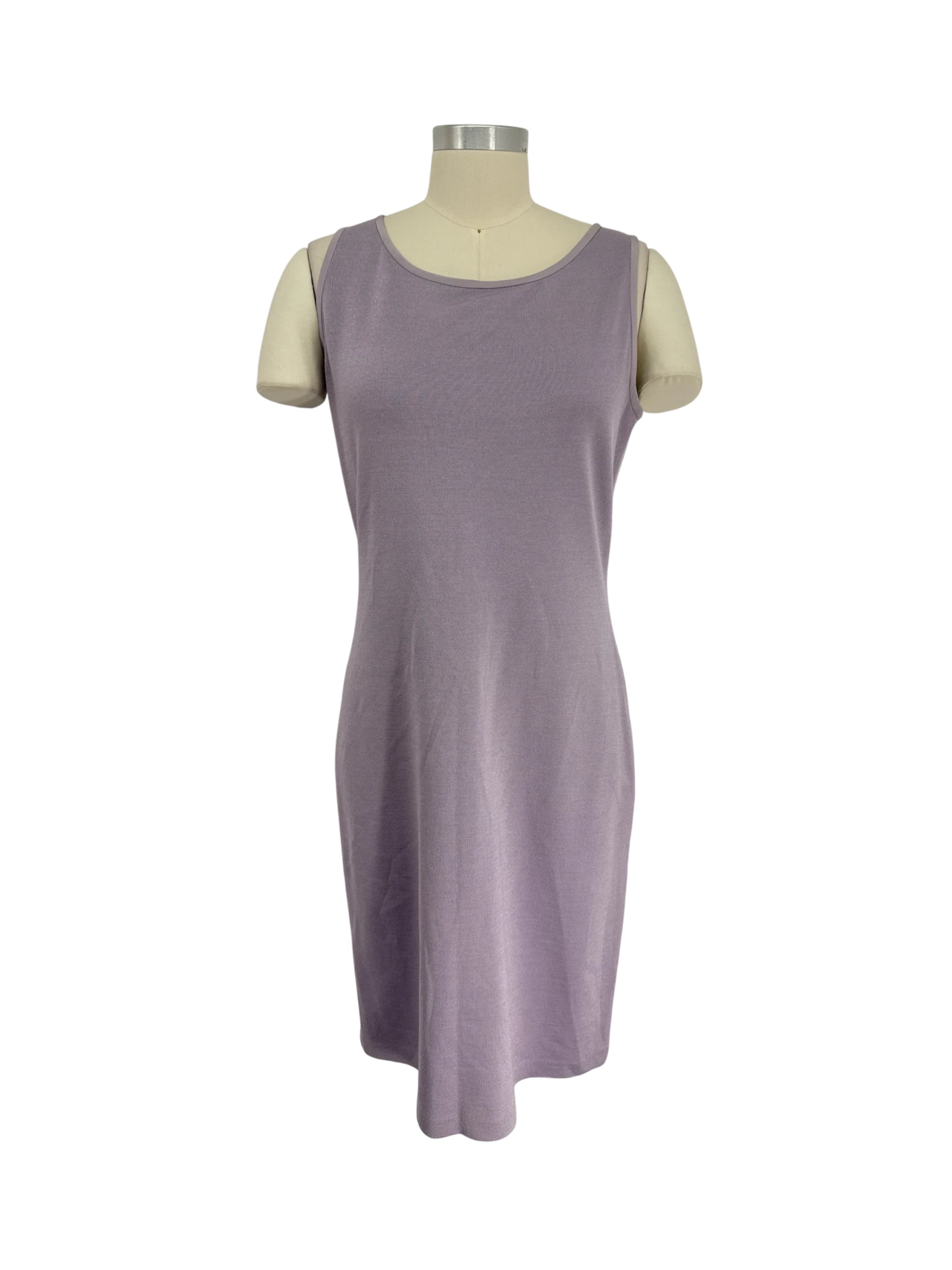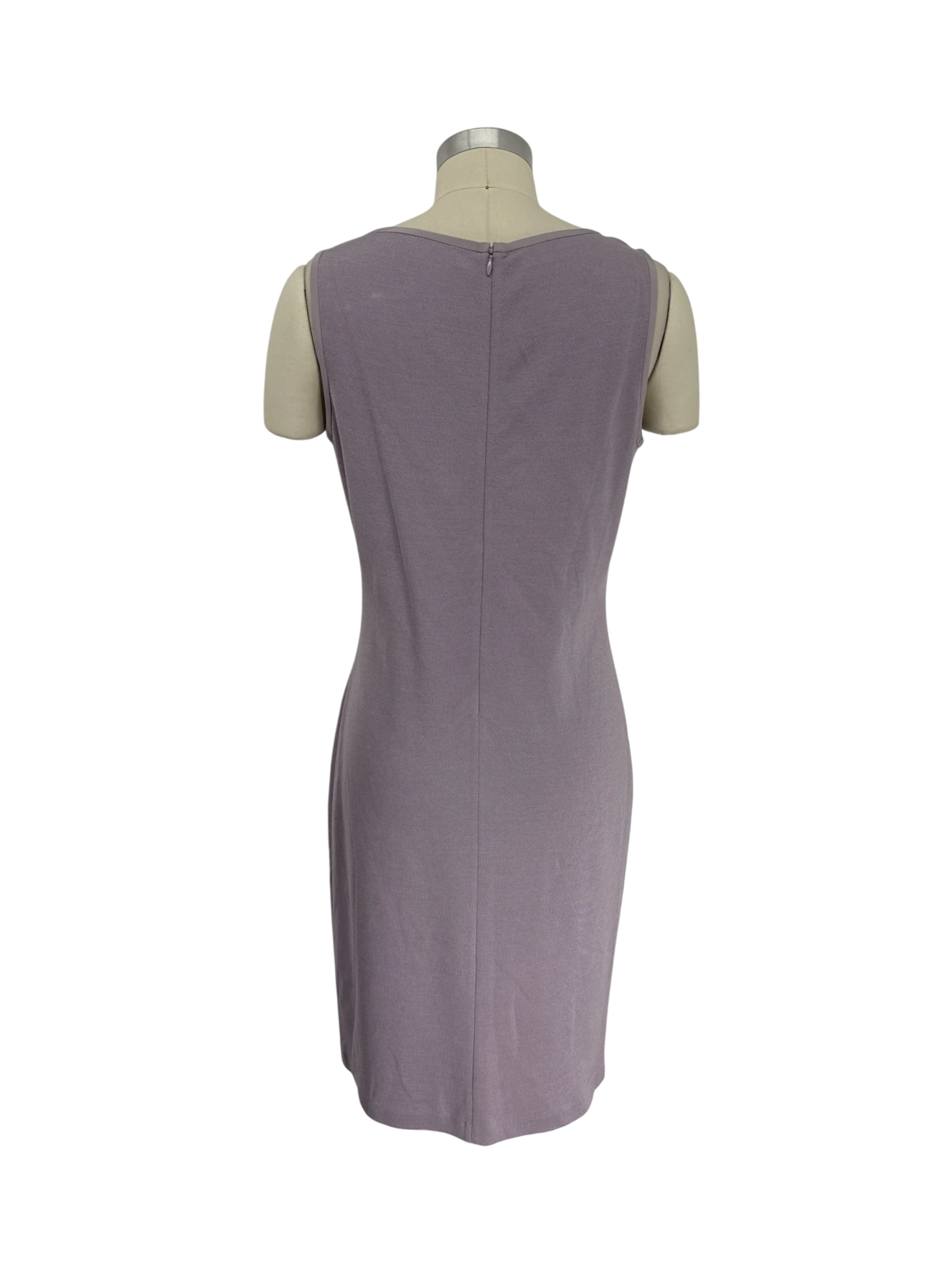 A classic and sophisticated pre-owned St. John sheath dress in a beautiful purple hue. This sleeveless dress features a flattering sheath silhouette and a simple round neckline. Crafted from a luxurious wool and rayon blend, it offers both comfort and style. Perfect for warm weather, this dress is ideal for casual outings. It is in great condition and ready to elevate your wardrobe.