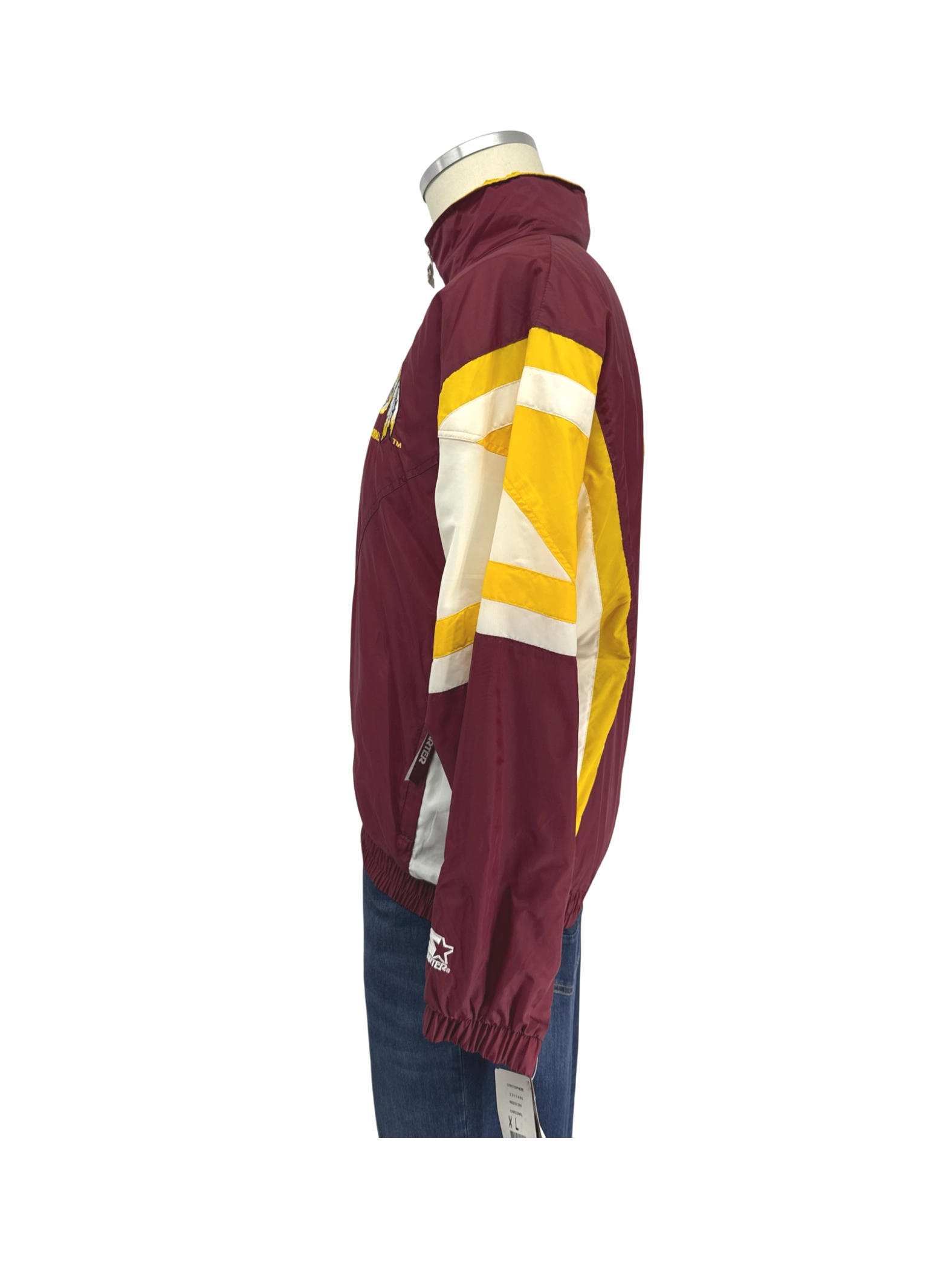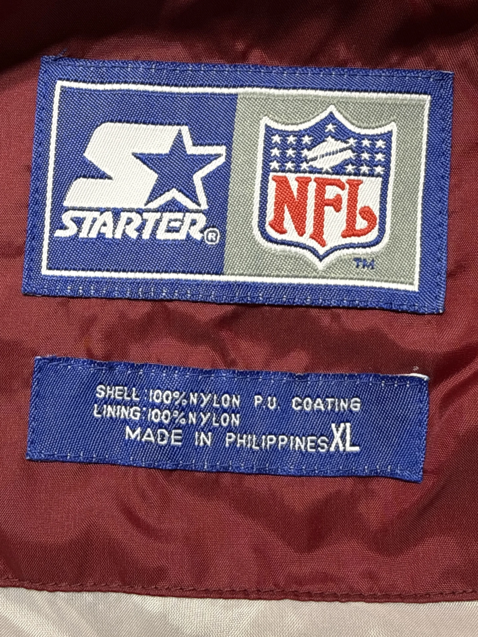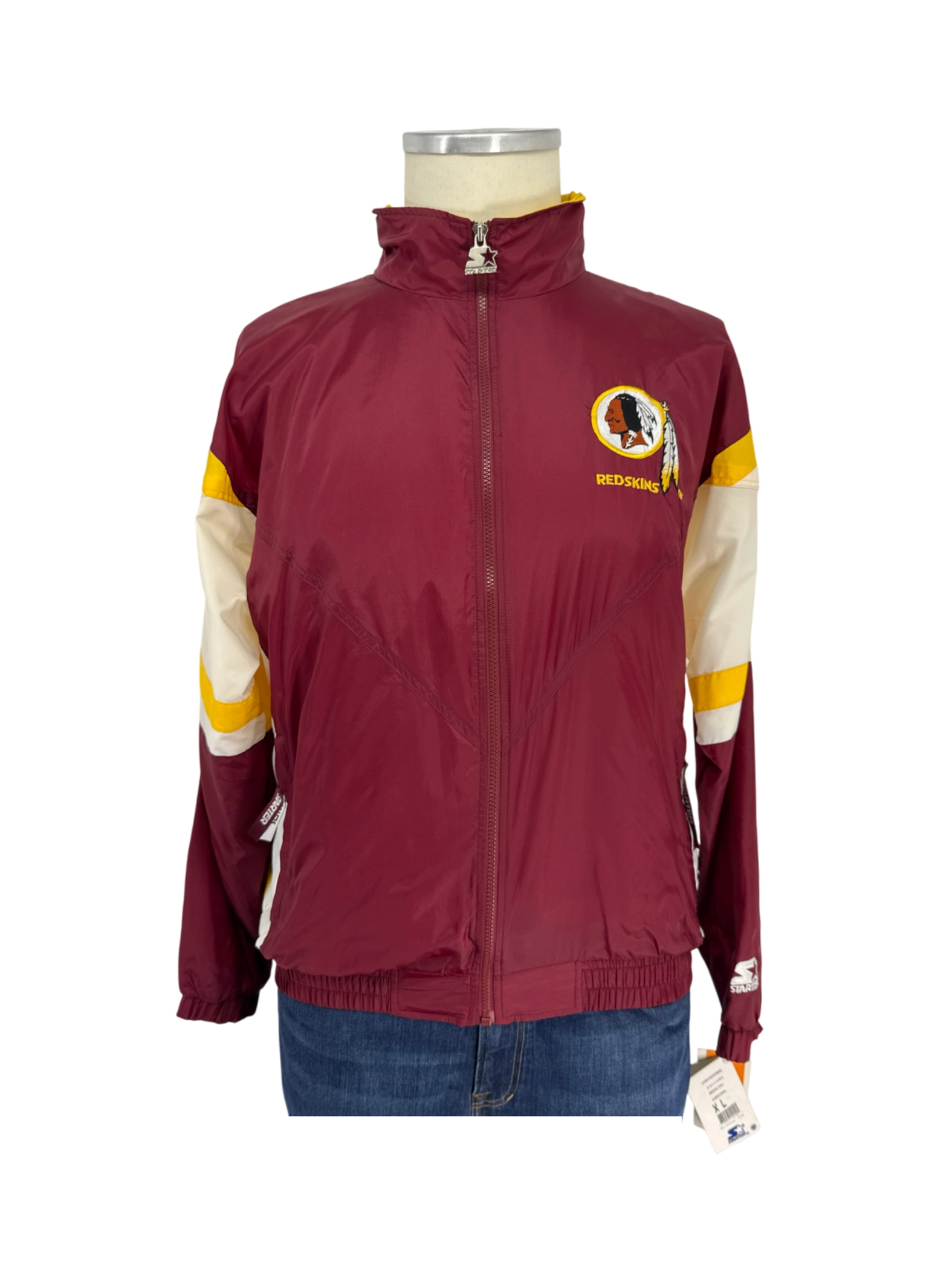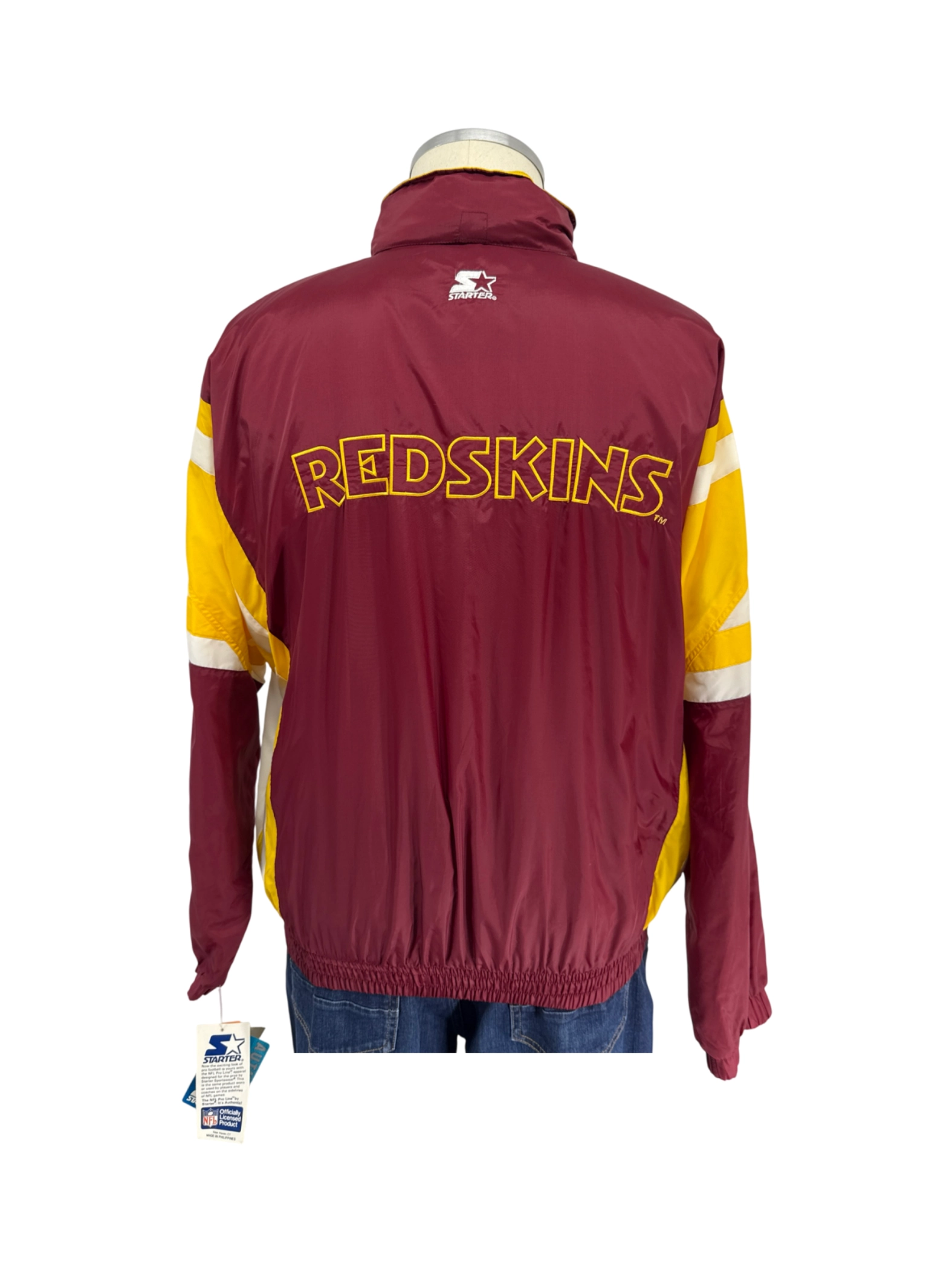 This vintage Starter jacket is a must-have for any Washington Redskins fan! Featuring the team's colors and logo, this jacket is perfect for showing off your team spirit. This jacket is a classic piece of sports apparel. The jacket is made from durable nylon and is in excellent condition. It's a great way to represent your favorite team in style.