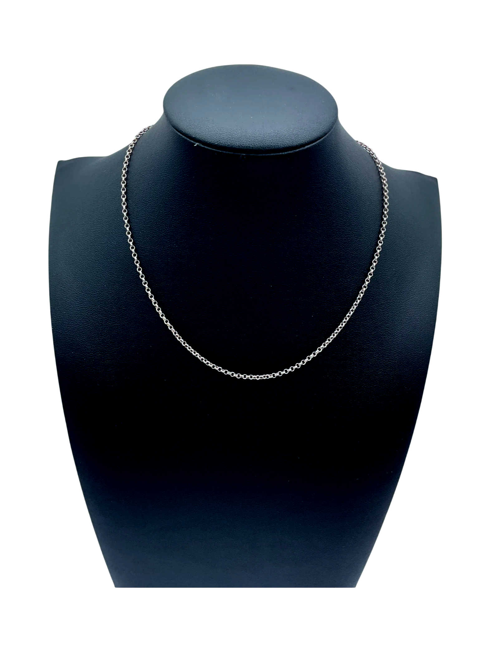 The necklace is a fine and delicate chain with small, round links that create a continuous loop.