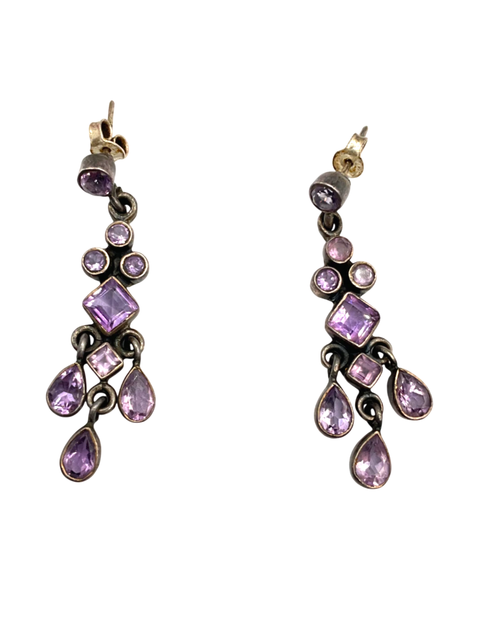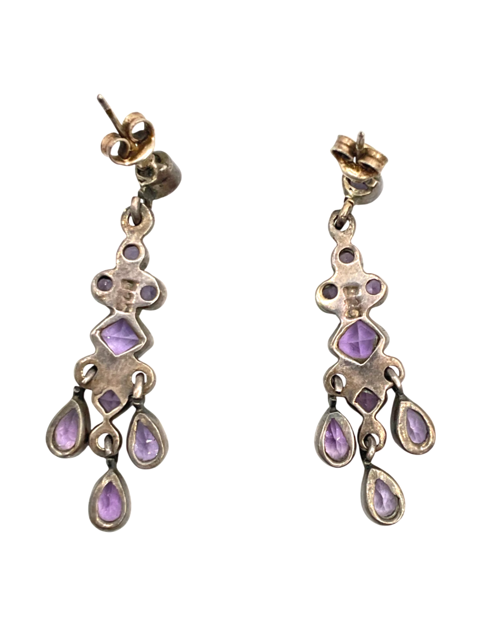 These earrings are made of sterling silver and have purple stones.